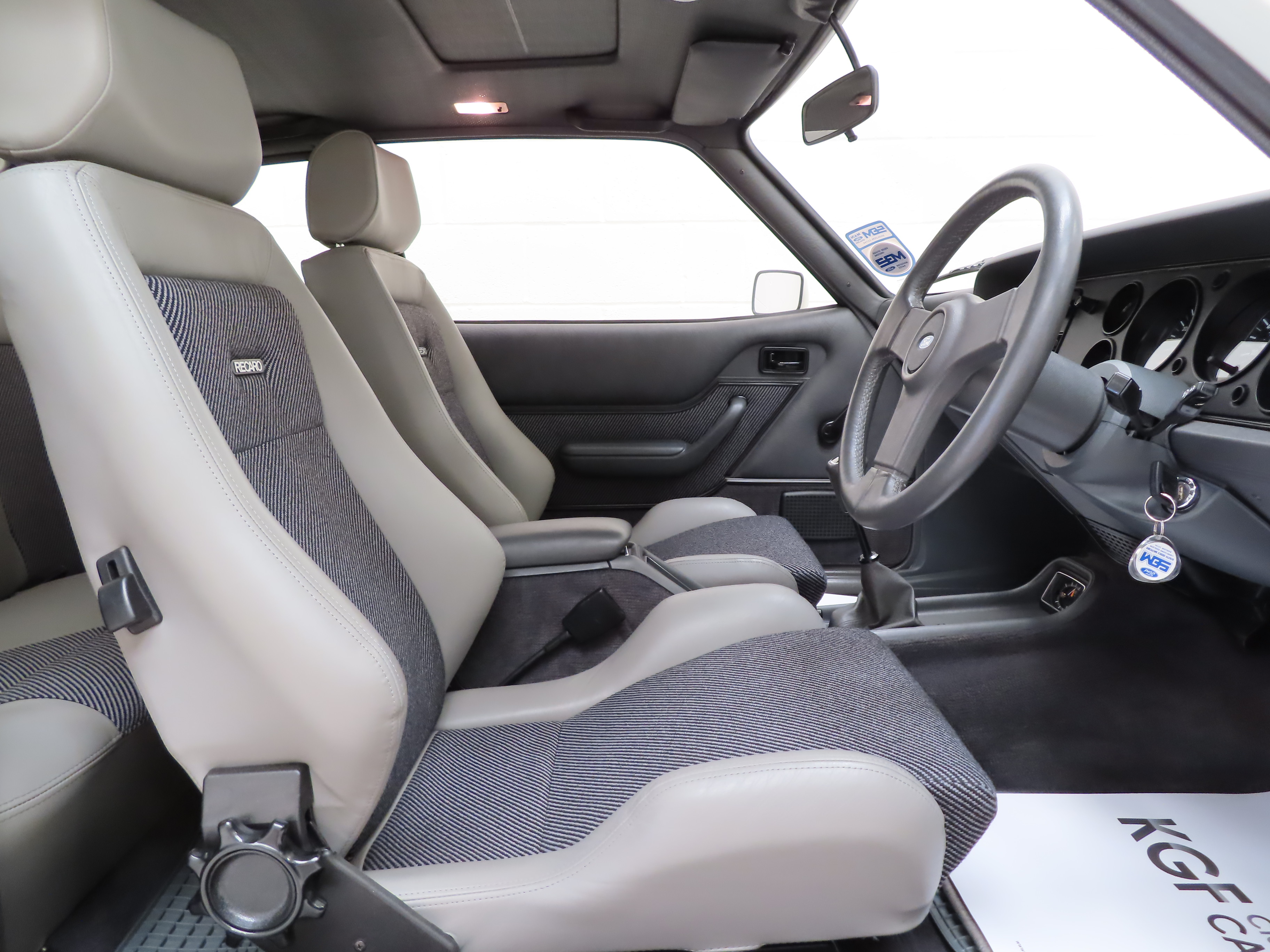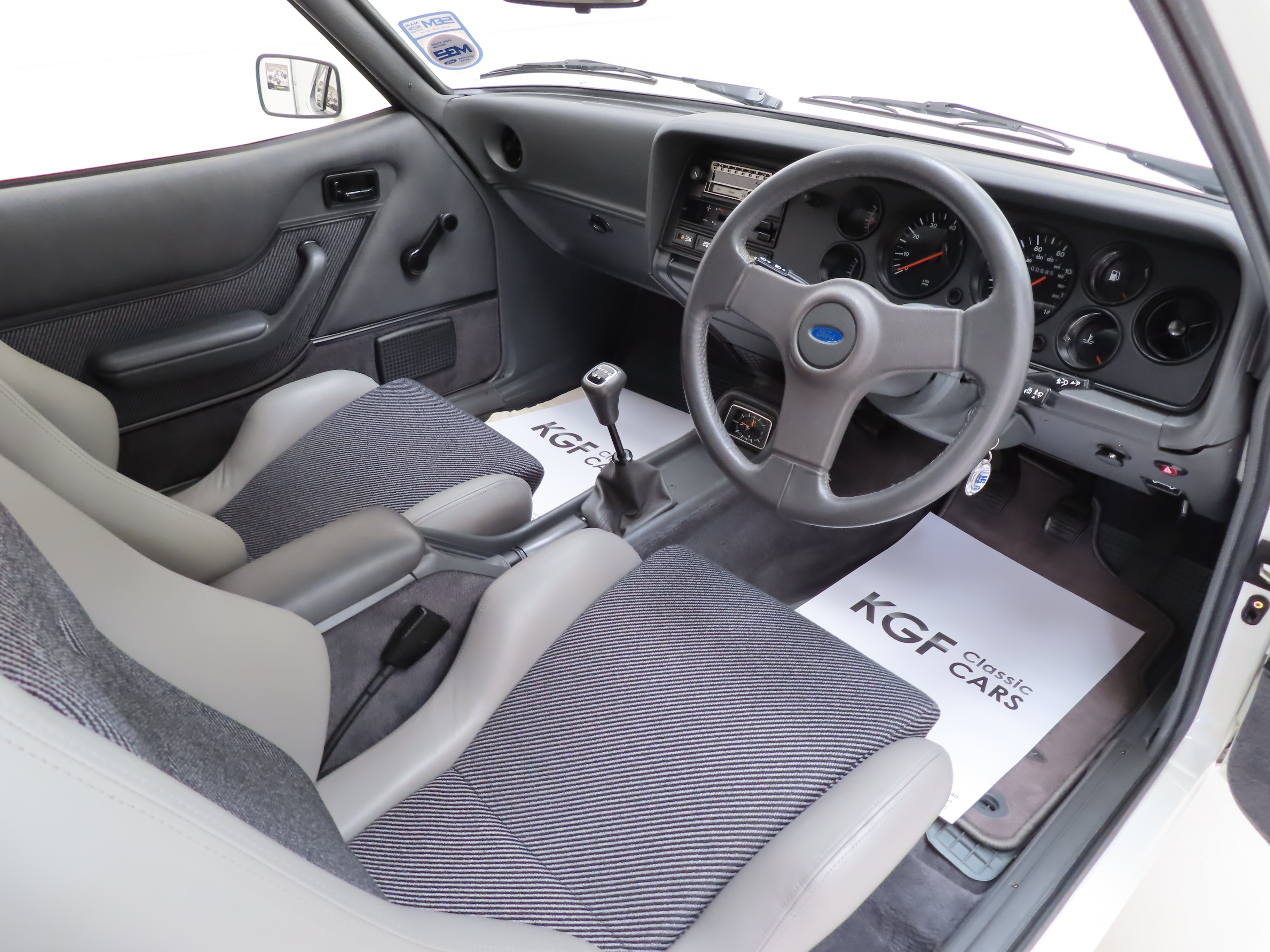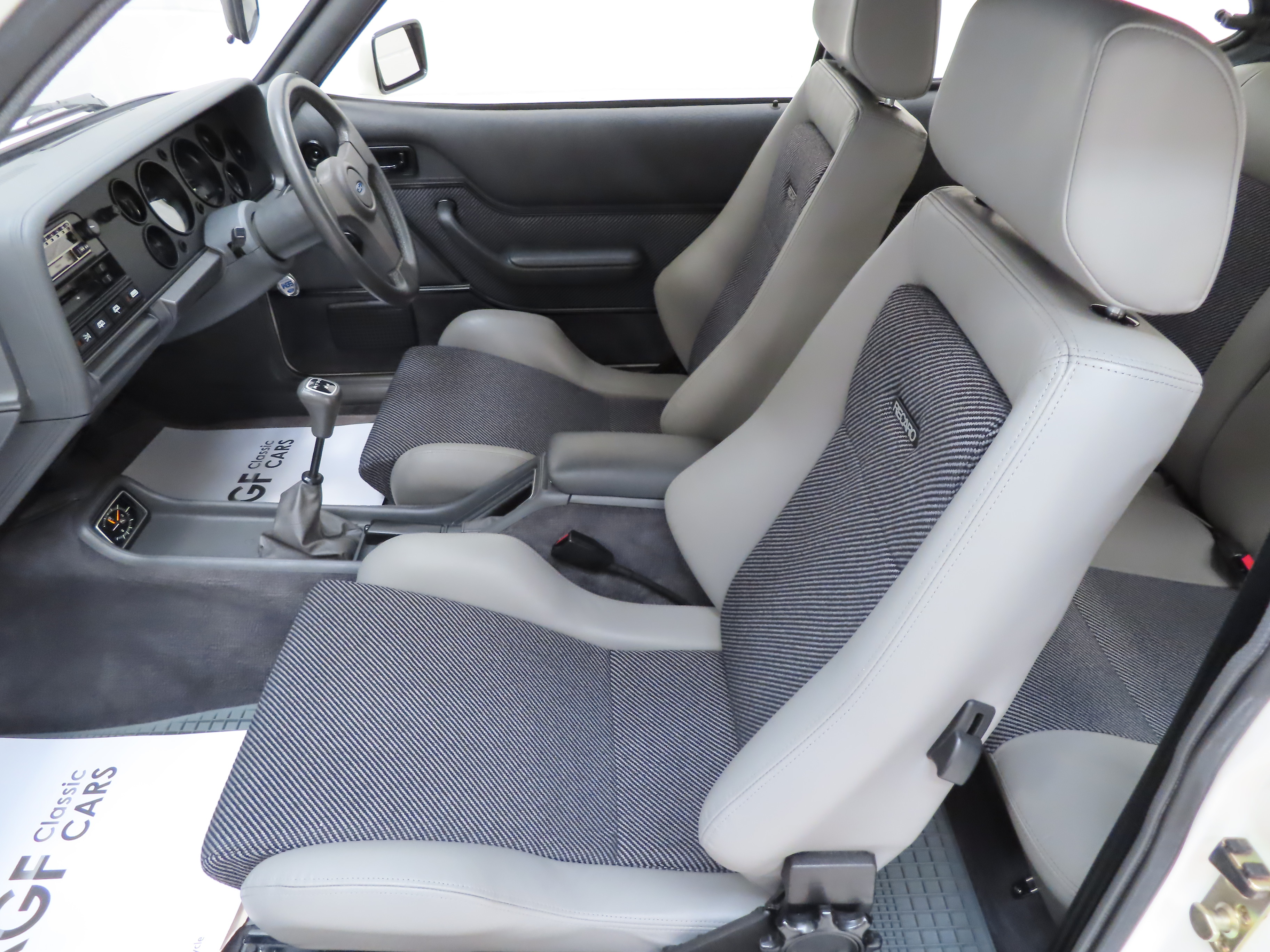 Incredible. Shielded from natural daylight, protected with seat covers and numerous Ford tailored mats but vitally, only cherished by conscientious Albert from new! Upon collection, the clear large removable sticker informing the new owner of official MPG figures was carefully removed from the side window and framed and still belongs with the cars artefacts! The supportive Recaro seats in grey high-grade leather with ‘Strobe’ pattern fabric centre panels, (Code Q5), are spotlessly clean with firm seat structure and are supplied with the Recaro lumber support pads with instruction card laminated. All controls and gauges function including the ESRT 32PS stereo cassette and electric aerial. The rear seats have never been sat in and nothing has been placed in the time warp boot area. Albert removed the rubber strap holding the jack in place when new to avoid stretching and splitting it over time and placed it neatly beside instead! It really does not get better.