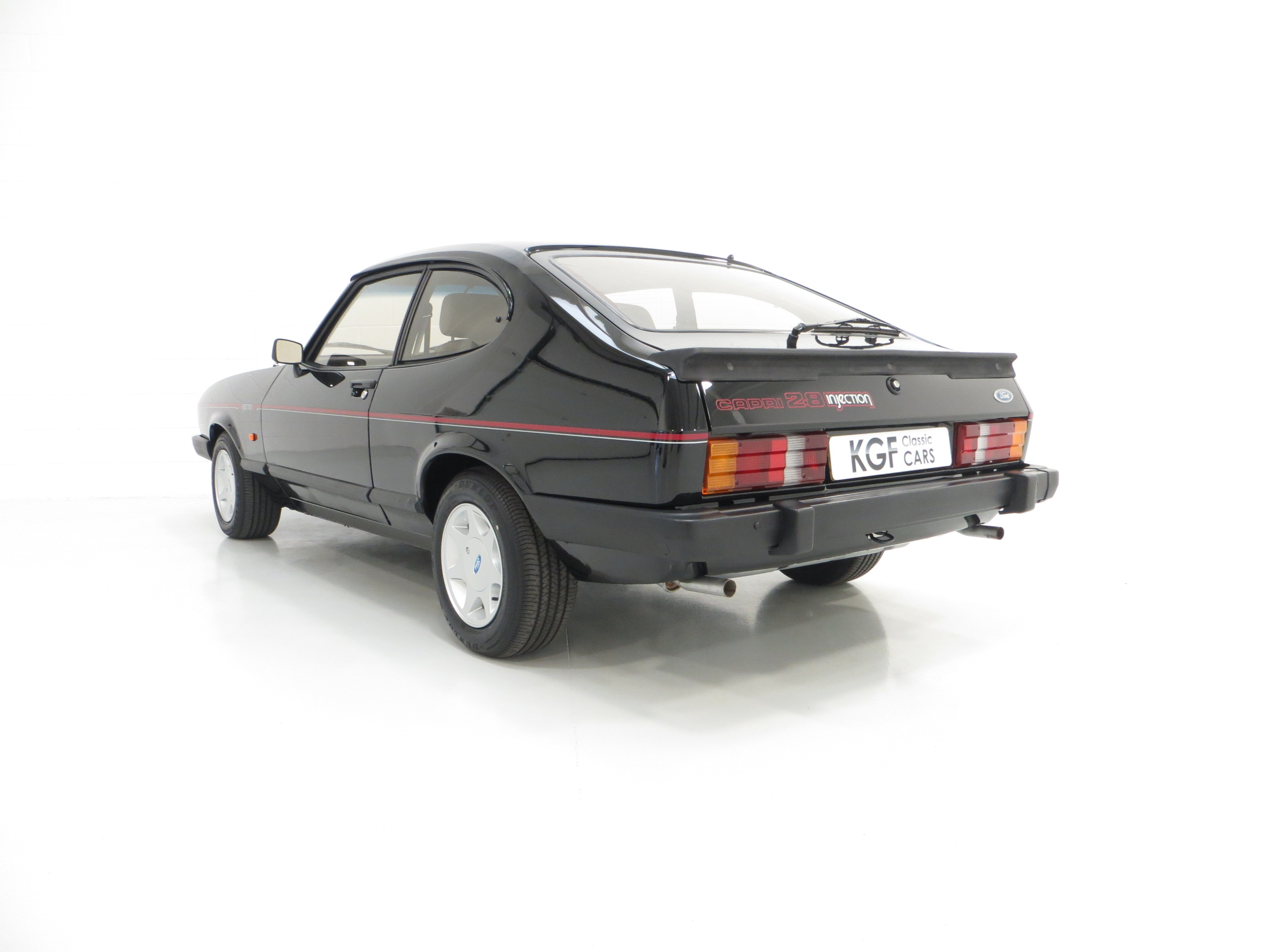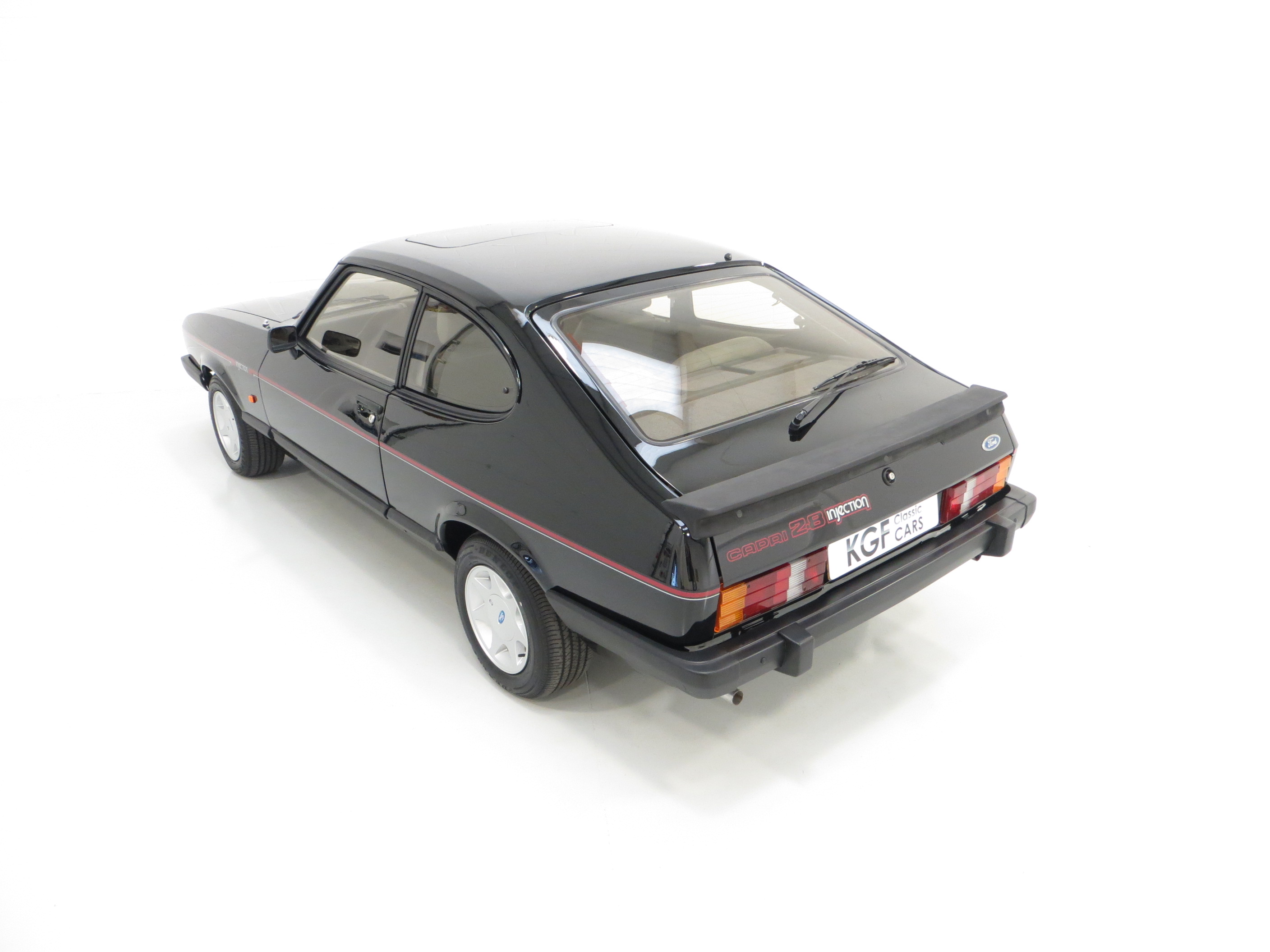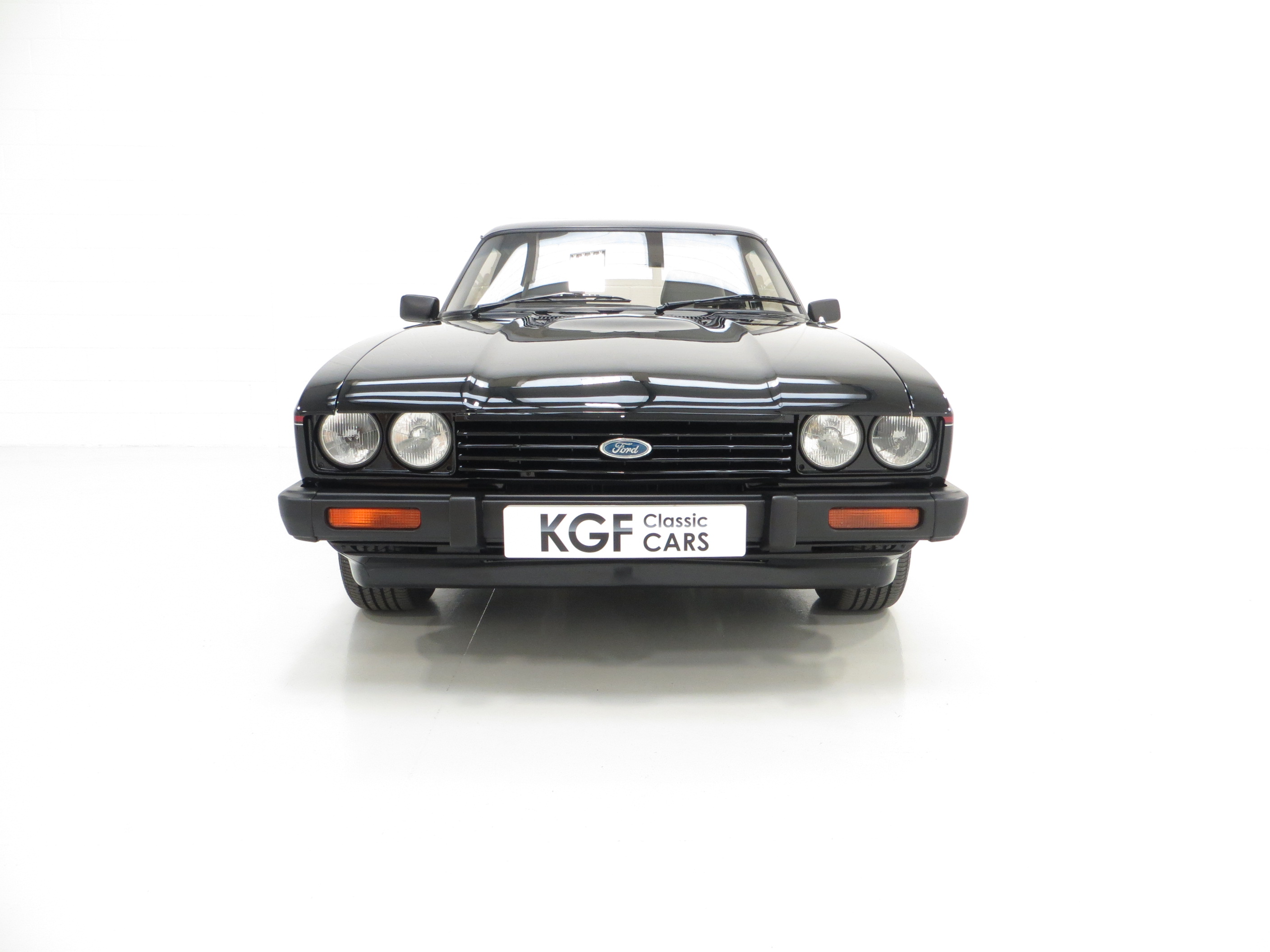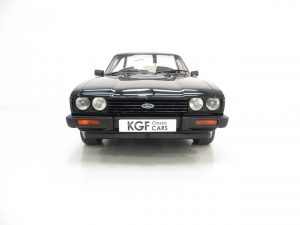 This outstanding Ford Capri 2.8 Injection is finished in factory optional Ford Black, (Code A9), and boasts an incredible finish and deep mirror shine. The bodywork is beautifully straight and all panels are factory original and display linear gaps. Originality seekers will be pleased to note all lenses are factory Hella fitment with Ford and ‘made in England’ lettering, and the supplying Ford Main Dealer rear number plates remains fitted. All trim sections are immaculate and the badges and decals are bright and undamaged. In arguably the most striking of colours, this gorgeous black Capri simply radiates the wow factor.