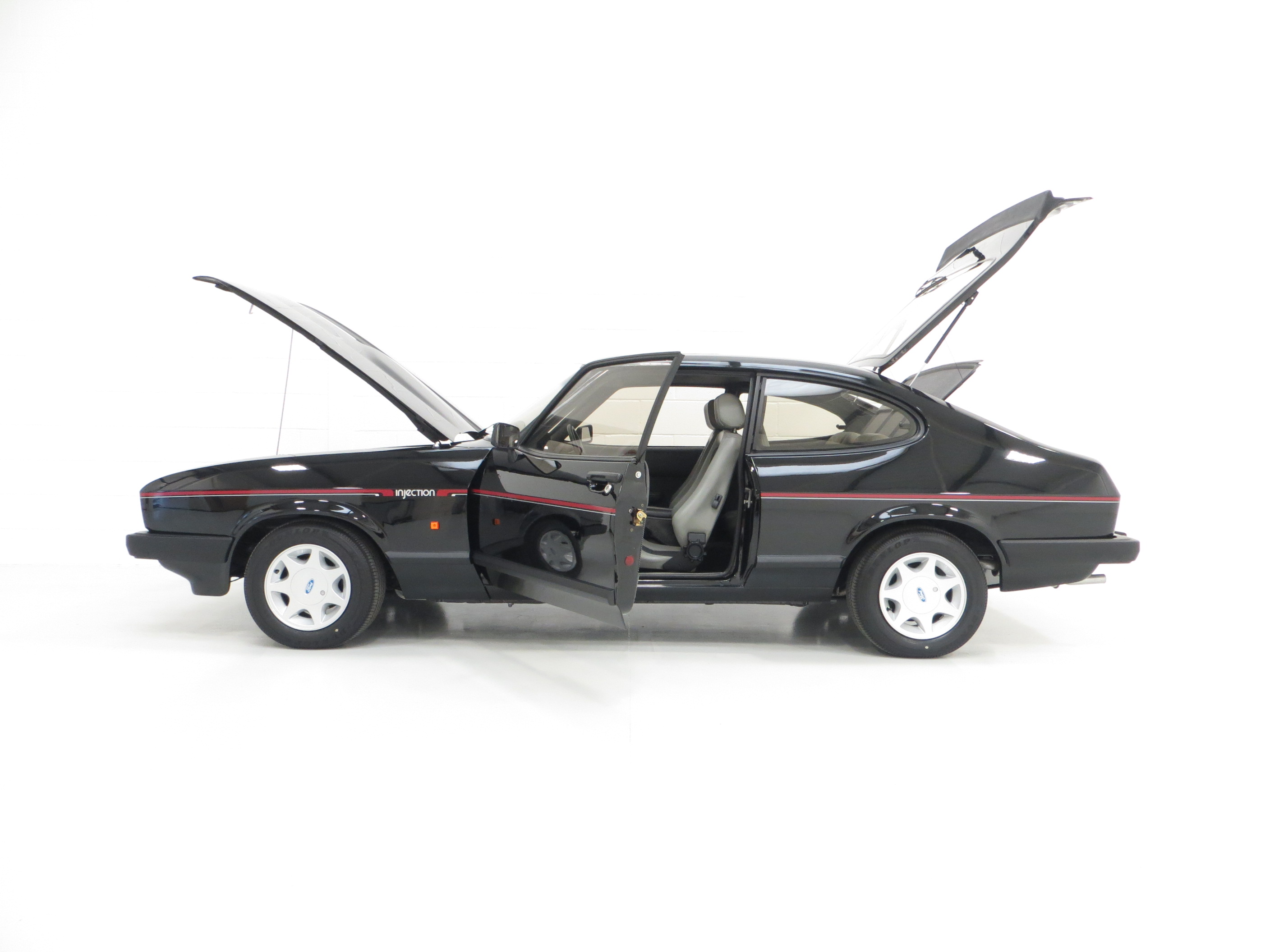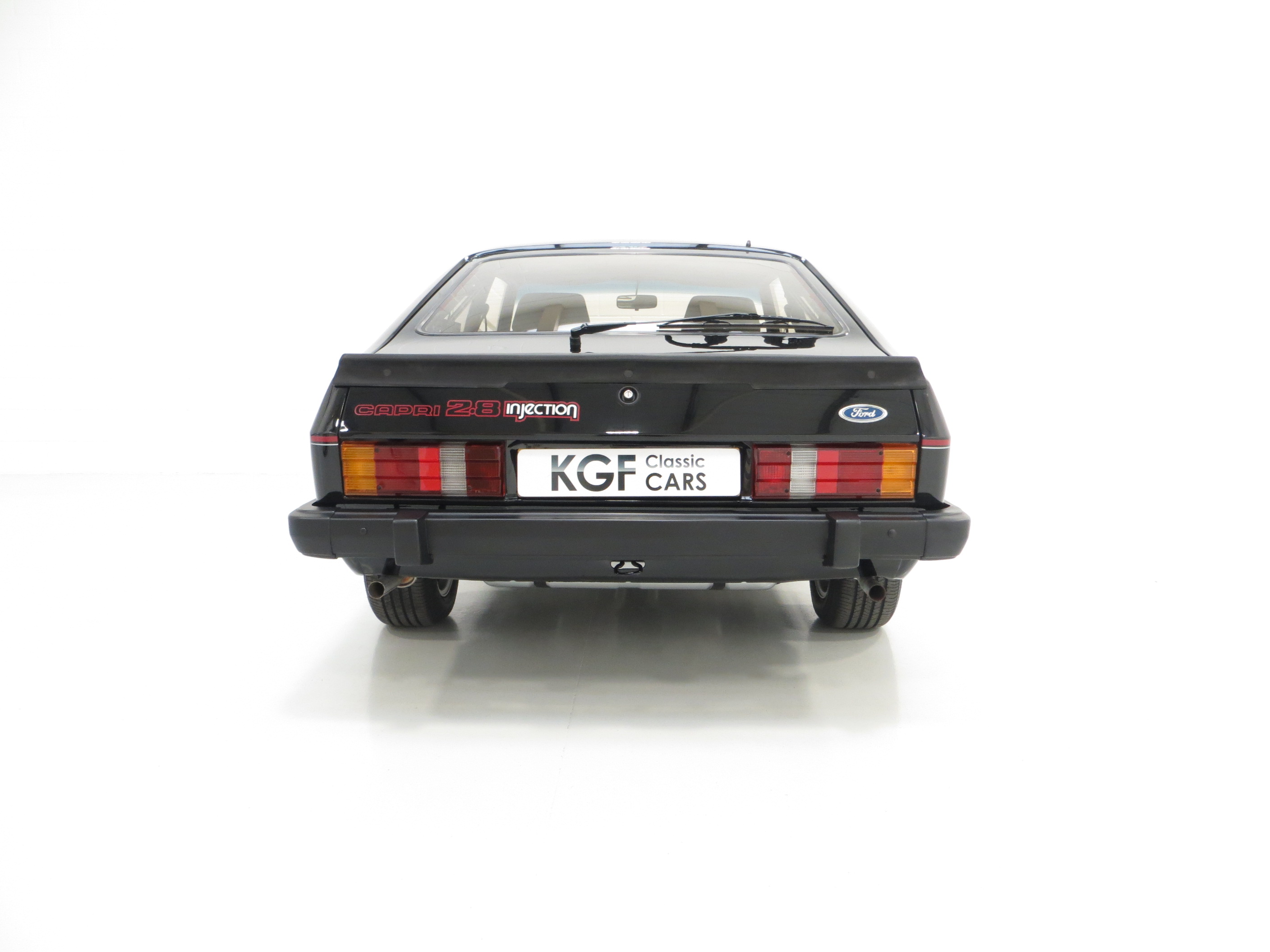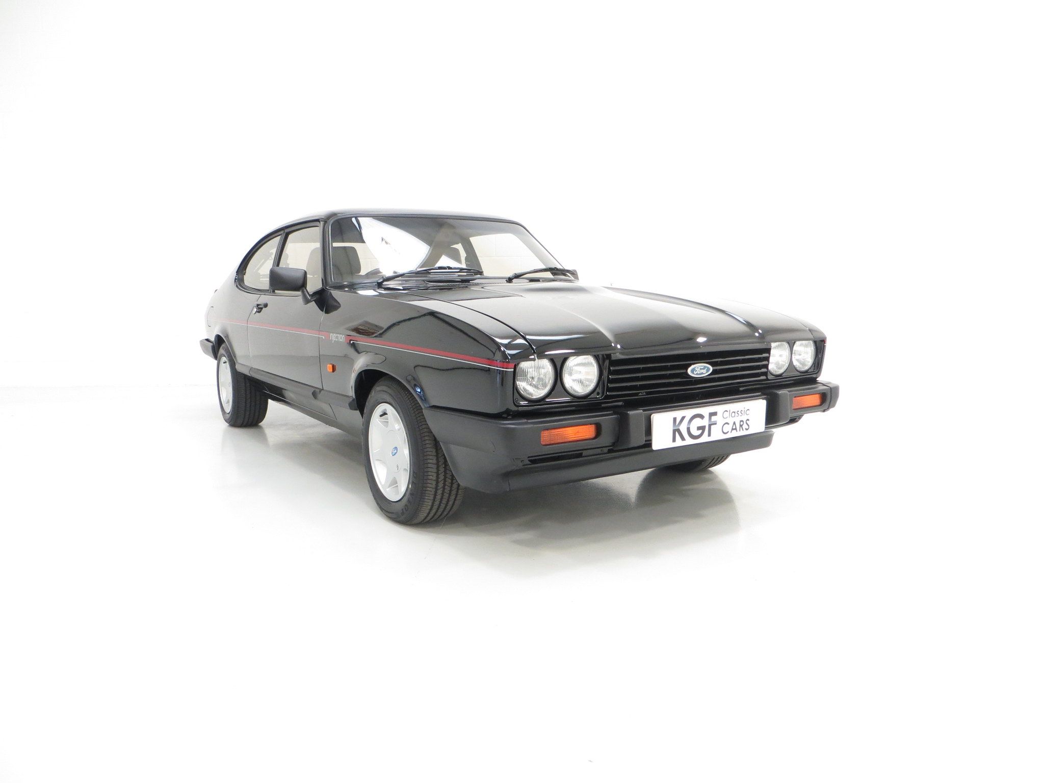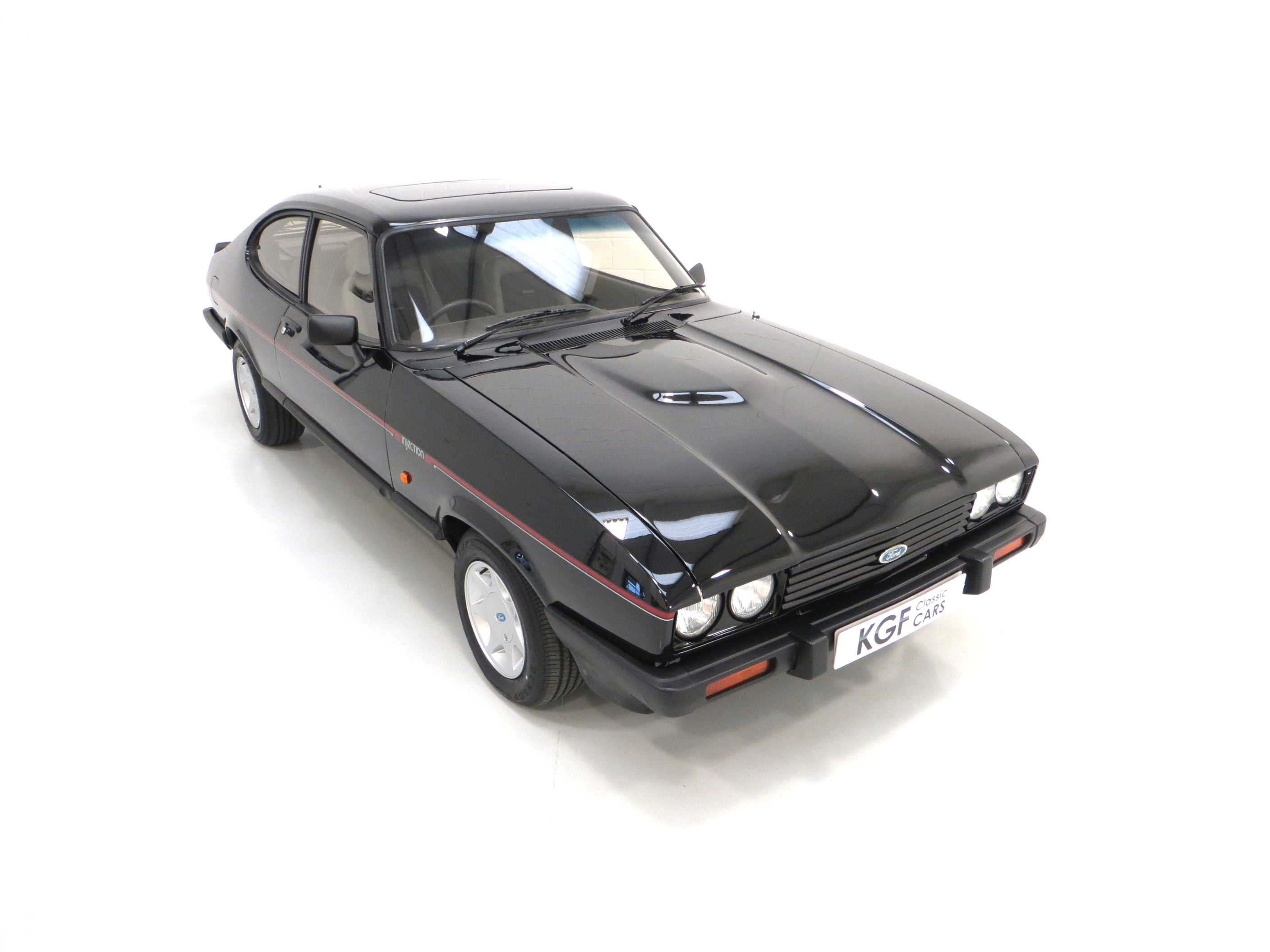 This outstanding Ford Capri 2.8 Injection is finished in factory optional Ford Black, (Code A9), and boasts an incredible finish and deep mirror shine. The bodywork is beautifully straight and all panels are factory original and display linear gaps. Originality seekers will be pleased to note all lenses are factory Hella fitment with Ford and ‘made in England’ lettering, and the supplying Ford Main Dealer rear number plates remains fitted. All trim sections are immaculate and the badges and decals are bright and undamaged. In arguably the most striking of colours, this gorgeous black Capri simply radiates the wow factor.