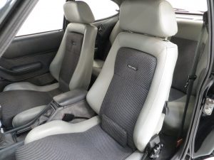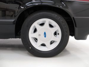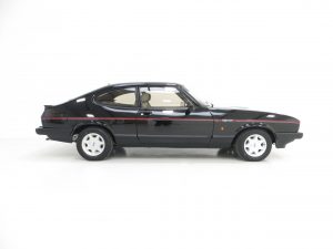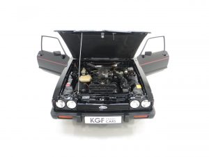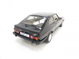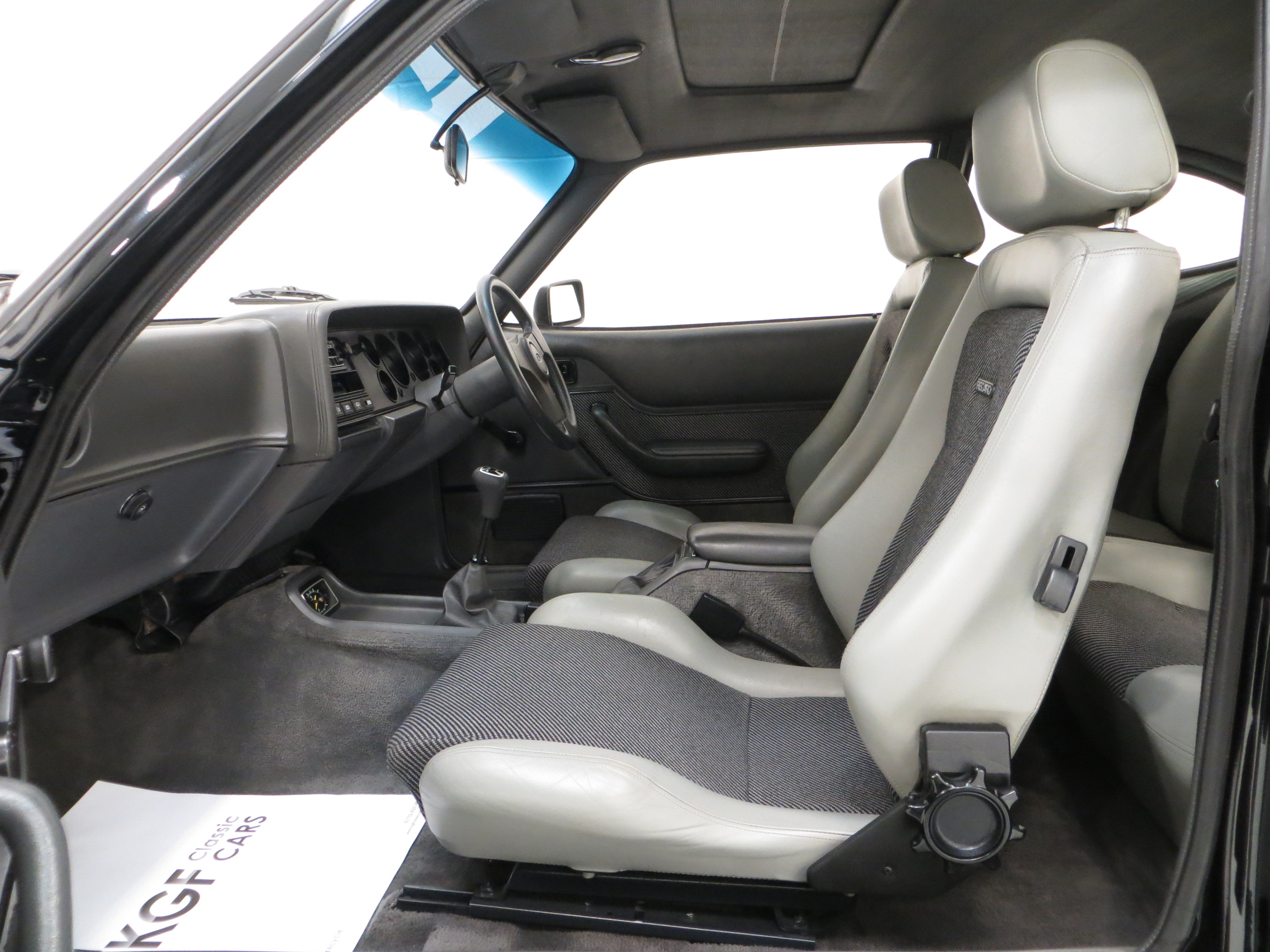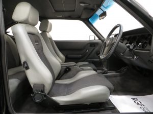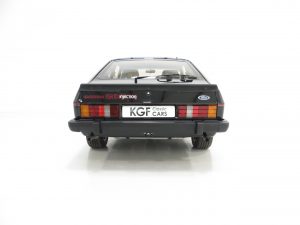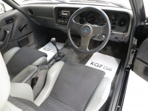 Remote control driver’s door mirror, body-coloured grille, lamp bezels body-coloured, power assisted steering, front and rear spoilers, tailgate wash/wipe, tinted glass all round, ammeter and oil pressure gauge, tachometer, quartz analogue clock, courtesy lights, perforated black headlining, front reclining Recaro seats, three-spoke leather covered steering wheel, tilting/sliding steel sunroof, boot light, instrument brightness control, Ford ESRT 32PS stereo cassette. Factory options; Black paintwork.