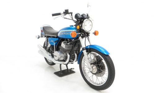 Finished in Candy Purple, one of only two colour options available for the 750 Mach IV H2 model, this matching numbers US example has gained award winning status with its long term club owners, having entered into the UK in 1993. Correct US specification features include no rear mudguard, no seat strap and circular side reflectors. The pristine and correct Candy Purple paintwork catches the sunlight in an amazing almost psychedelic manner and is delightfully 70’s! Beautifully detailed in every respect but not to the detriment of originality, all components are in remarkable order and the chassis and engine numbers clearly visible for inspection. Likewise, the almost ornate asymmetrically arranged three branch exhaust system displays clear part number stampings. Lifting the seat reveals further delights such as the original spark plug holder and complete toolkit in the plastic pouch. All manufacturer stickers and notices are clearly intact and a reproduction owner’s manual sits in the holder with the genuine original item safety preserved in the history file. The factory fitted seat, grips and rubbers can all be described as excellent. A truly exceptional example of the Kawasaki’s that took the 1970’s biking world by storm.