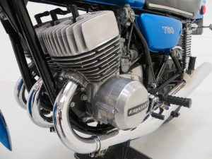 The three cylinder two-stroke air-cooled engine has a 748cc displacement and produces 71bhp at 6800rpm. A standing start ¼ mile of 12 seconds was quoted along with a claimed top speed of 126mph. Features such as the capacitor discharge ignition (CDI) remain exactly as the manufacturer intended. The 5-speed ‘all up’ constant mesh transmission with wet multiplate clutch operates perfectly. It is crucial to emphasise that this collector’s example is not just a show piece but has been maintained and importantly used as intended in dry conditions. A guaranteed smile on the riders face experiencing the ‘Triple Tingle’ amid an intoxicating soundtrack and cloud of blue smoke in their midst!