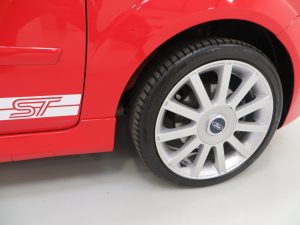 Unique ST design 17” alloy wheels are immaculate thanks to a light refurbishment with no curb damage and all Ford badged centre caps are as new. Premium brand tyres of size 205/40 ZR17 have good tread remaining and the original space saver spare wheel still wear the factory Continental rubber, housed in the clean boot floor which has factory stickers and PDI markings still visible. The factory jack and wheel brace are present. Anti-lock brakes (ABS) with discs to all four wheels offer rapid stopping power for this performance hot hatch.