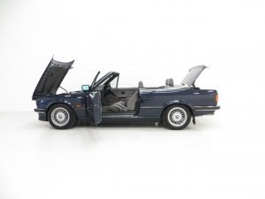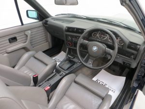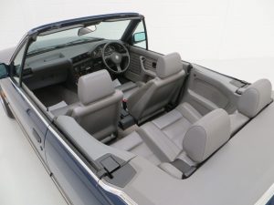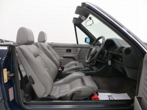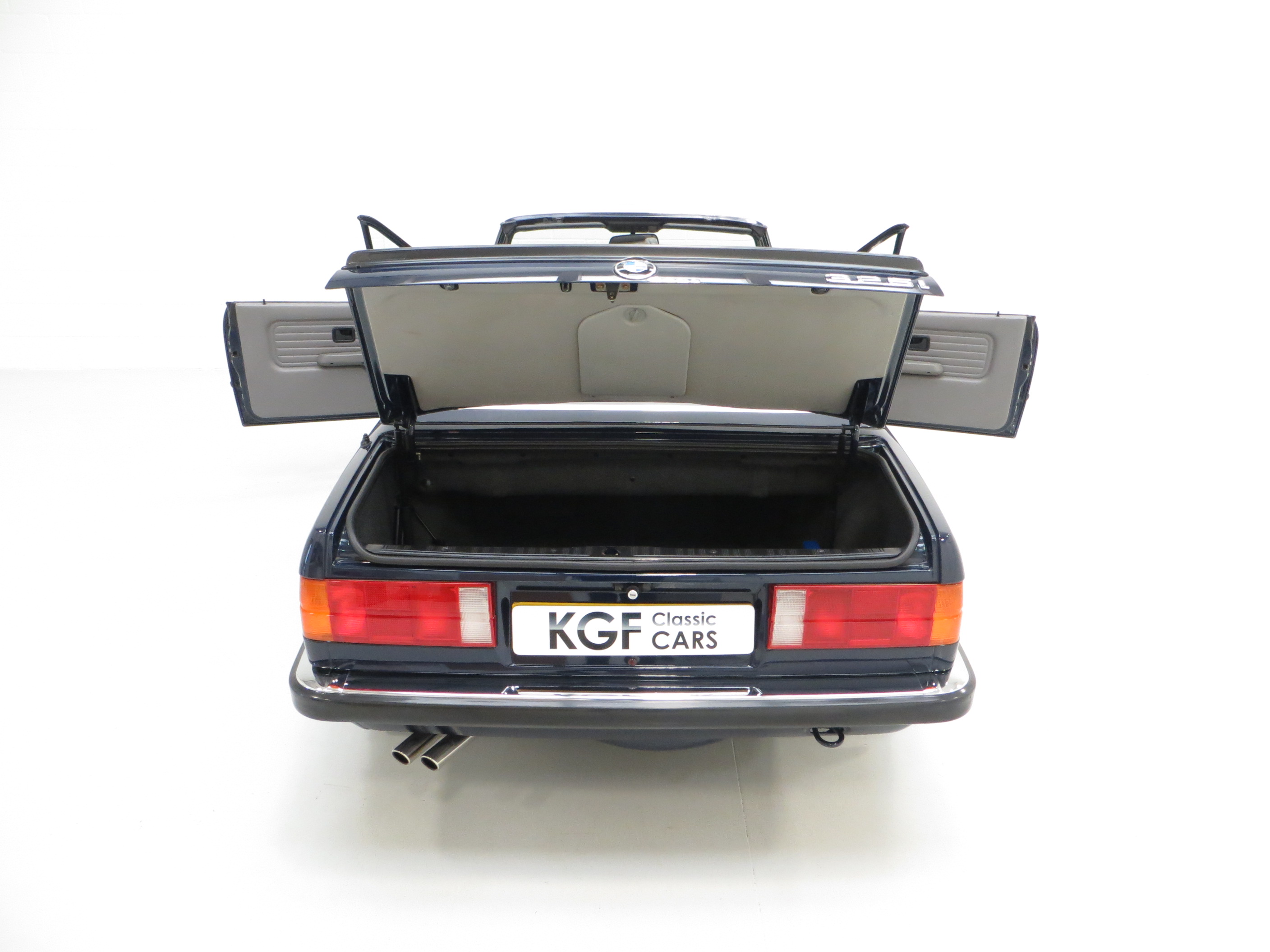 This outstanding pre-facelift or ‘chrome bumper’ E30 325i is finished in solid Atlantisblau, (Atlantis Blue, Code 207). The original paintwork boasts a spectacular deep gloss shine and high polished finish, and the original panels are beautifully straight with uniform shut lines. The desirable chrome to the bumpers and trim as fitted to the pre-facelift cars is in immaculate order and gives a chic classic look. All light lens’ are original Bosch and Hella fitment and all glass is factory BMW etched. The black plastic bumper trim sections have a very light rub to the nearside rear and offside front corners and wheel arch apertures are very clean. The Dark Blue Substance UV resistant hood is in amazing condition, virtually mark free with no fading and a clear, undamaged plastic screen. An iconic classic BMW convertible.