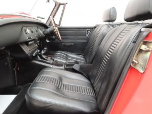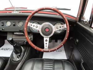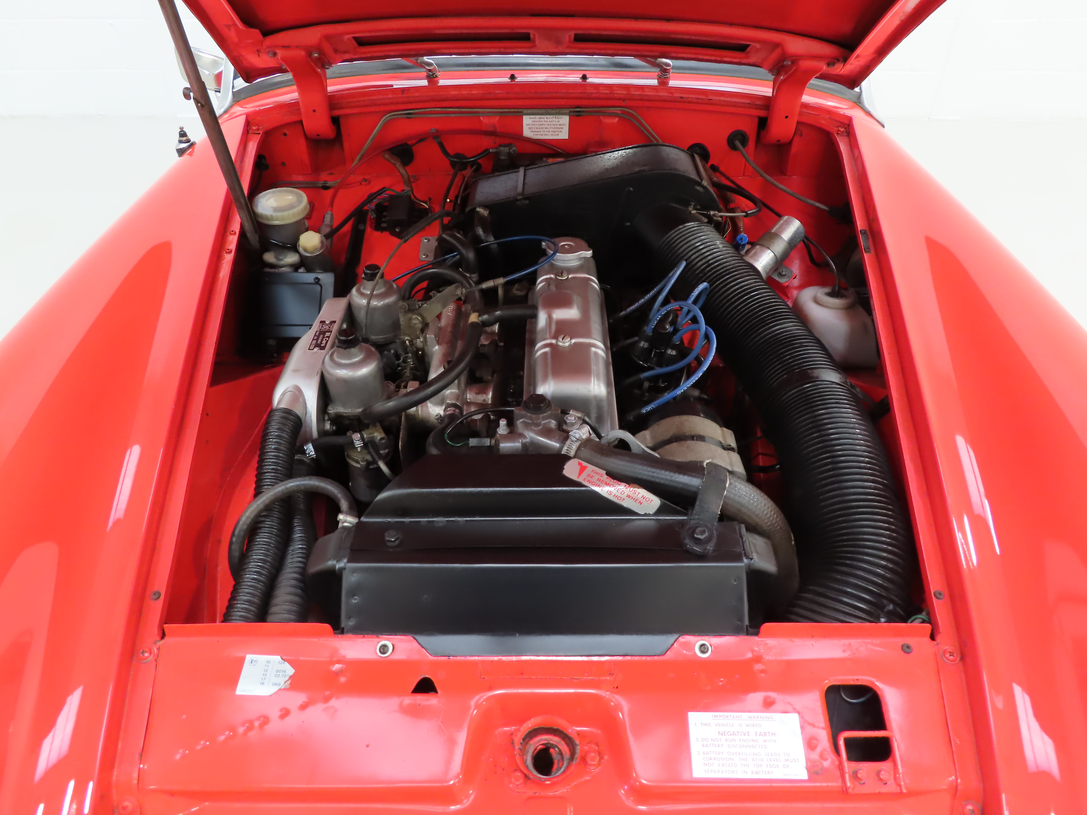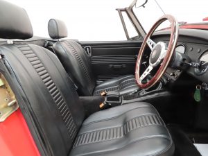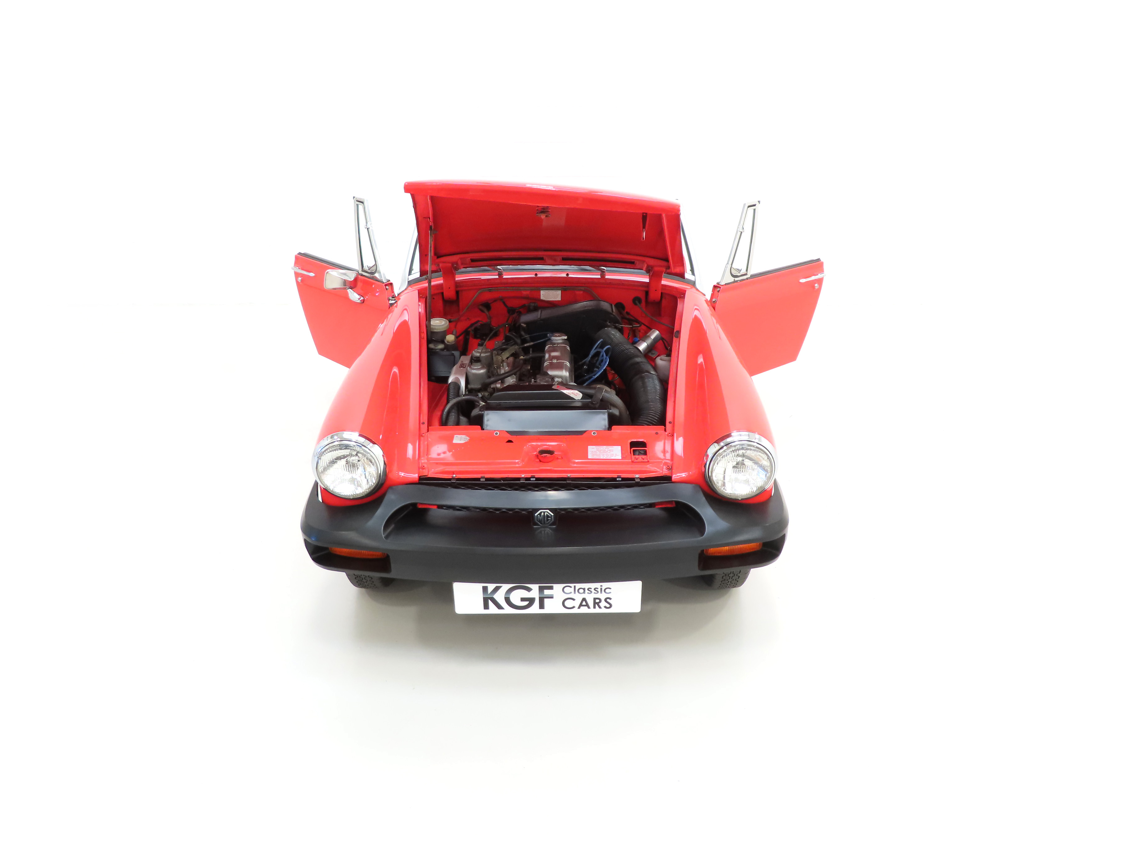 The original knit-backed expanded black vinyl seats are in excellent condition with no wear, markings or damage. Matching door cards and interior trim sections are in very good order with only the driver’s door trim showing a couple of nicks towards the edge. The carpets are factory fitment and remain protected by the genuine rubber MG floor mats. The unspoilt crackle finish fascia houses fully functioning controls and switchgear including the period Unipart push-button radio. The steering wheel has been replaced with a beautiful and expensive Motolita item but the original has been retained should the next owner desire a totally standard interior. A snug and ergonomically confused interior, exactly what we love about this traditional British sports car!