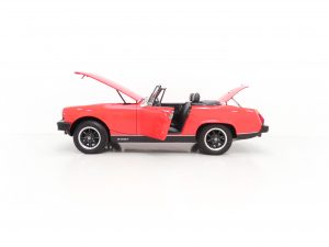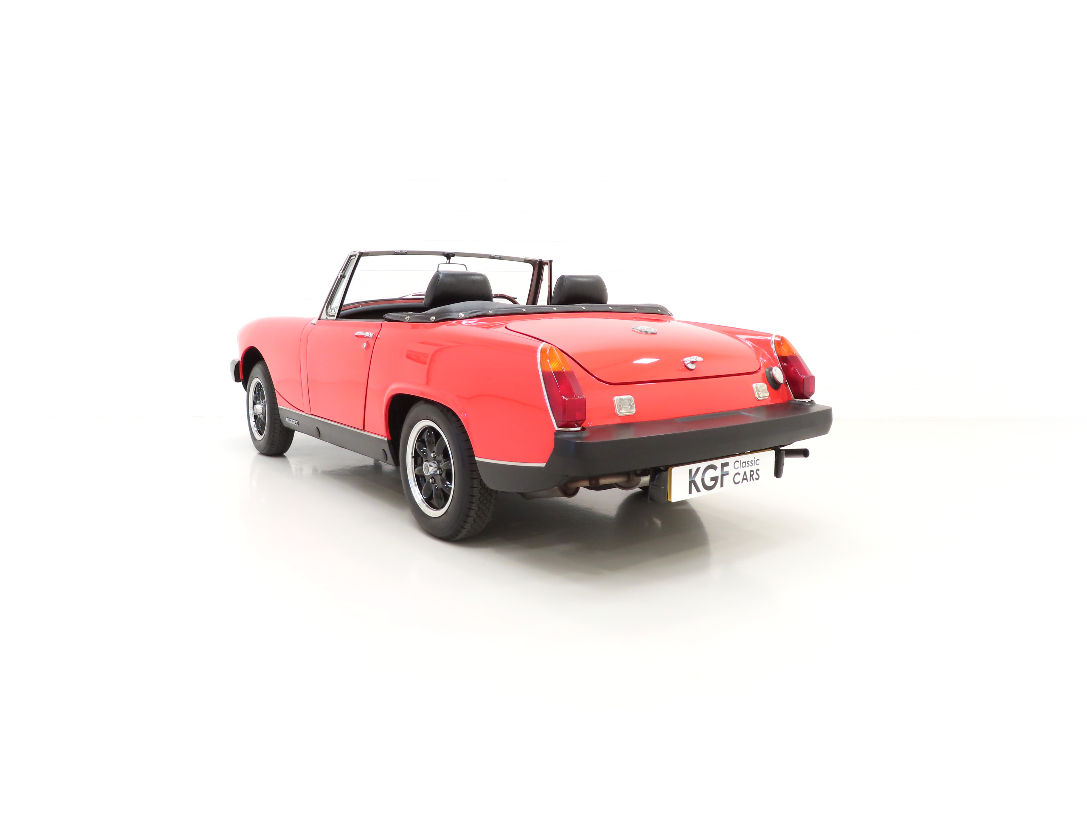 Polyurethane bumpers, curved zone-toughened windscreen, integral vinyl coated hood, full and rear tonneaus, chrome driver’s door mirrors, wind-down door windows with hinged ventilators, interior rear view anti-dazzle mirror, fresh air heater, swivelling sun visors, map shelf, oil, fuel and water gauges, trip and mileage recorder, rev counter, electric tachometer, windscreen washer, hazard warning lights. Dealer options; Unipart push-button radio, MG rubber floor mats. Accessories; Gloss black with polished rim 13” Minilite style alloy wheels, Motolita wood rimmed steering wheel, soft car cover.