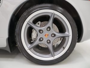 The 7.5 J x 18 and 9 J x 18 light alloy wheels fitted front and rear respectively are finished in Seal Grey with coloured Porsche Crests. All four rims are in superb condition with minor markings only. Ultra-low-profile matching branded tyres with masses of tread remaining and of size 225/40 R18 front and 265/35 R18 rear. The ABS assisted braking system incorporates 4-Wheel ventilated and cross-drilled discs with 4-piston fixed monobloc callipers. Both ornate discs and cool aluminium painted callipers with Porsche inscription unique to this model are clearly visible through the spokes.