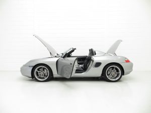 Race-bred chassis, rigidly tuned springs, shock absorbers and stabiliser bars, dual cargo areas, electric convertible top with glass window, Porsche Stability Management, front and side airbags, Litronic headlamps with wash feature, silver mesh rear grill, stainless steel tailpipe, commemorative plaque, heated sports seats, automatic climate control, Porsche CDR23 Sound Package, electric driver’s seat adjustment. Factory options: Hard top with storage bag and stand, top tinted windscreen, cruise control, CDC-4 CD Autochanger, CD storage, Dark Grey natural leather, seat backs painted in body colour, centre console front section. Dealer accessories: Speedster humps, tailored carpet mats, Porsche Boxster car cover.