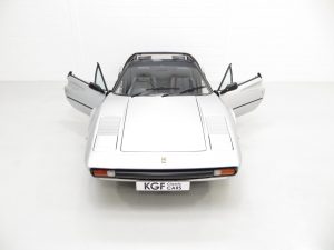 Instantly recognisable, the edgy styling flair from Pininfarina is simply gorgeous and is hailed as one of the designer’s true masterpieces, and a welcome return from the much-debated Bertone penned 308GT4. Finished in beautiful Argento Auteuil, (Code 633.6.031), this stunning example boasts a bright uniform finish and remarkable preserved condition. Minor age-related markings can only be found under scrupulous inspection and certainly do not detract from the appearance whatsoever. All factory trim sections, rubbers and lights are in pristine order, as are the stylish original badges and exterior plates. The removable roof panel is perfect and stores neatly behind the seats to create the GTS namesake ‘Spider’ body. Fabulous in every respect.