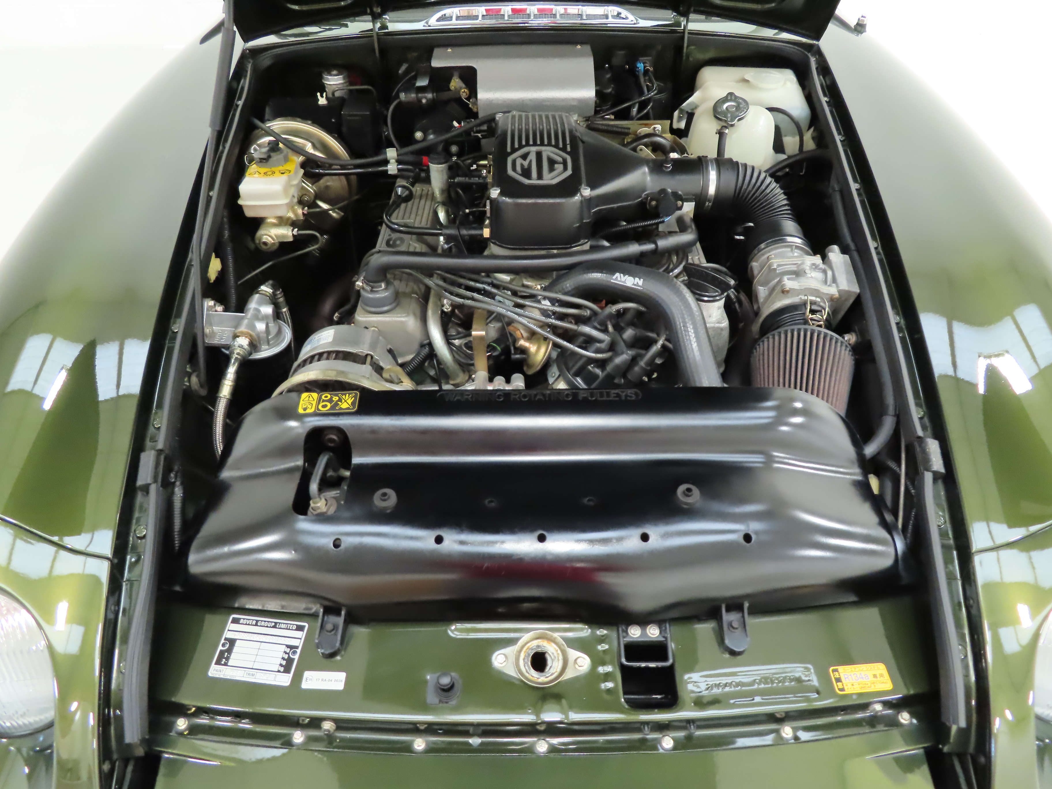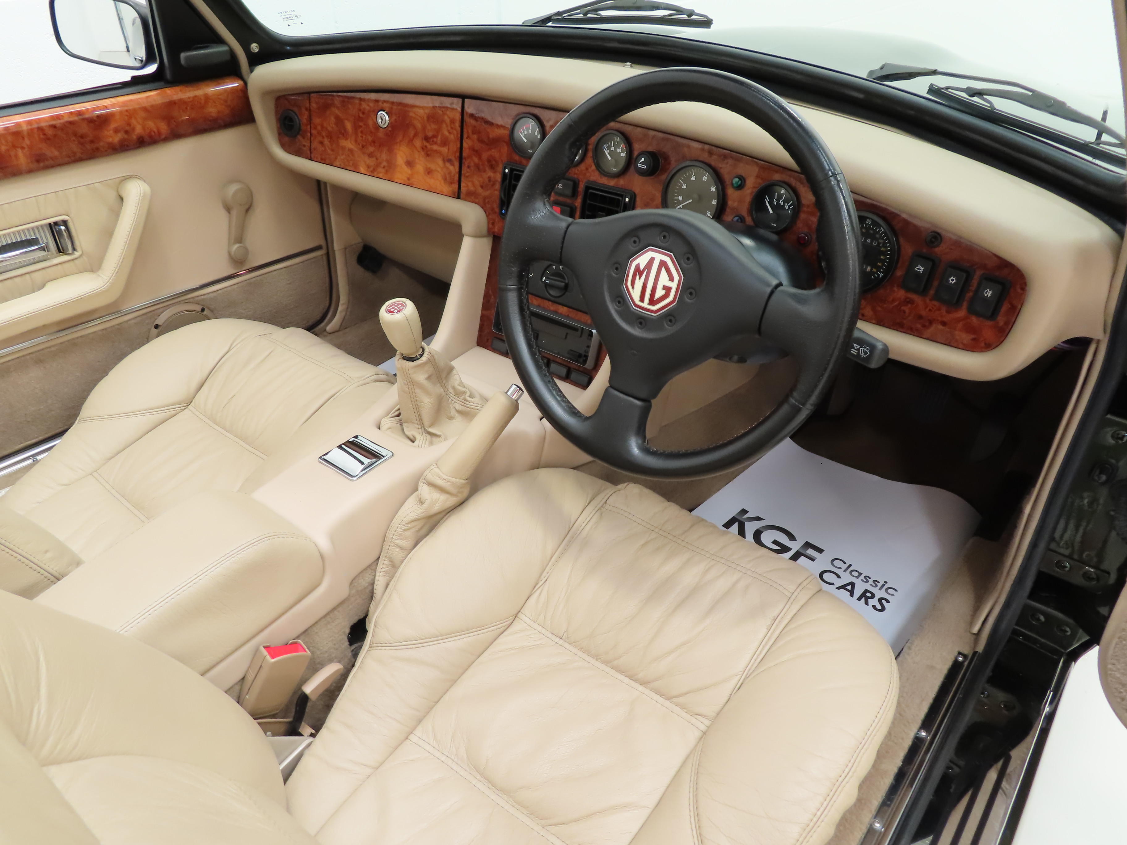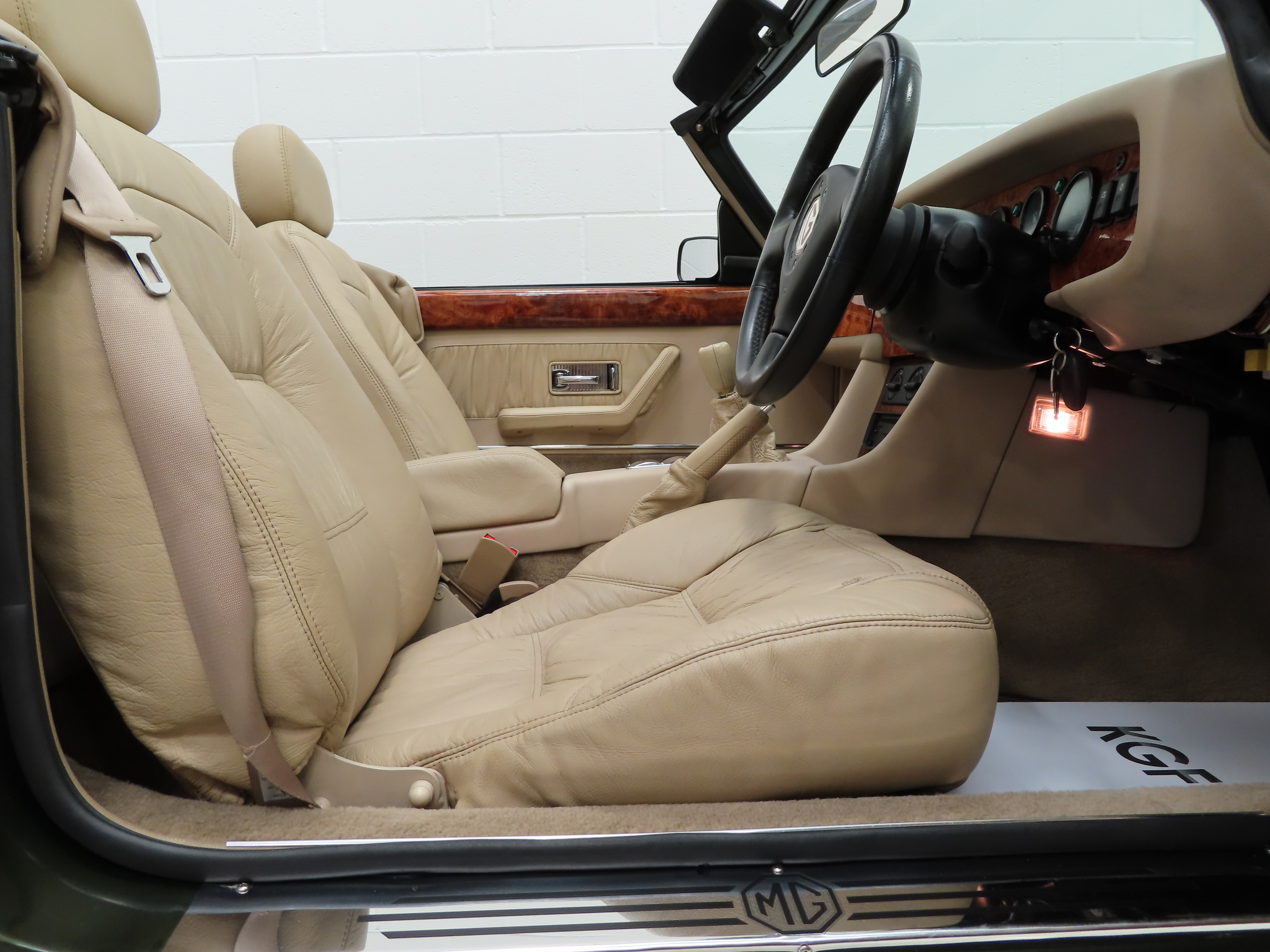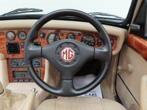 Lavishly trimmed in fine Connolly Stone Beige leather, (Code SMJ), with a ruched pattern and rich in Elm Burr veneer adorning the facia panel, centre console and door cappings, the interior is pure unspoilt luxury. The original cream leather gear knob which on most examples is discoloured or replaced, remains as new. MG traditional sporting appeal can be seen with a full set of VDO black-on-white working instruments and chrome interior door handles, roll top lid ashtray and handbrake release button. The air conditioning does not blow ice cold and the radio has been replaced. The original MG velour mats have protected the dark Stone Beige cut pile carpets which have endured no wear. Afficionados will delight at the factory supplied and untouched MG toolkit complete and in the brown canvas tool roll. A beautifully traditional interior in outstanding preserved condition.