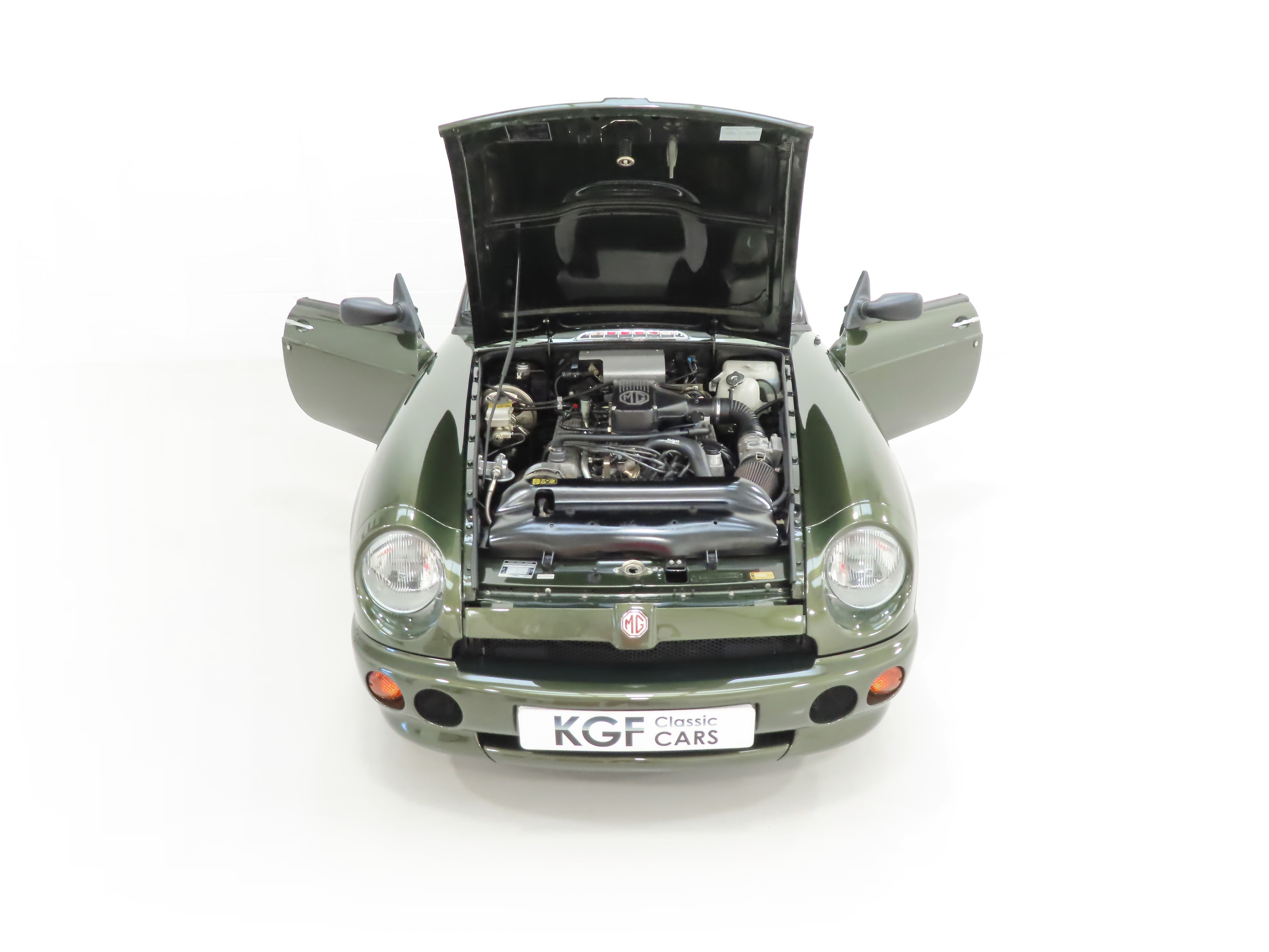 An appealing, curvaceous, wasp-waisted style immediately recognisable to MG aficionados is finished in optional pearlescent Woodcote Green, (Code HPE), a cost option at £750 when new. A perfect deep gloss finish has been preserved by the two fastidious UK owners since the car arrived from Japan in 2006 along with the genuine and frankly astonishing 820 miles from new! The correct panels produced by Abbey Panels are unmarked and the original factory fitted soft top made by Tickford is pristine and the rear screen perfectly clear. The rear tonneau is as new. The underside is in beautiful original condition commensurate with the ultra-low mileage with all PDI markings and fragile labels still attached. The famous octagonal MG badging is bright and unmarked and all chrome brightwork has a mirror finish. An enduring British motoring classic.