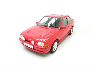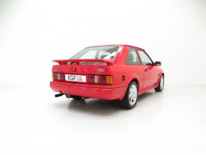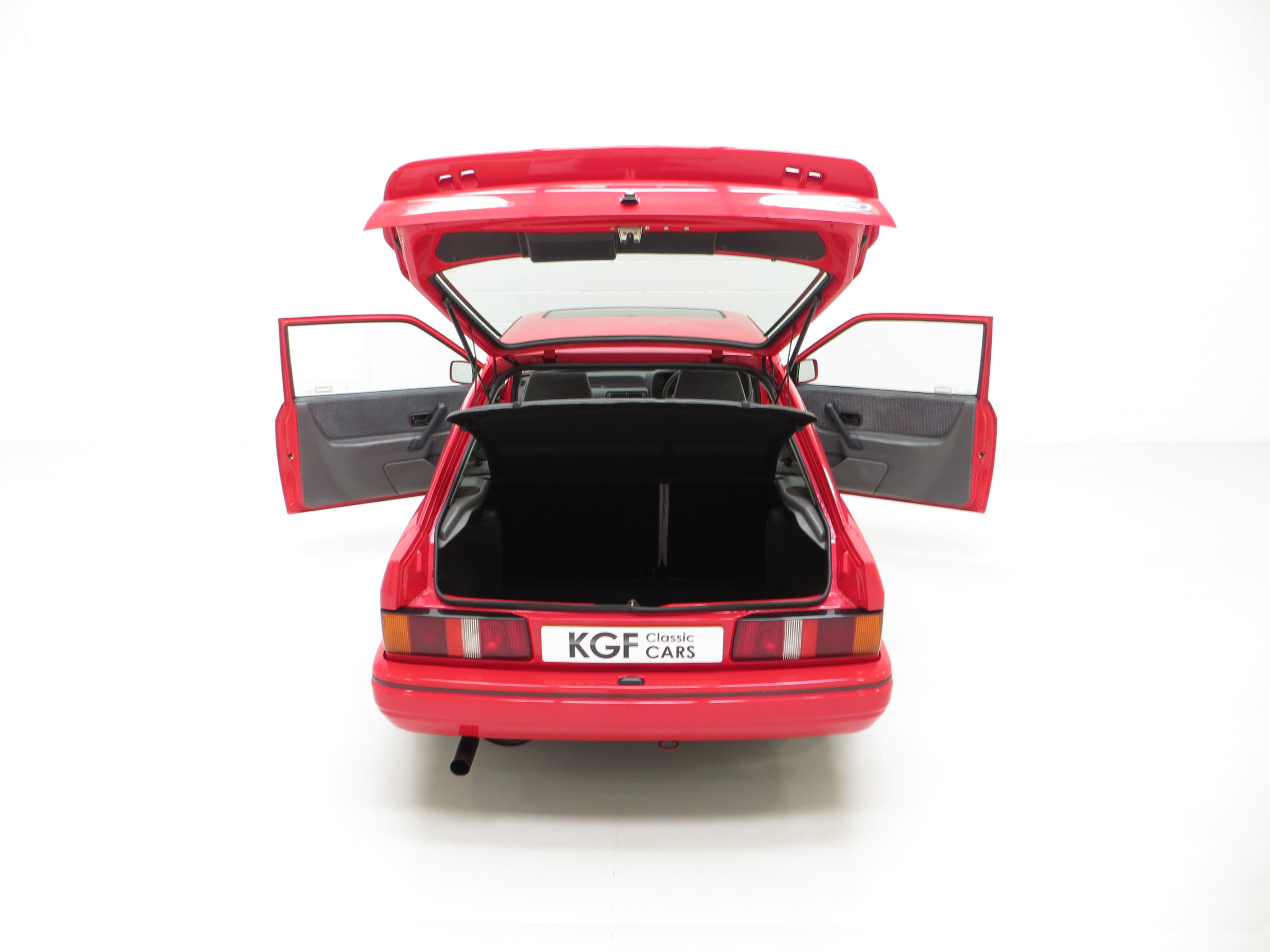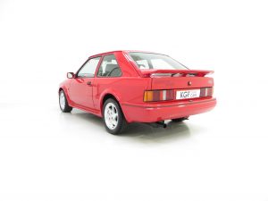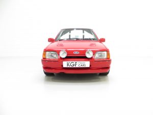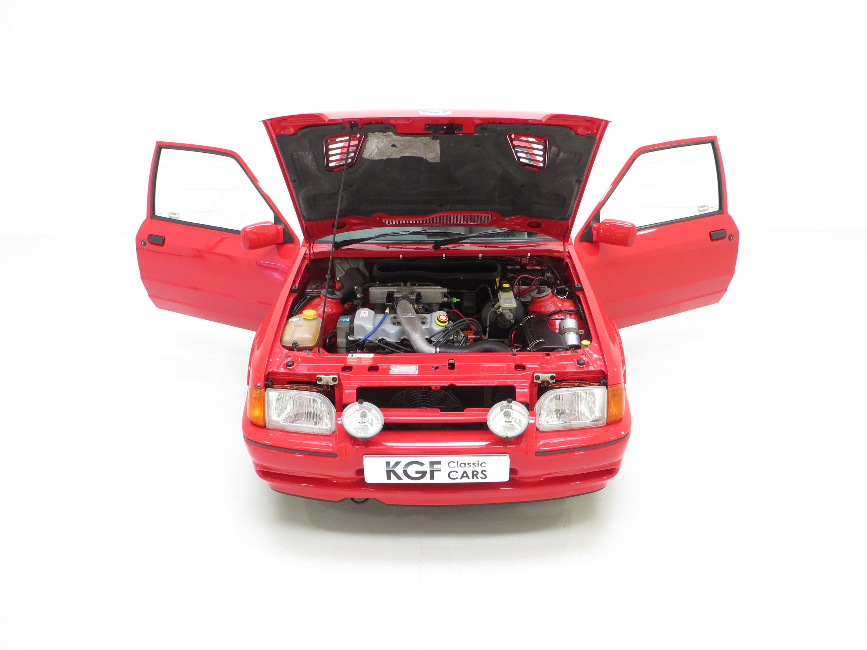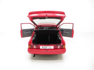 Finished in striking Radiant Red, (Colour Code P9), this excellent standard RS Turbo has a deep glossy shine. The desirable 90 spec enhancements such as the face-lift front bumper and rear spoiler are fully intact and straight. Remedial paintwork has been undertaken in order to uphold the pleasing finish and all factory panels are straight with linear gaps. Correct decals, body-styling, original Carello headlamps and Ford rear light clusters remain fitted and the front window rubbers have distorted slightly. All exterior glass has factory stickers and is security etched with the registration number, and Ford main dealer number plates are fitted. A very bright and useable show goer.