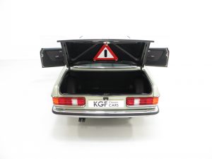 A high specification machine for 1977, the interior of this 280CE entirely warrants the sometimes-dubious time warp descriptive. Upholstered in original Black Fabric, (Code 001), the seats and matching door cards are beautifully preserved and commensurate with the super-low mileage. The deep pile carpets are pristine, along with the headlining and all interior trim sections and the unused first aid kit is present in the rear shelf compartment. The fascia is perfect and all the gauges, controls and electrics operate exactly as they should including the Motorola radio and electric aerial operated by central toggle switch. The boot area has the factory supplied warning triangle, whilst originality seekers will note the rear light clusters complete with delicate manufacturer stamps and factory stickers within door apertures. This preserved interior could almost be described as new.