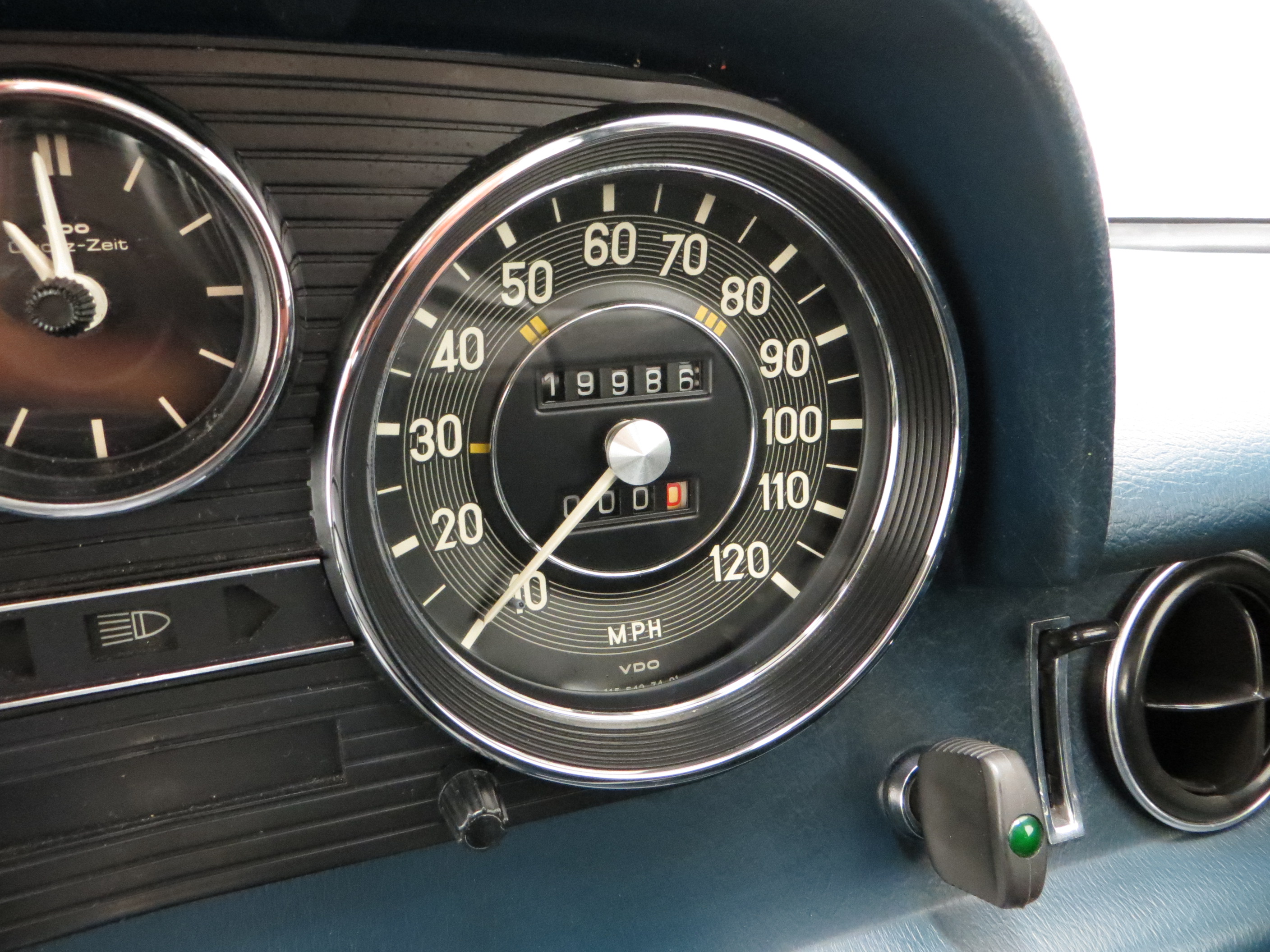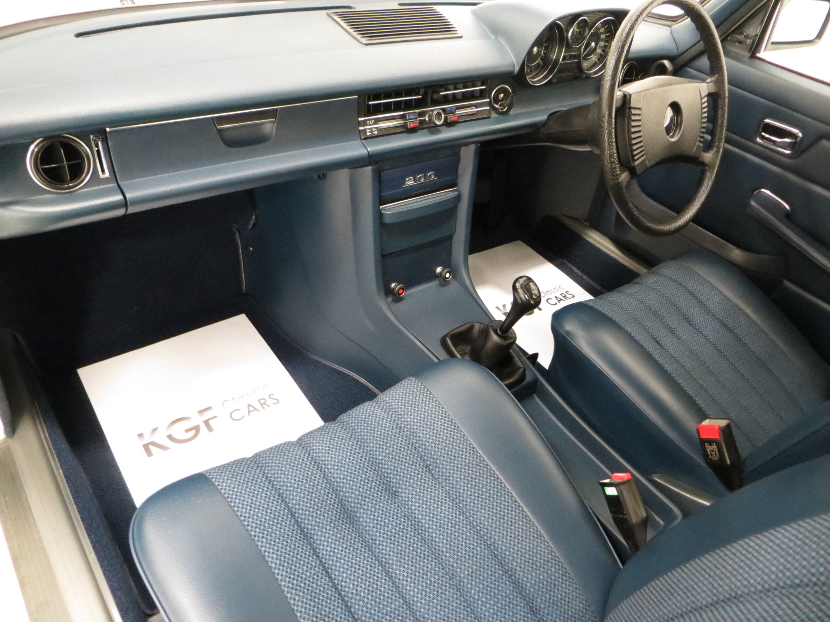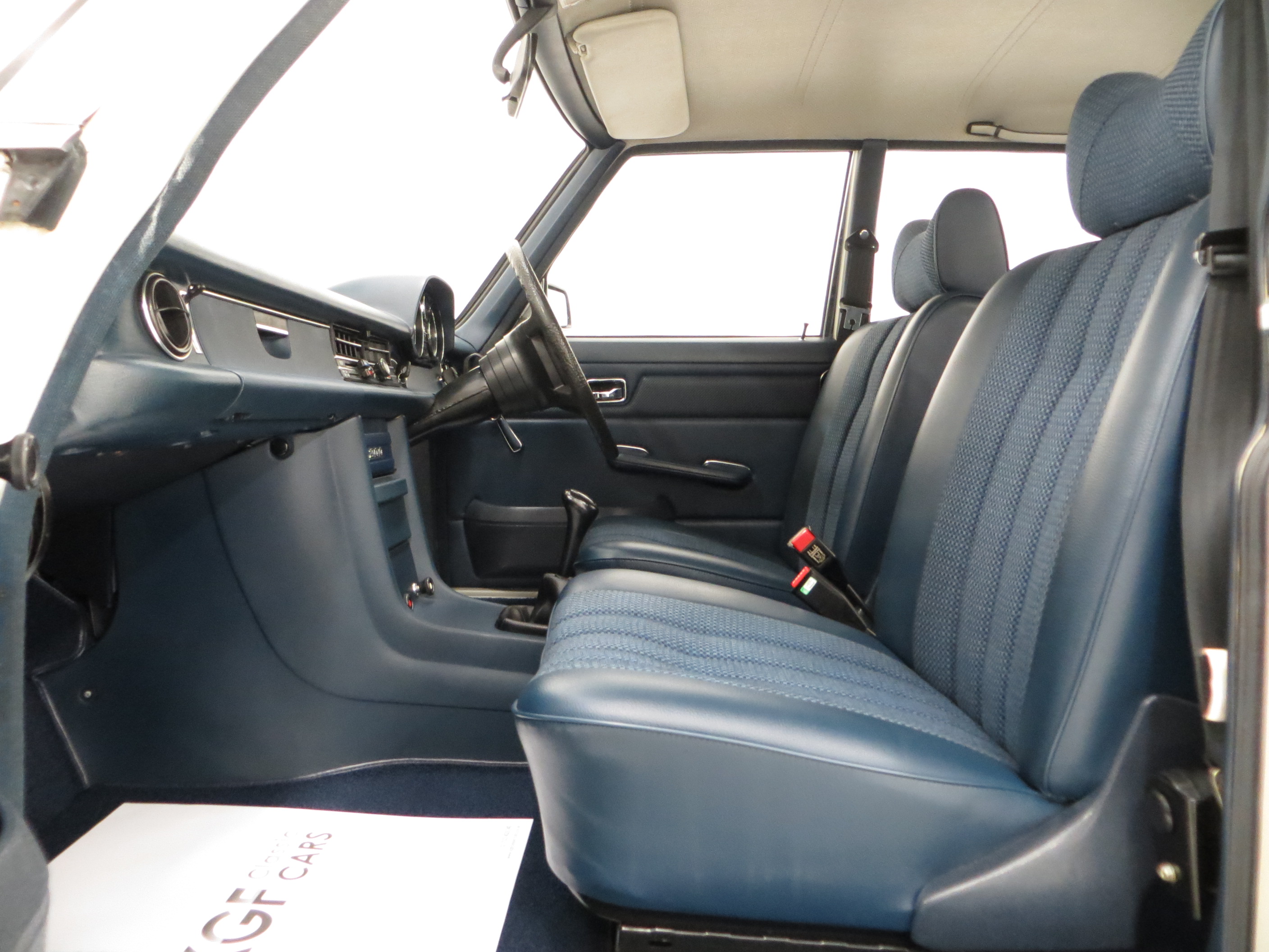 The interior of this 200 is incredibly well preserved and a testament to the mere 19,986 miles covered from new. Upholstered in original Blue Fabric, (Code 062), the seats and matching door cards are in perfect condition with no visible wear. The hardwearing deep pile carpets are pristine, along with the headlining and all interior trim sections, including the large four spoke steering with somewhat intimidating twin wind-tone horn. The fascia is perfect and all the gauges, controls and electrics operate exactly as they should. The boot area is huge with factory rubber mat and tool roll, whilst originality seekers will note the rear light clusters complete with delicate manufacturer stamps and date inscription of 16th June 1975! An interior representative of a 1975 showroom display car.