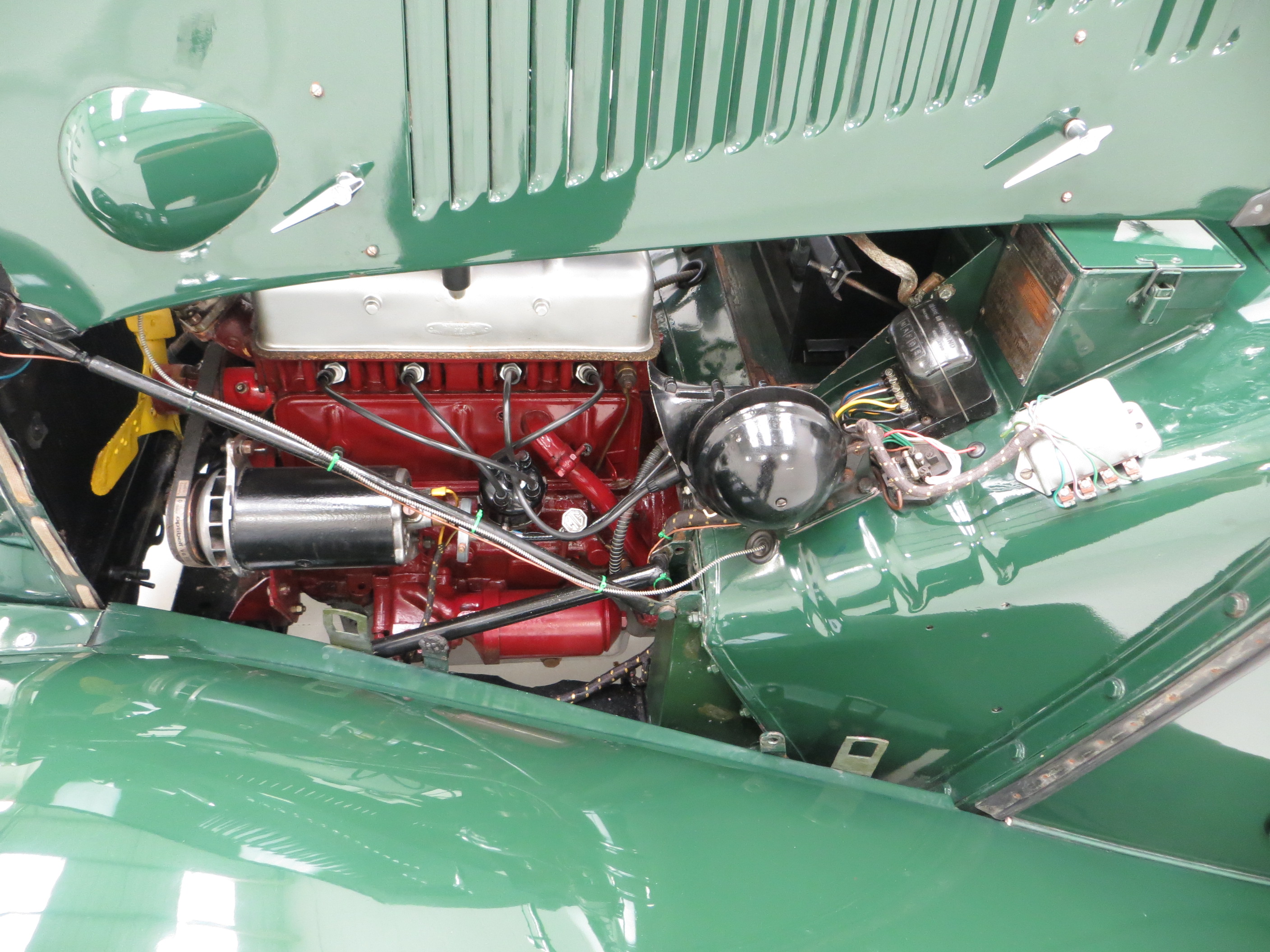 Open two-seater, steel panelled bodywork, suicide doors, folding windscreen, fold-flat hood in waterproofed duck, separate cover for hood and luggage compartment, celluloid side screens, side screens stowage locker, rear mounted spare wheel, quick release petrol tank cap, tool kit, emergency starting handle, twin duotone horns, dash control starter switch, mixture control, 5in diameter speedometer, 5in diameter revolution counter and clock combined, oil pressure and temperature gauge, ammeter. Optional extras; Badge bar.
