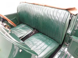 The naturally aged and original all-leather upholstery in Green is simply delightful and very well preserved. The matching green trim sections show some age as do some original seals. The seats are fully intact with no rips or tears and the seat structure is not overly worn. The leathercloth covered fascia is in superb order and the controls and gauges operate well with exception of the clock. In the absence of a fuel gauge which was not standard fitment, a fuel warning lamp informs the driver when the level falls below 2½ British gallons. The original speedometer and revolution counter have the distinctive pale green back plate designed to reduce reflective glare! All factory fitted controls and switchgear are well preserved and the Lucas windscreen top mounted wiper motor and huge thin rim steering wheel to remind you of a far simpler motoring age. A leather strap cover has preserved the beautiful steering wheel rim. Wonderfully nostalgic.
