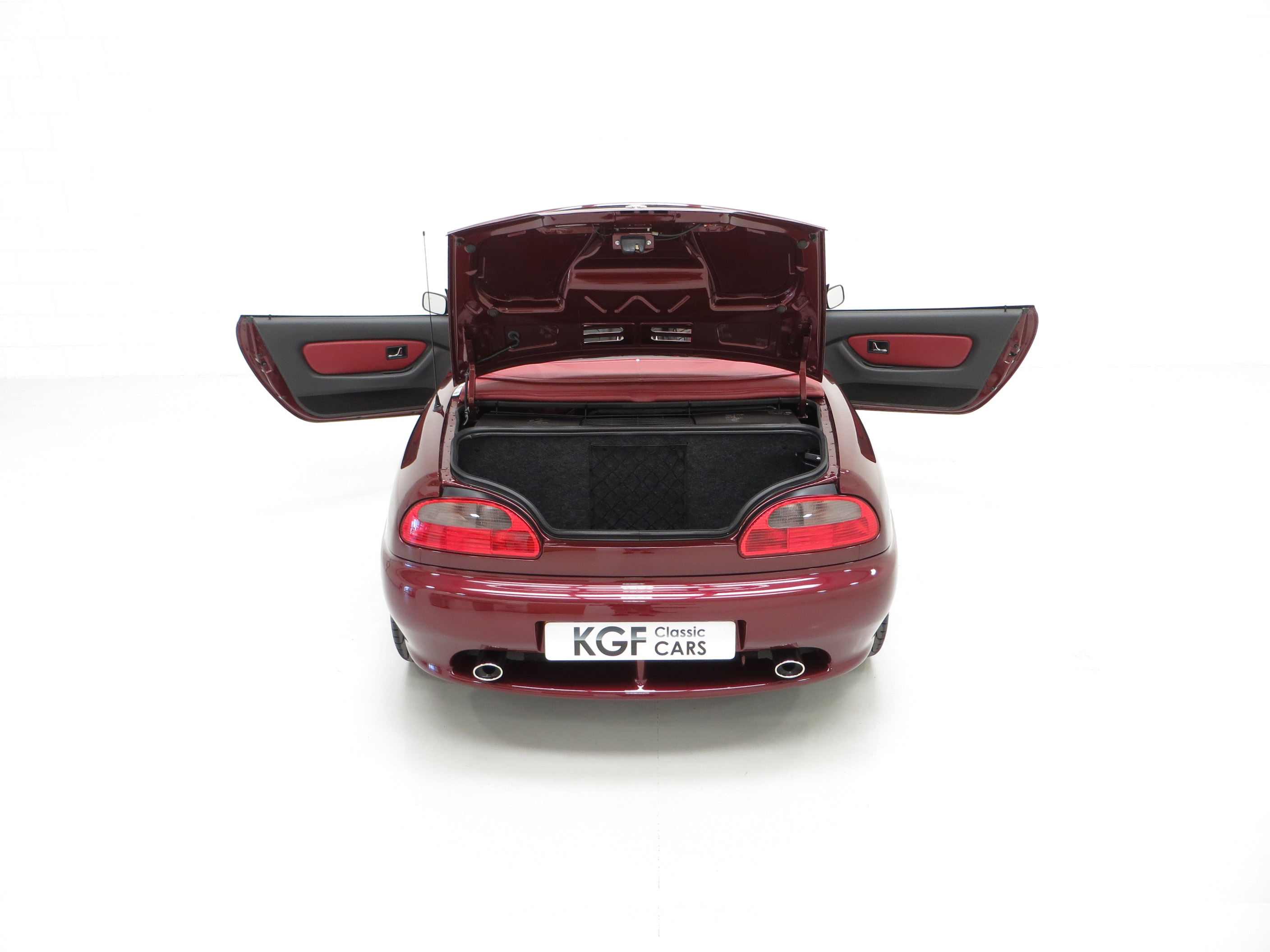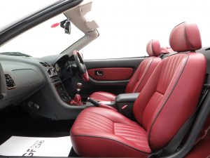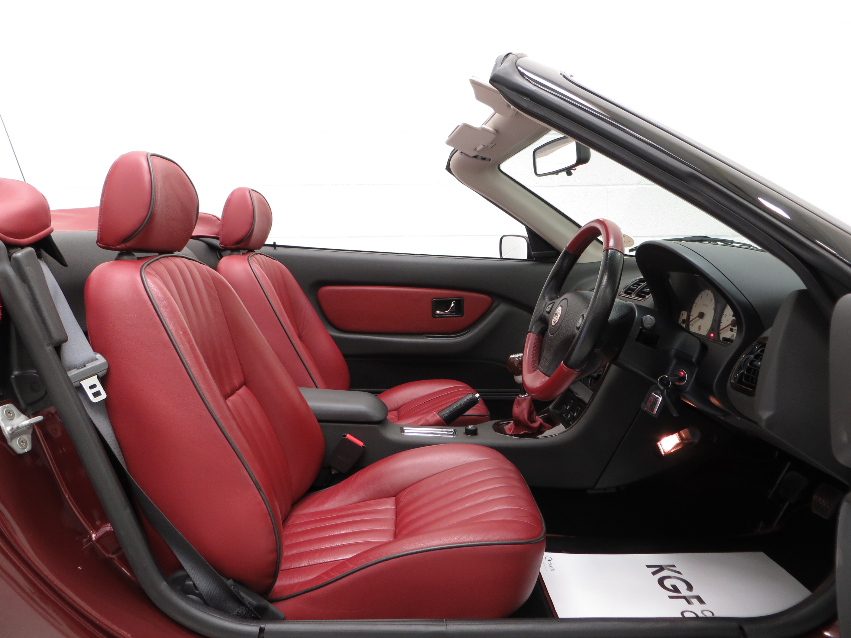 This very rare LE MGF 75th Anniversary, number 1171, is finished in stunning Mulberry Red, (Code CDM), one of just two colours available for the UK market. The deep gloss shine looks incredible and the contrasting black hood is the original with a clear rear screen and correct grenadine tonneau cover. A tiny ding to the offside rear panel and bonnet are only visible upon very close scrutiny along with a few stone chips to the air intakes. All trim and badging are in excellent condition including the unique bodyside 75th Anniversary badging, and the supplying dealer number plates remain fitted along with the tax disc holder. The bright stainless air intakes, dual front bright stainless grilles and chrome door handles were all standard fitment to this Limited Edition model. A truly pampered car representative of the incredible 12,956 miles covered.