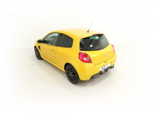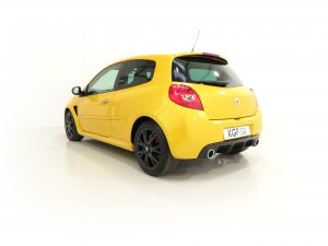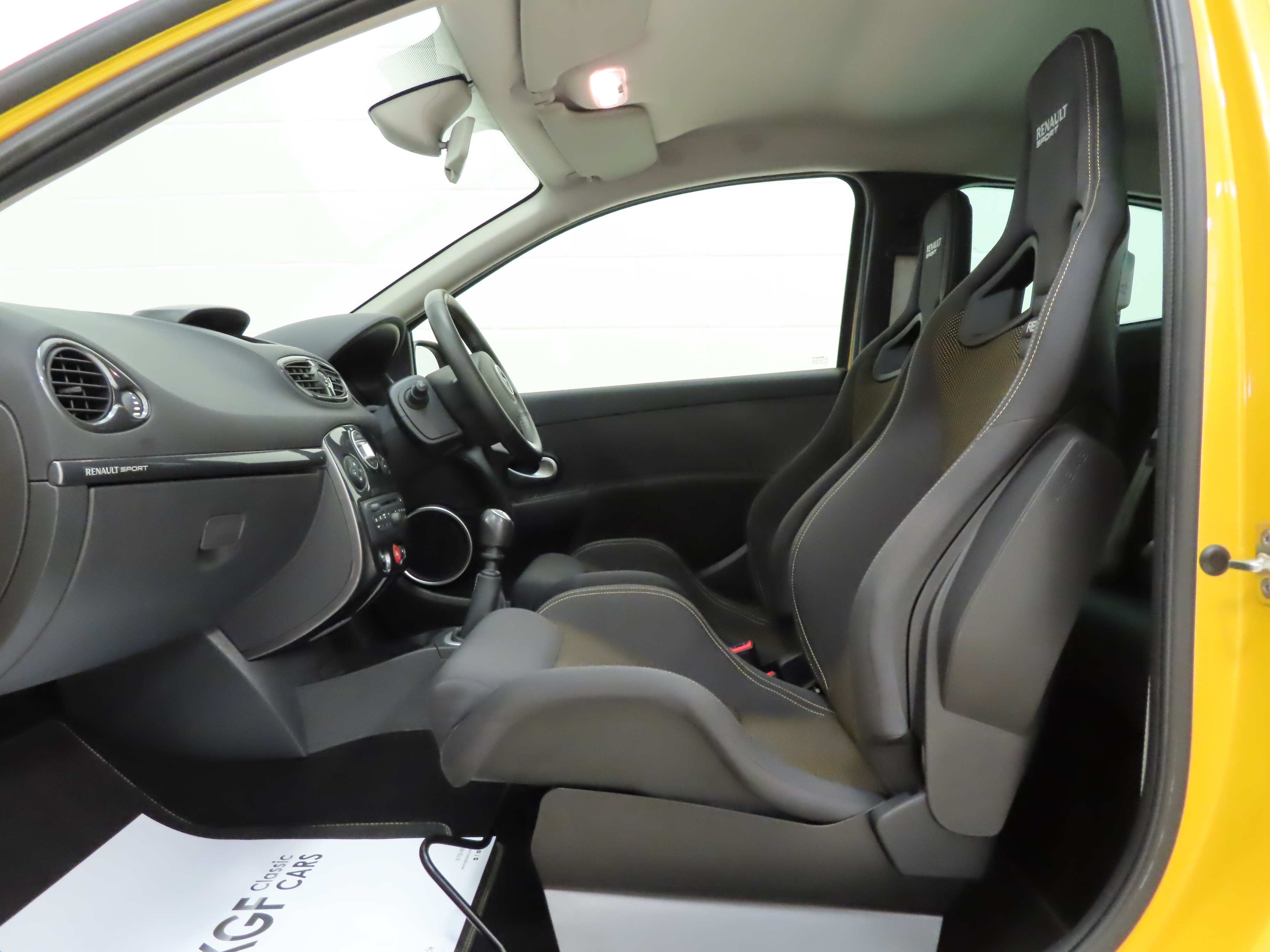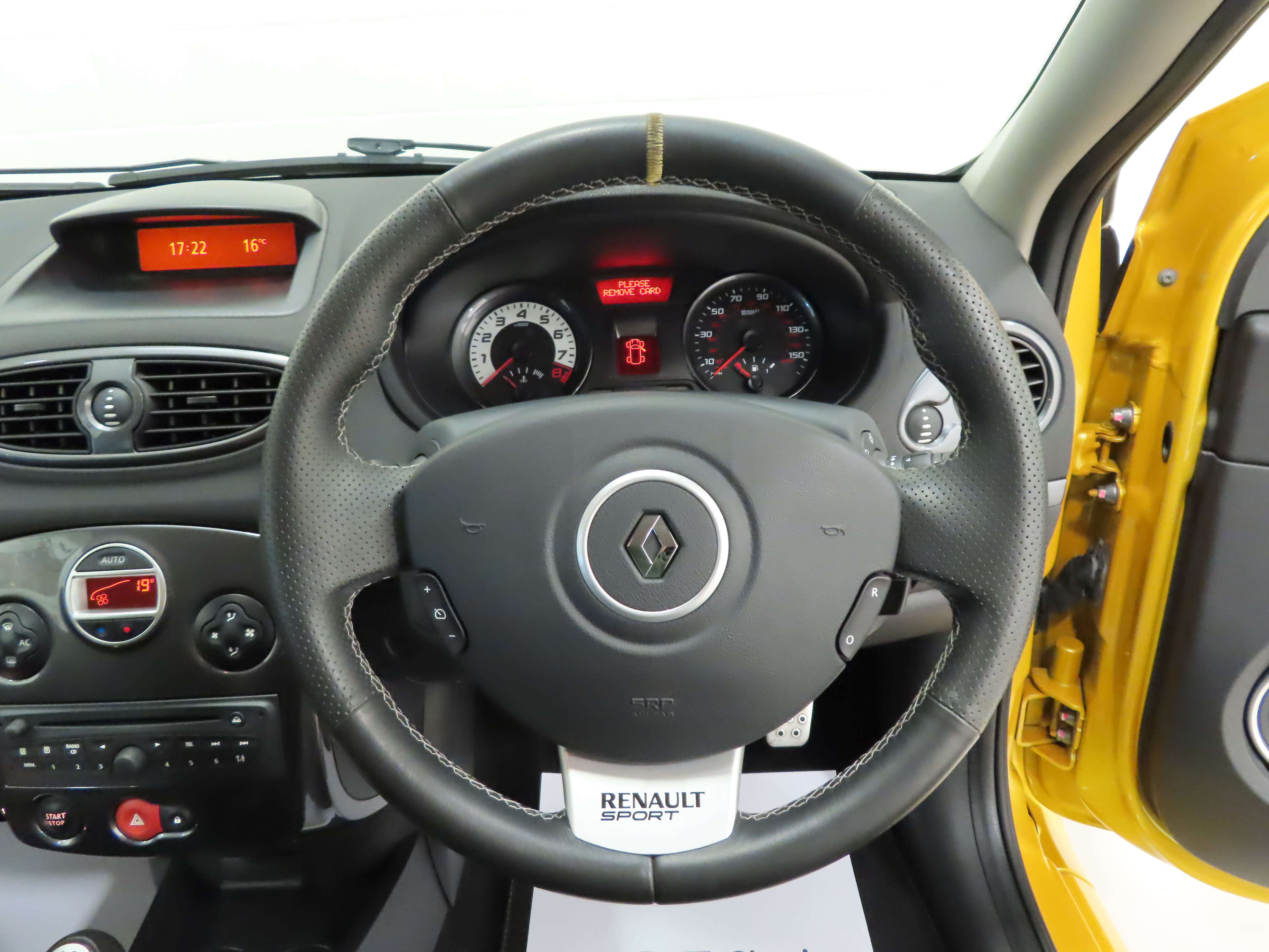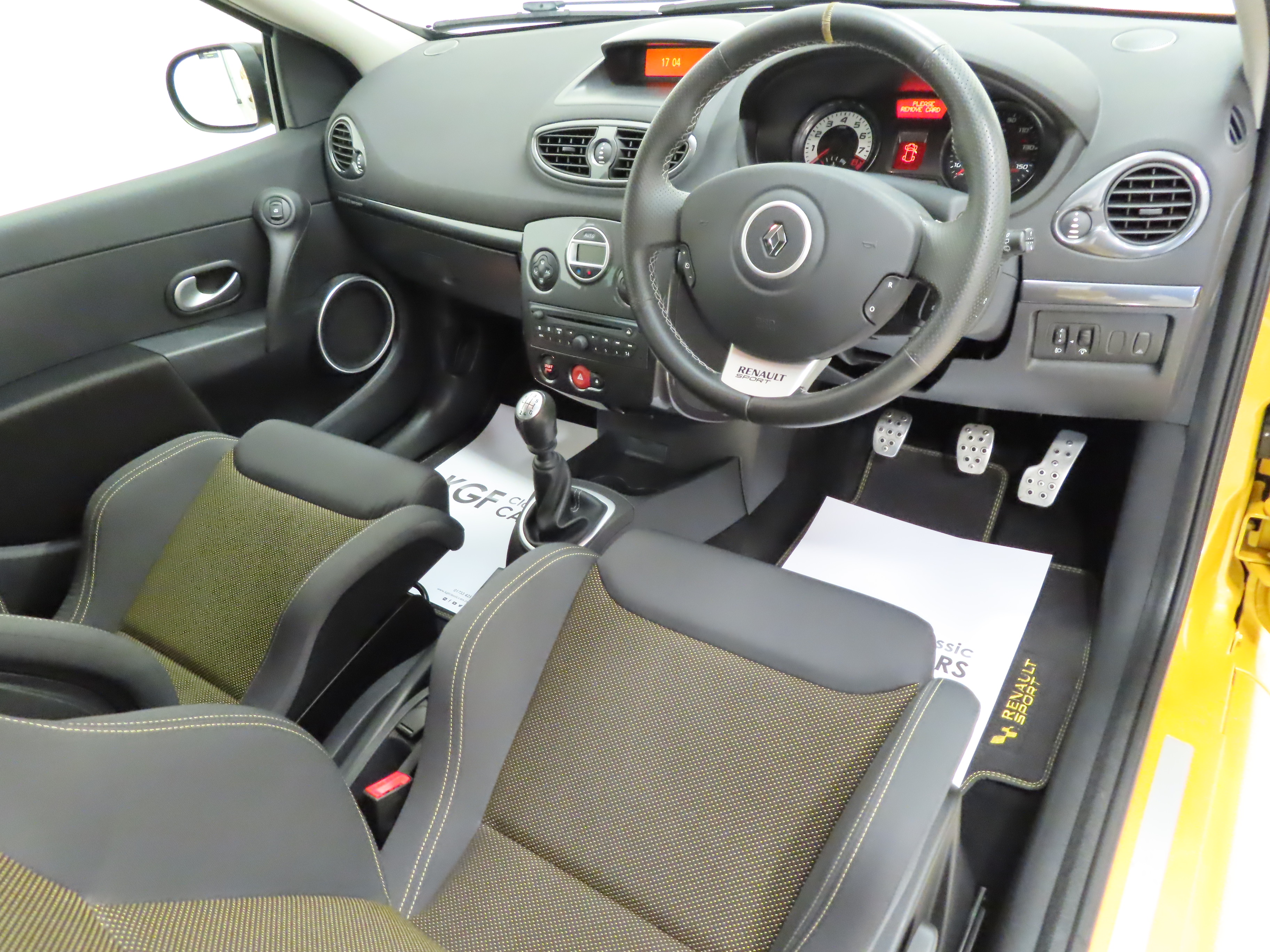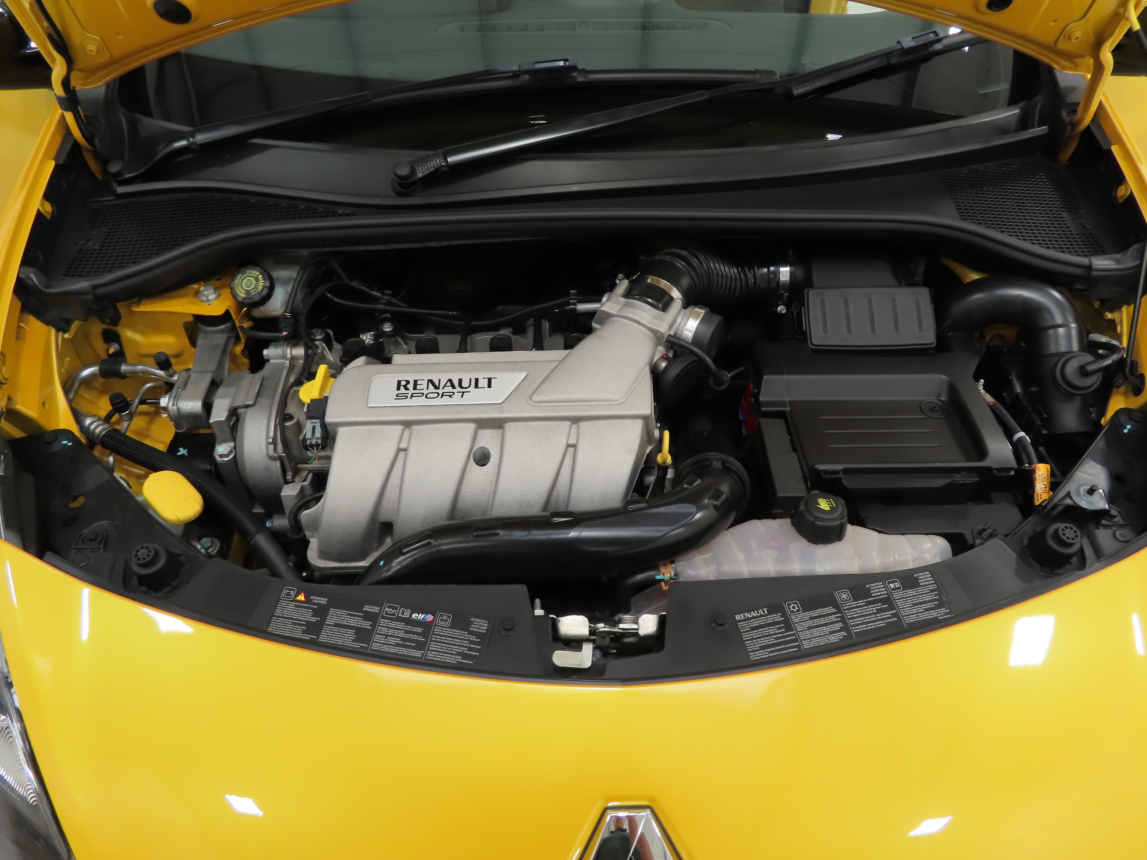 Black gloss rear diffuser with twin exhausts and front bumper trim, F1 style front blade, Renaultsport extended front wings with integrated side air-extractors, Renaultsport extended rear wings and sills, Satin chrome exterior styling to door handles and side door moulding, front fog lamps, electric door mirrors in gloss black, auto headlights and rain sensitive wipers, front and curtain airbags, ISOFIX, climate control, cruise control with speed limiter, rear headrests, drilled aluminium pedals, zinc Grey interior styling, Renault keyless entry with push button start, leather steering wheel with stitched centre band, electric front windows. Factory options; Liquid Yellow paintwork, Cup Chassis, rear GT spoiler, rear tinted glass, Satin Black Speedline alloy wheels, fixed cornering lights with black surrounds, Renaultsport Recaro front seats, Renaultsport monitor with onboard telemetry, Radio CD/MP3 with Bluetooth hands free. Renaultsport accessories; Renaultsport carpet mats.