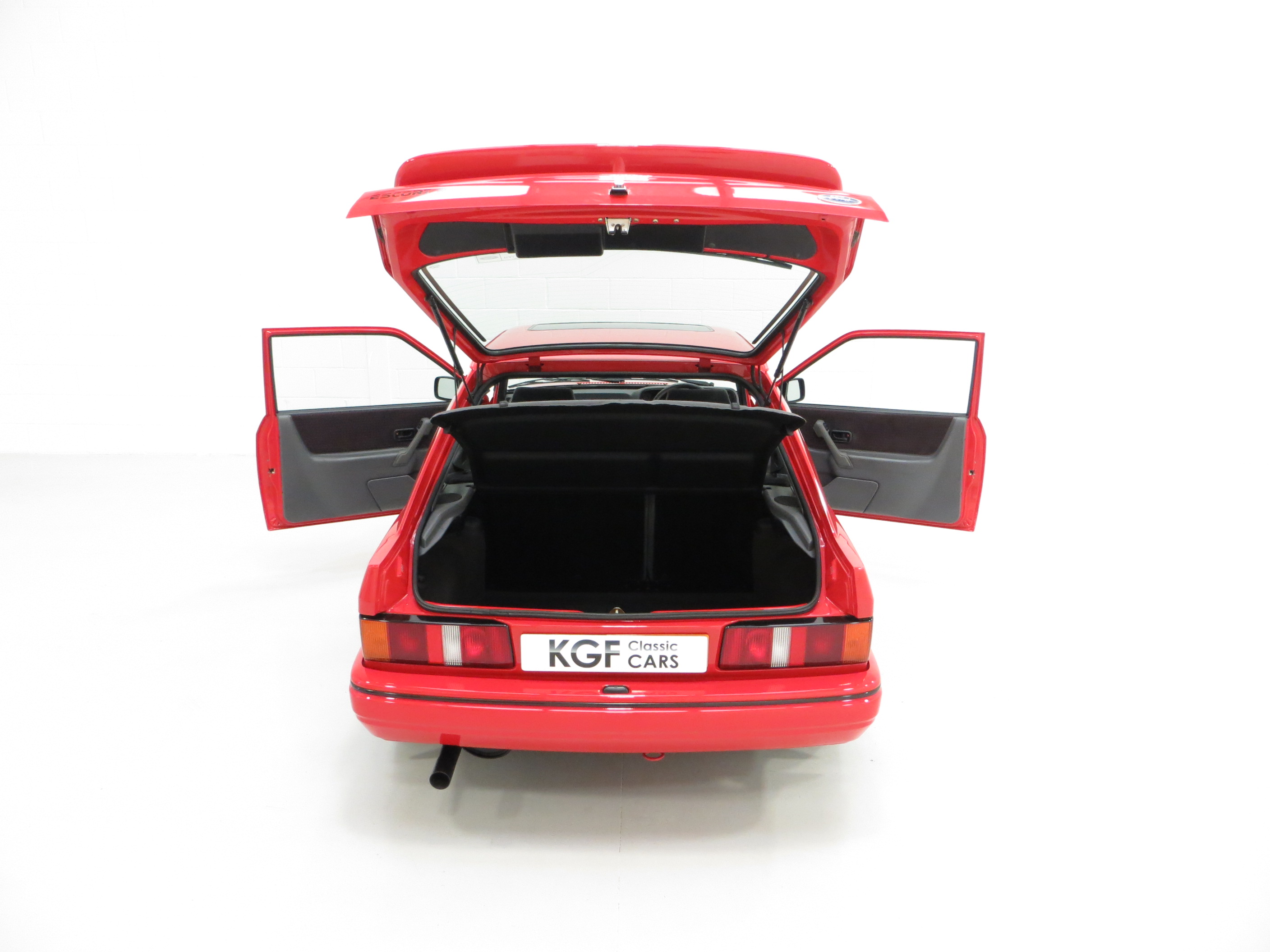This incredible early Series 2 example is finished in Ford Rosso Red, (Code R5), a colour used on the early examples prior to the switch to the more common Radiant Red. The paintwork displays an outstanding shine and uniform finish, a true credit to the dedicated ownership and verified low mileage. Close scrutineers will struggle to find anything more than the rear ford badge slightly tarnished and tiny age related marks, namely one to the nearside rear quarter. All factory panels are pin straight with uniform gaps and the trim sections, correct Carello/Ford lenses and RS decals are pristine and exactly as Ford intended. Originality seekers will be pleased to see the supplying Ford dealer number plates, rear screen sticker and factory etched glass. The eagle-eyed RS Turbo expert will note the black casing to the door mirrors, correct for a car with optional heated/electrically adjustable door mirrors. An unspoilt and preserved example, very difficult to better.