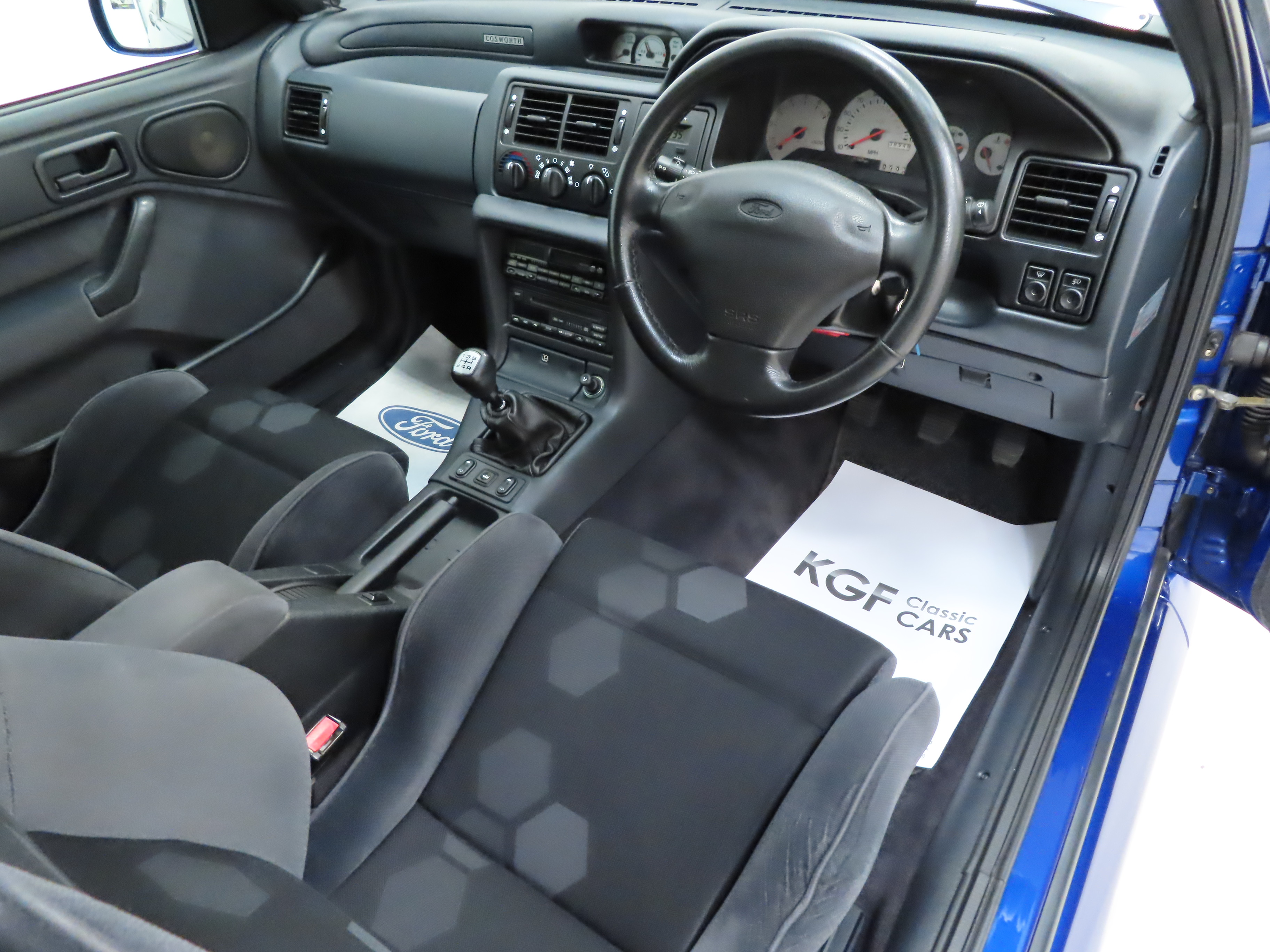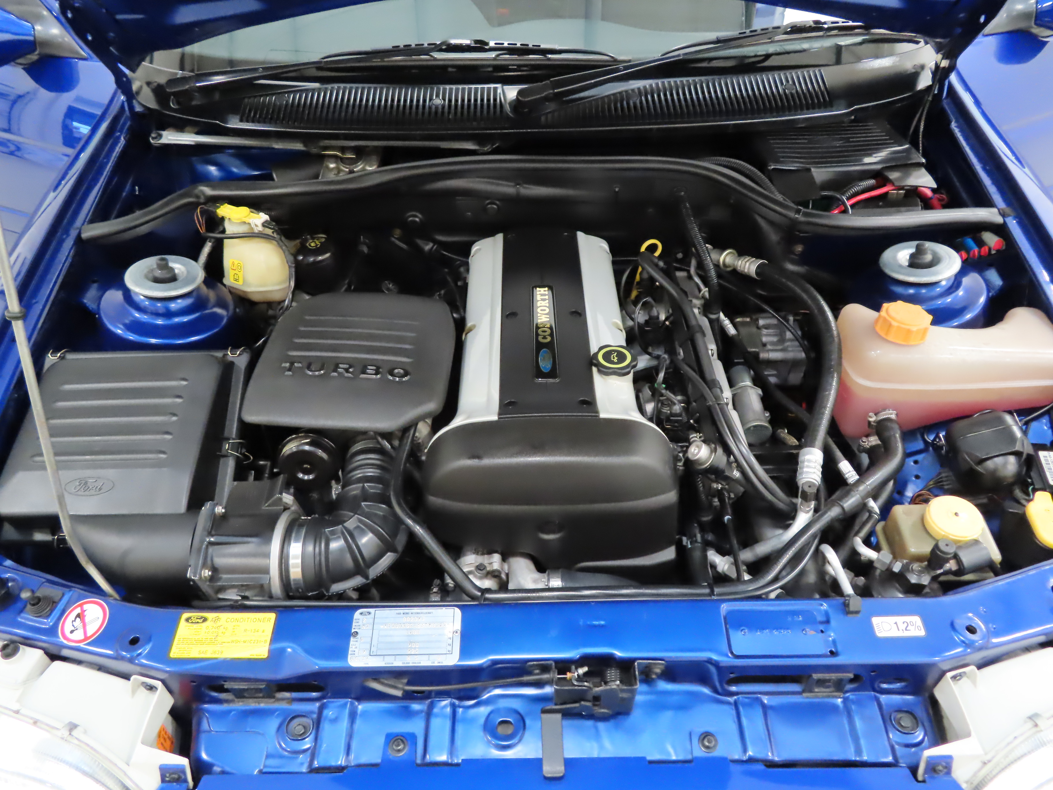 Body colour front bumper with black lower extension, front air dam, louvred bonnet air intakes, wing air extraction grilles, integral driving lights and fog lights, driver airbag, central double locking, padded armrest with cassette storage, oil pressure gauge, turbo gauge, voltmeter, quartz digital clock with ambient temperature, white sports dials, Ford 2007 RDS radio/cassette. Factory Options; Luxury Model comprising of; electrically operated and heated door mirrors, ‘Quickclear’ heated windscreen, heated washer jets, three-spoke leather covered steering wheel, rear centre armrest, rear head restraints, electric sunroof, electric windows, carpeted door bins. Air conditioning, CD player Model 2040.