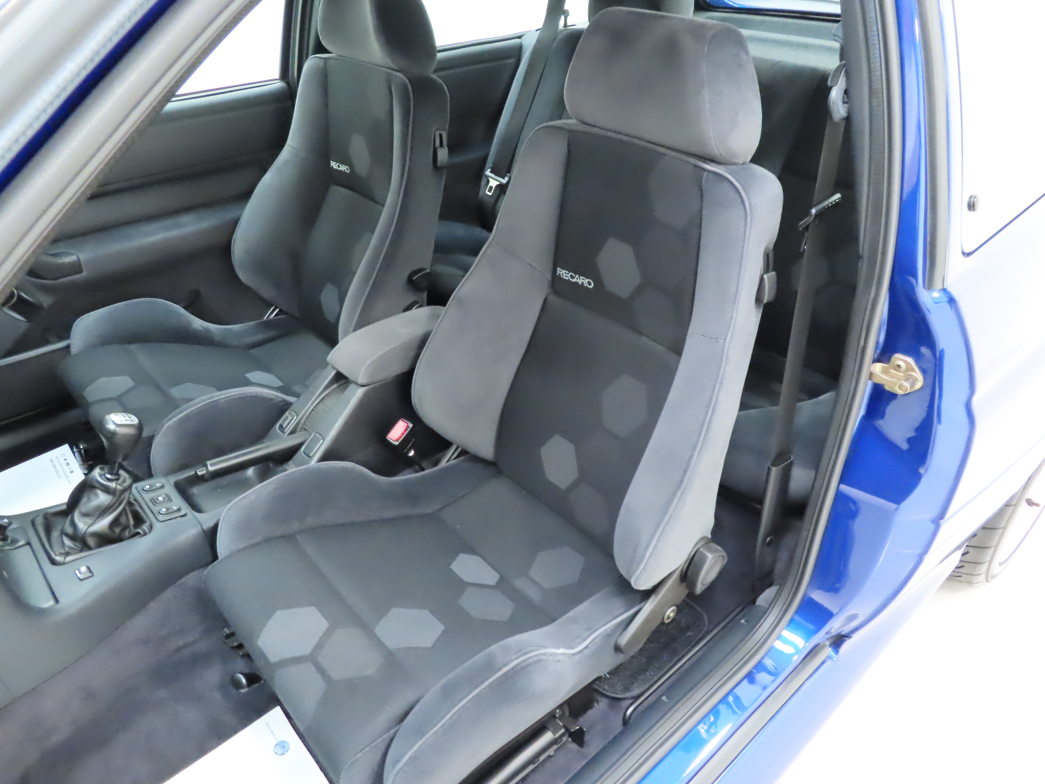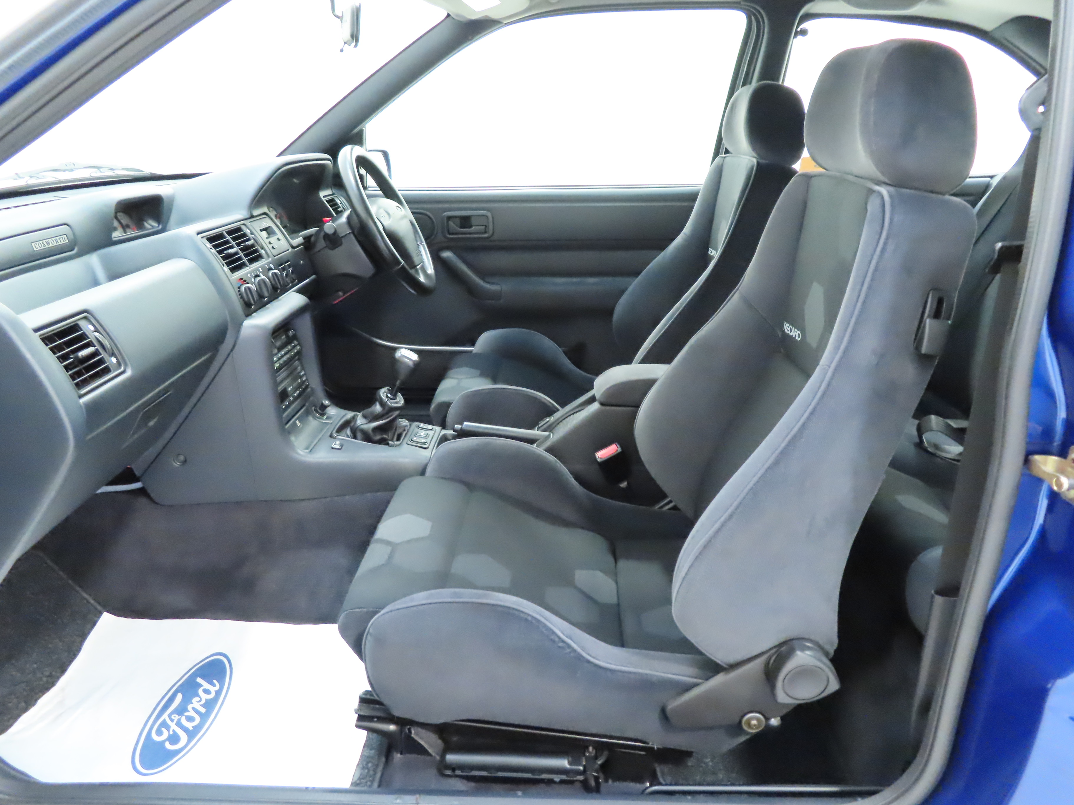The exhilarating exterior of this Escort RS Cosworth is nothing short of magnificent finished in striking Imperial Blue Metallic, (Code H3). The paintwork boasts an impeccable shine thanks to cherished upkeep and Carcoon storage. Ford claimed 400 unique components for the exterior of the Escort Cosworth from the integral front wing air extension grilles to the unique whale tail to generate aerodynamic downforce reinstated on this once aero-pack delete example. All exterior trim, lights, badges and rubbers are excellent and the correct Ford window Security System stickers remain fitted as well as Ford Main Dealer number plates. The vulnerable adjustable splitter to the lower front spoiler is fully intact with a few marks. A preserved underside featuring a stainless exhaust with the correct oval tailpipe is structurally perfect. An amazing example of this Ford RS legend.