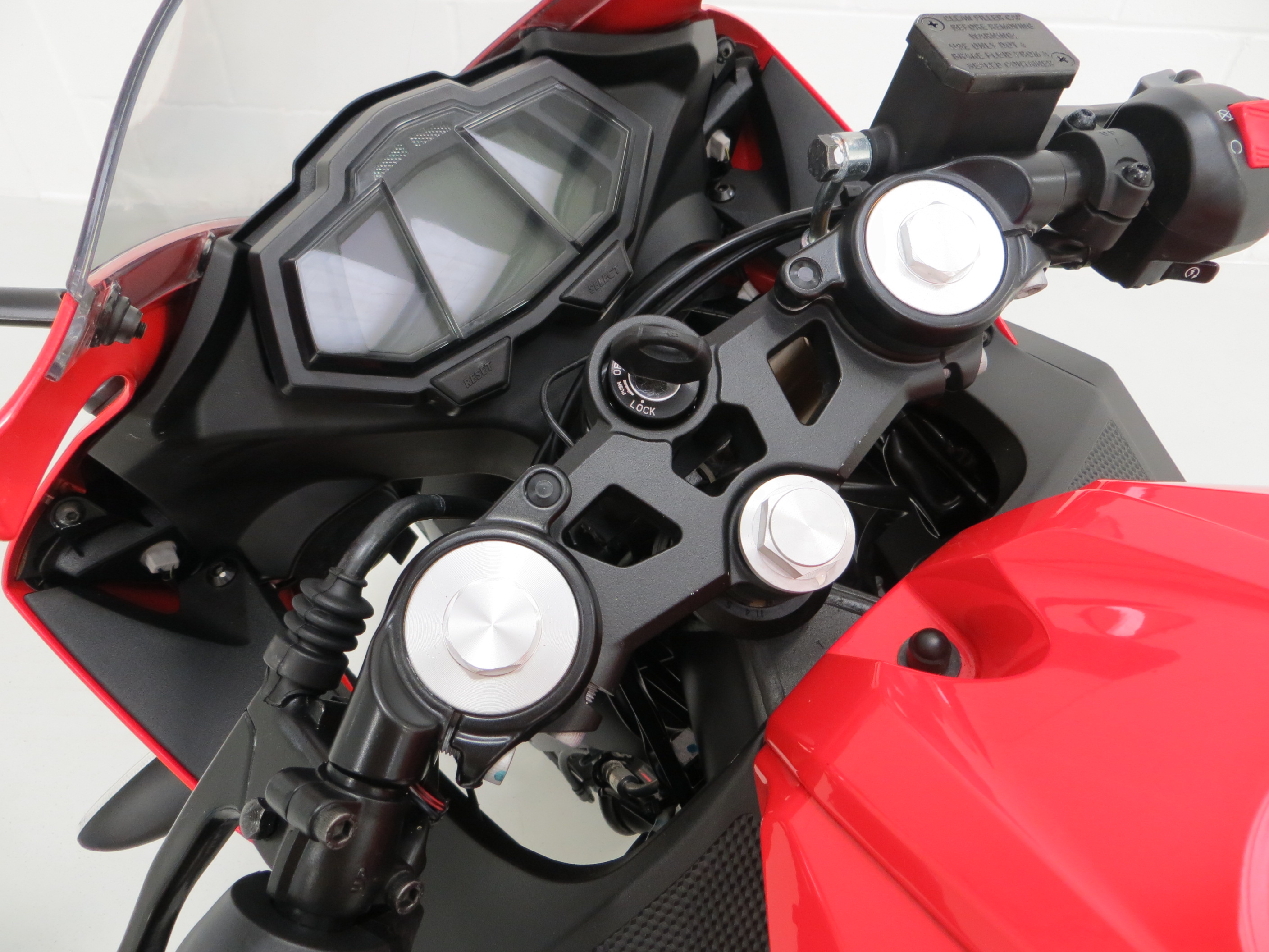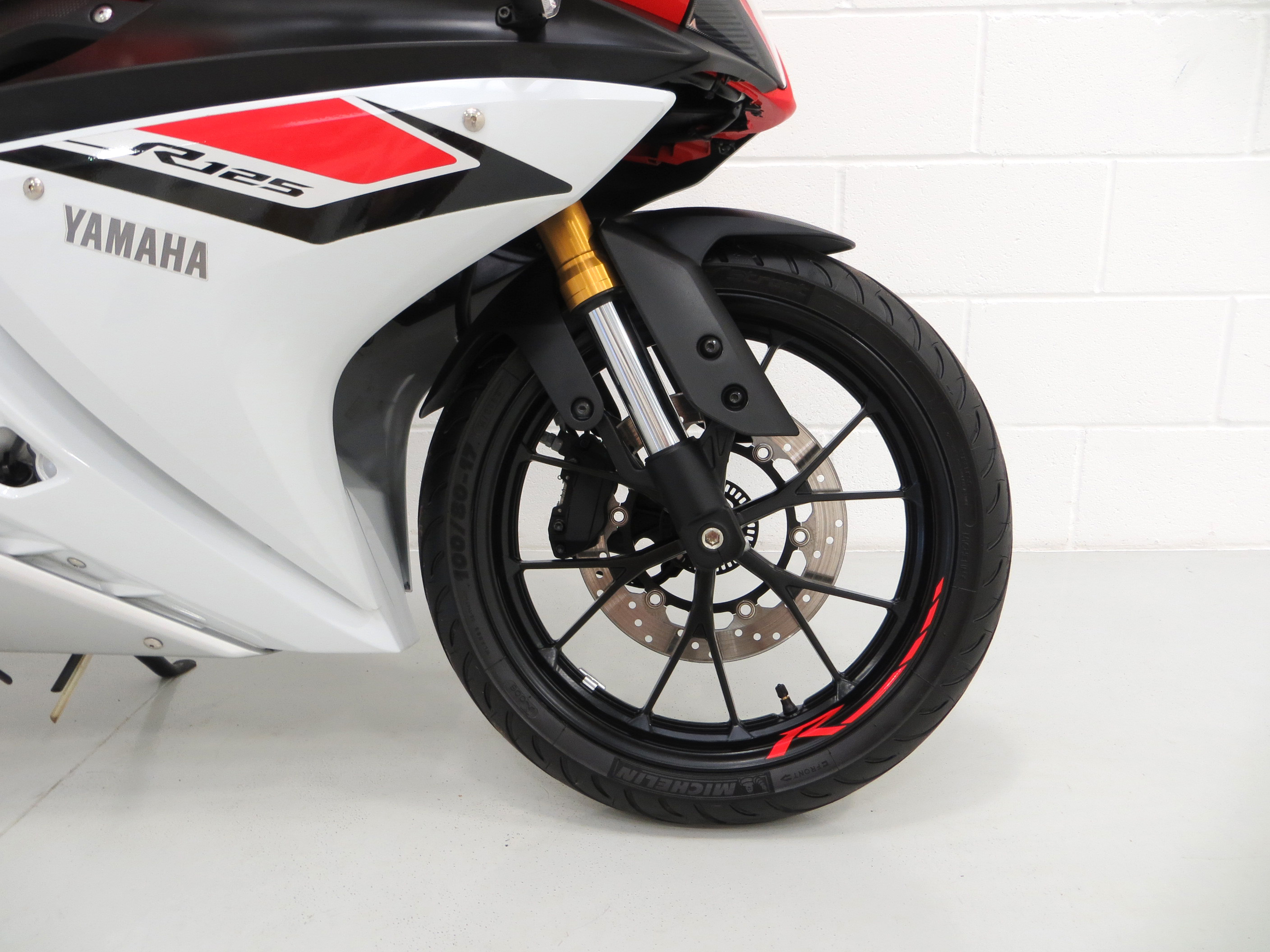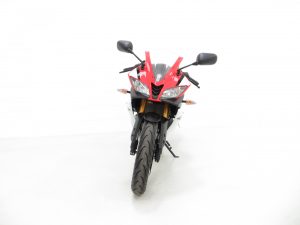 The racy 17in Y-spoke alloys wheels in gloss black have bright red R inscription and are in pristine order with no damage. Factory Michelin 100/80-17 front and 130/70-17 rear tyres have covered just 382 miles and are just about bedded in! The powerful ABS brakes feature a 292mm front disc and 230mm rear disc to offer tremendous stopping power.