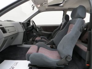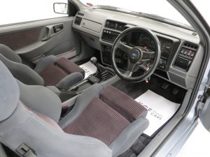 The iconic styling of the Sierra RS Cosworth is instantly recognisable and a real barnstormer. Finished in optional Ford Moonstone Blue, (Code K6), the uniform paintwork is tremendous and displays the correct orange peel finish throughout. All panels are factory original with correct ’86 year date stampings and seam welds to the front wings with the tiny Ford logos visible to those who know where to look. The exterior trim is in excellent order and the front lower rubber splitter, often distorted, retaining correct shape. The glass displays the original number and dots dated Securit etchings, and accuracy seekers will be pleased to see the original Cibie headlamps. The glass is number plate etched and the front screen has delaminated slighted to the lower bottom edge. Supplying Ford dealer number plates and rear screen sticker remain fitted. A truly sensational car commensurate with the incredibly pampered care and true to the original Ford SVE Department design.