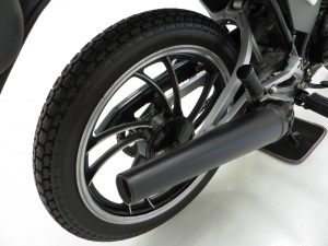 Being an UK 12A restricted bike, this liquid-cooled 123cc single-cylinder power unit delivers 12.2bhp at 7,500rpm and 8.68 ft lbs at 7000rpm, enough to allow a top speed of 70mph. Incredibly it still has the original factory engine and the number stamped into the engine matches the frame number, both clearly visible. The component engine parts are clean and present very well. The close-ratio six speed gearbox operated via a slick, remote linkage offers fast and sure gear changes. (Please note the bike has formed part of a static display for many years and although fully operational, is being sold requiring full recommissioning).