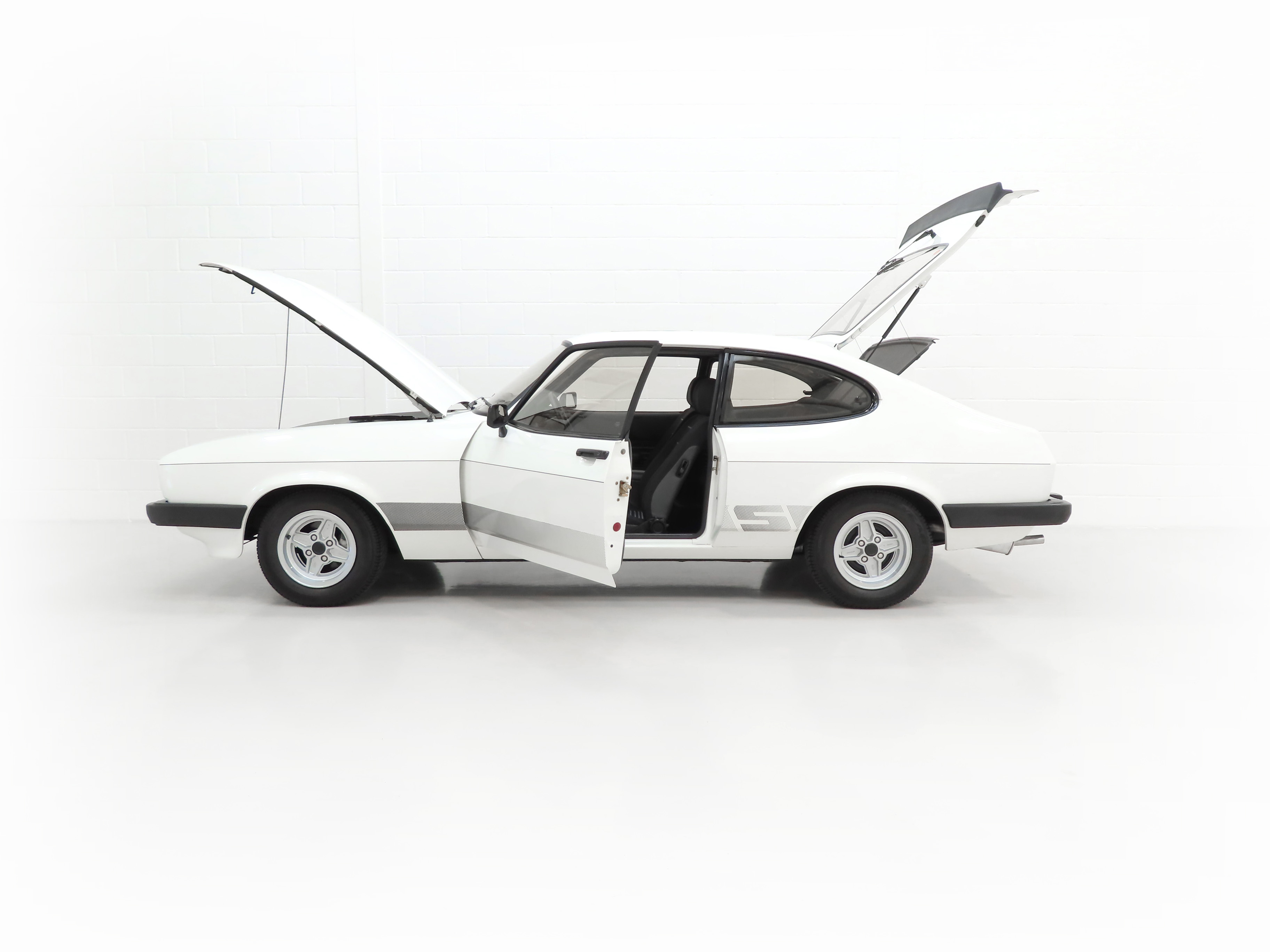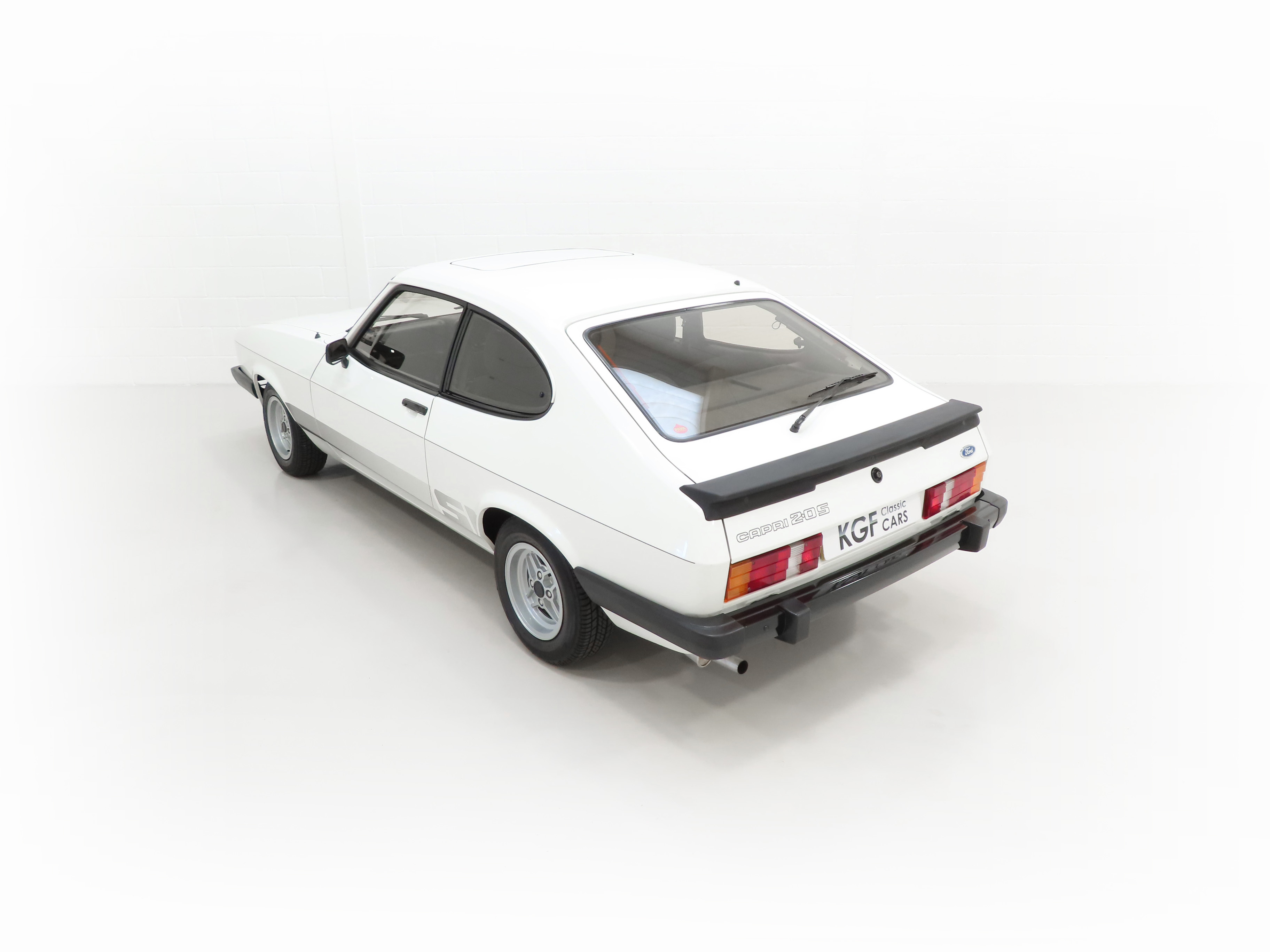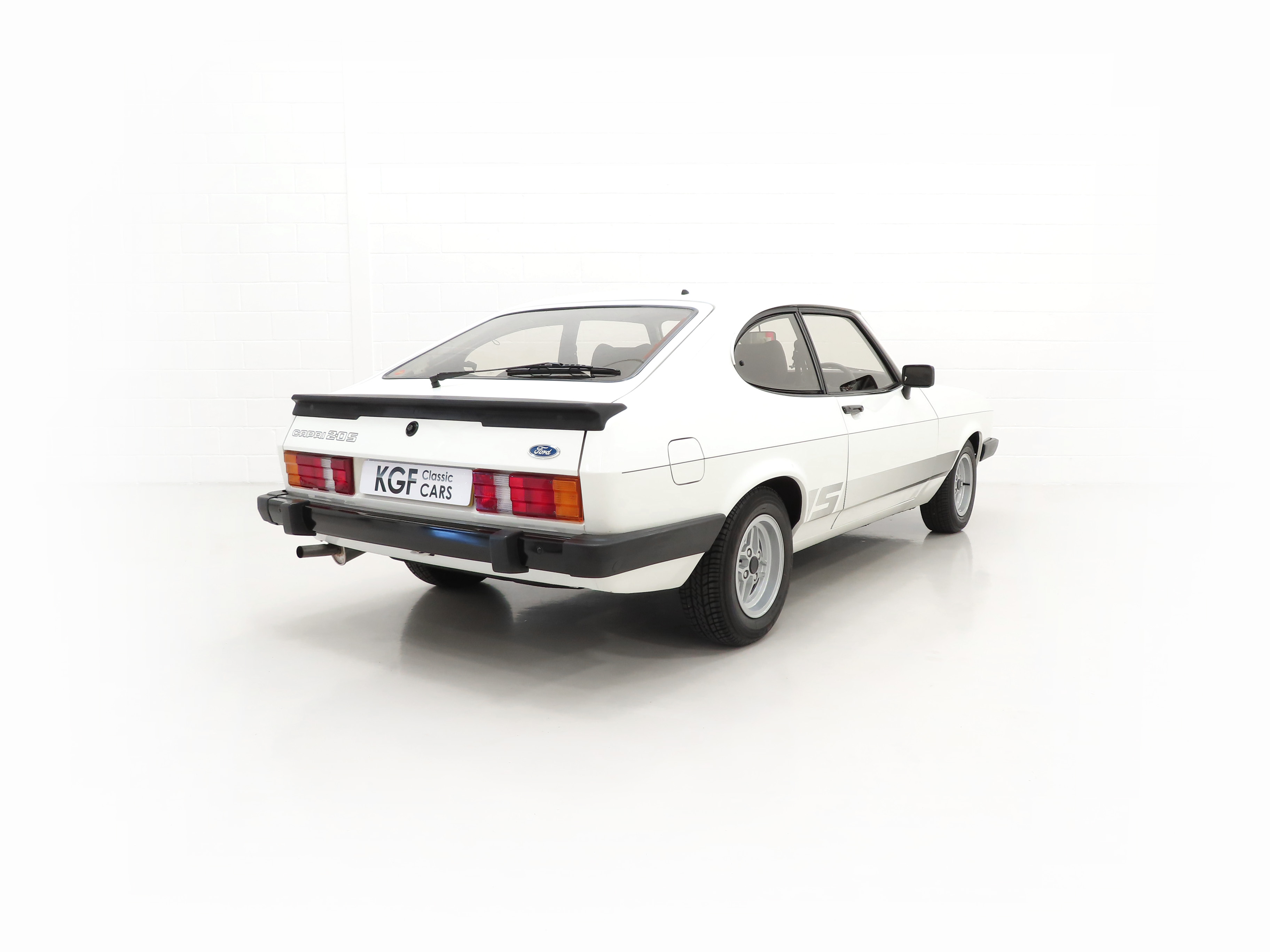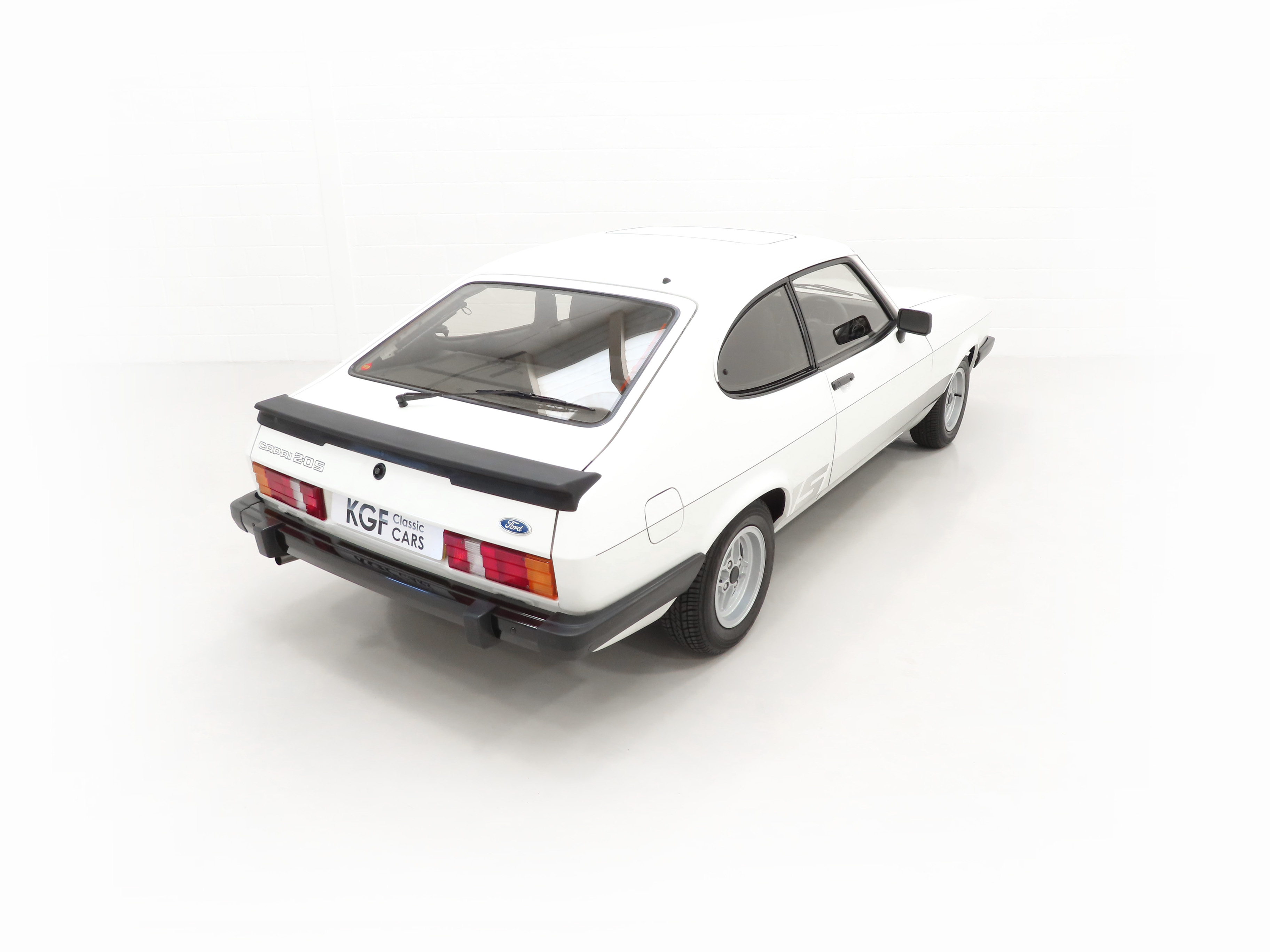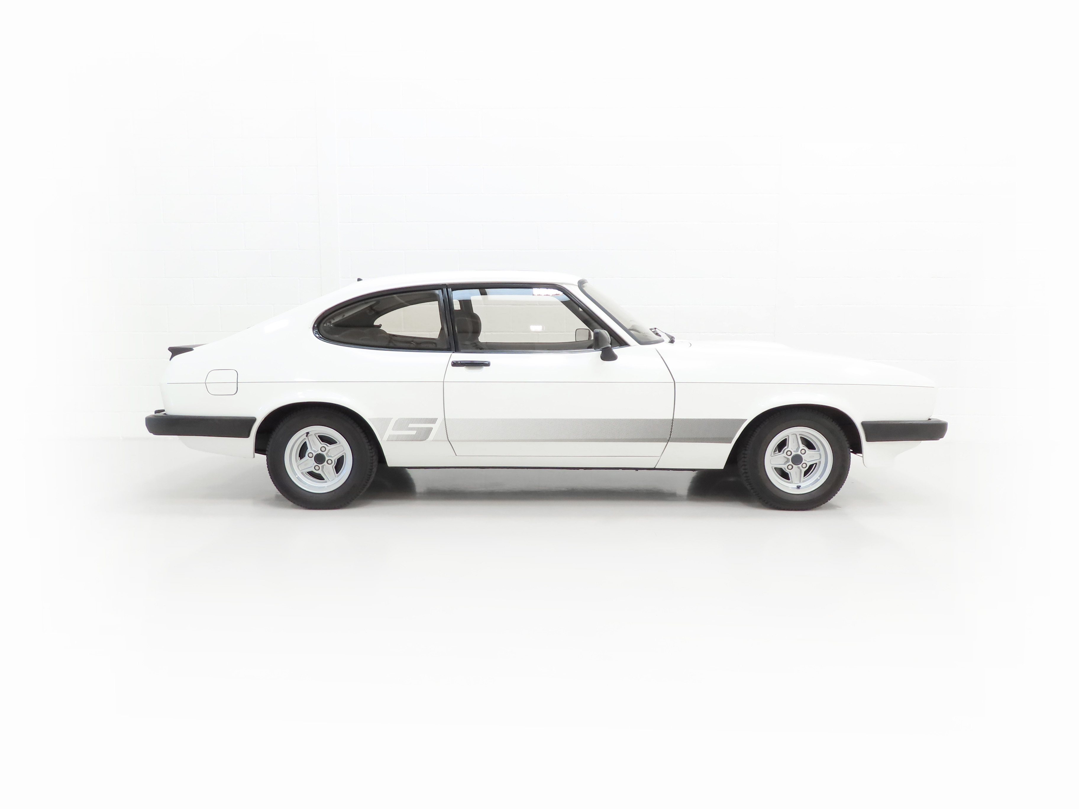 This Capri S is a real drivers car finished in stunning Diamond White, (B3), and boasts a glorious shine. The smart ‘S’ stripes subtly shaded are the originals along with an unbroken pinstripe and contrast perfectly against the white paintwork. The tiniest of marks can only be seen under intense scrutiny and favoured by most knowing the car is factory original. The four Hella headlamps are crystal clear and the rubberised rear spoiler along with all other black seals and rubbers are straight and soft being carefully garaged stored since new. All tinted glass is unmarked and the car still wears the dealer supplied front and rear number plates. The underside has been preserved perfectly thanks to Pava rustproofing from new with the rear screen sticker still attached. With the same suspension setup derived from the highly acclaimed 2.8 Injection and sporting visual enhancements, this is a special Capri model.