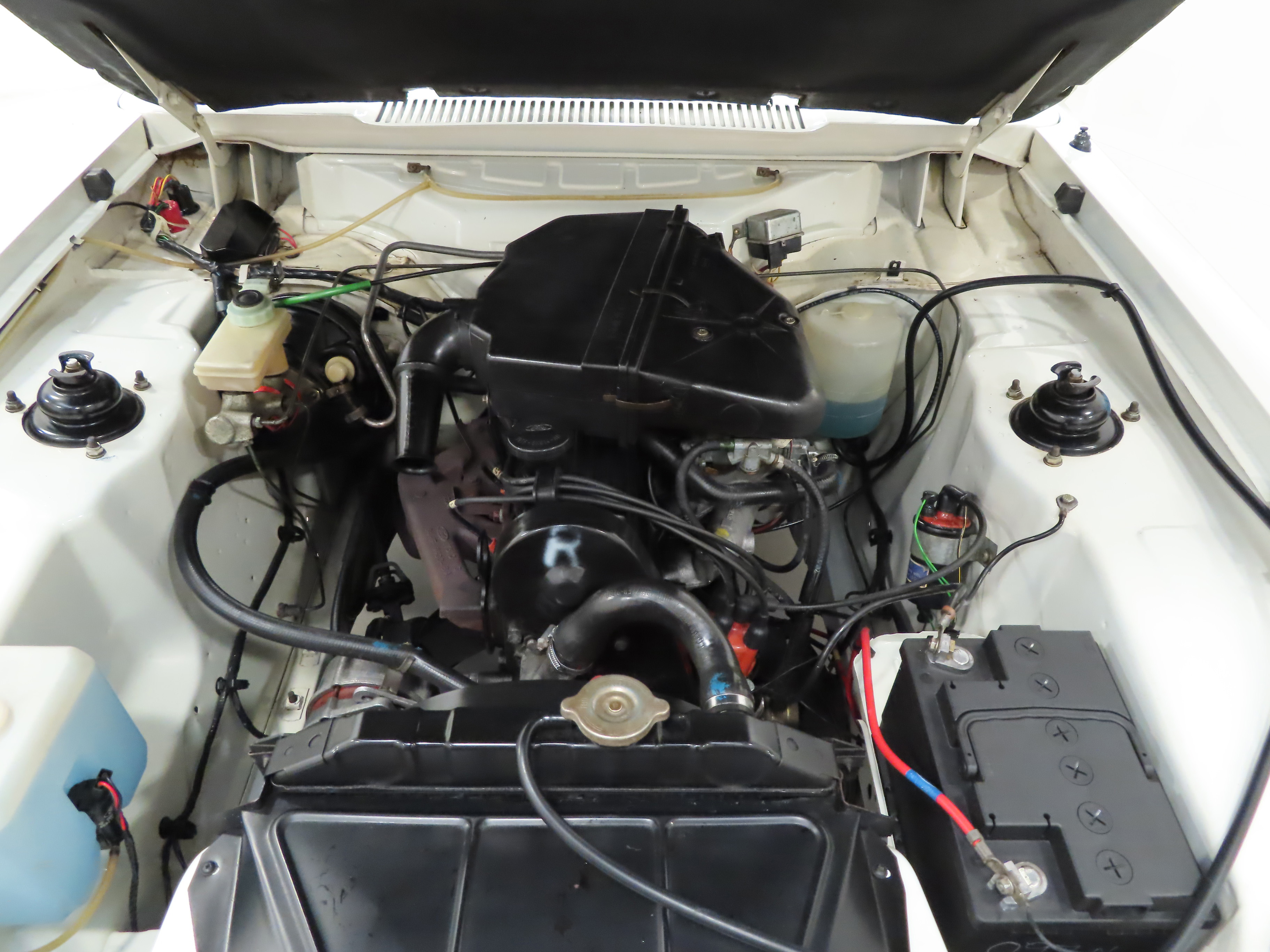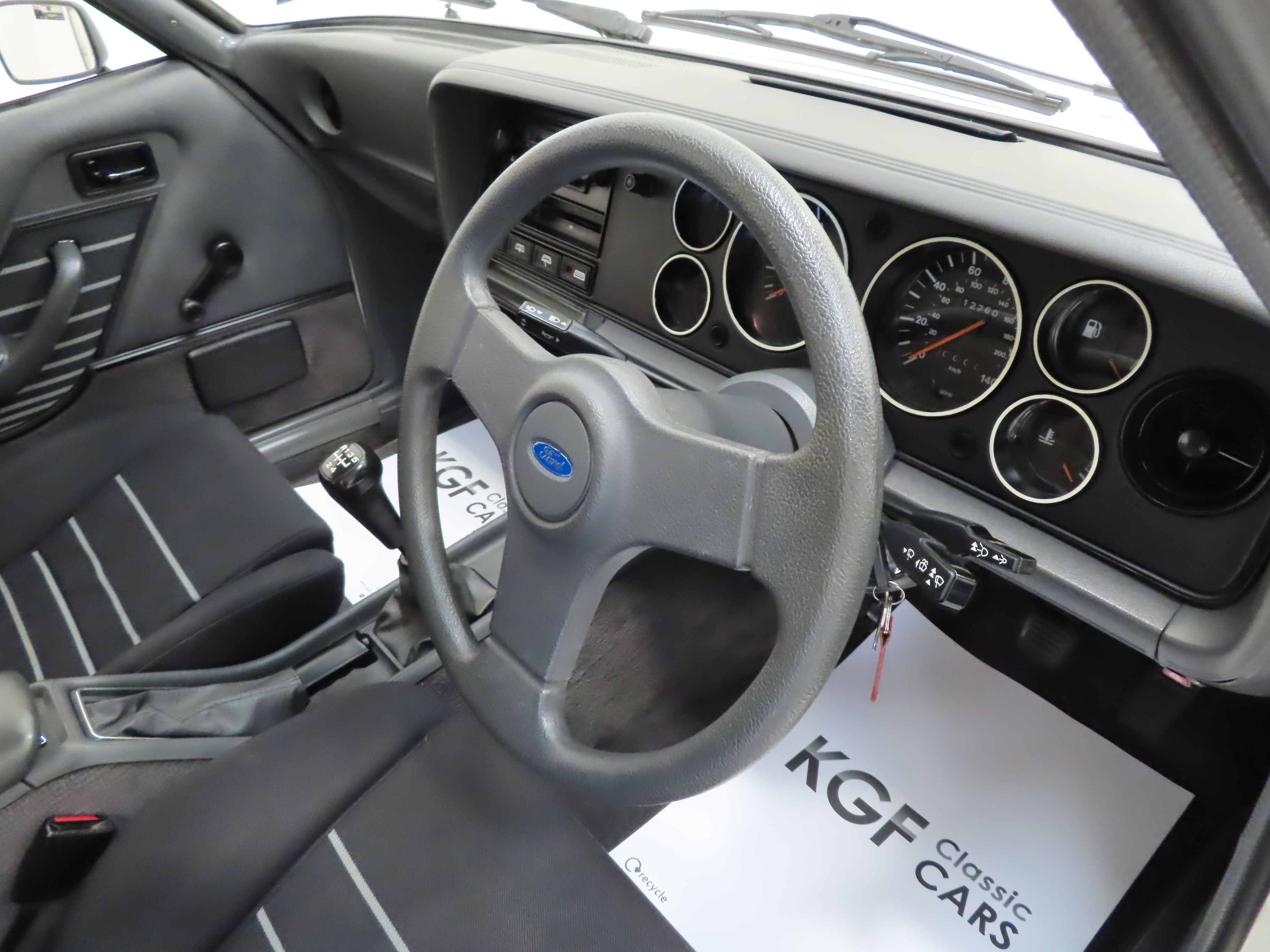 Helping the cabins sporty look are seats finished in the Grey Laser fabric trim, (Code QL), with matching pristine door and quarter panel inserts. Spotlessly clean, the driver’s seat base edge is slightly dipped with no wear. Luxury features like the cut-pile carpet, adjustable head restraints and front centre armrest are all in splendid condition and the soft feel instrument panel has no cracks. All controls fully function including the two-speed heater fan, analogue quartz clock and Ford P32 radio. The boot area houses the original jack and virgin spare wheel with Grandprix Goodyear tyre still with coloured banding to the tread. The parcel shelf is pin straight and untouched and factory sticker remains attached to the boot floor. An iconic and instantly familiar classic Ford interior.