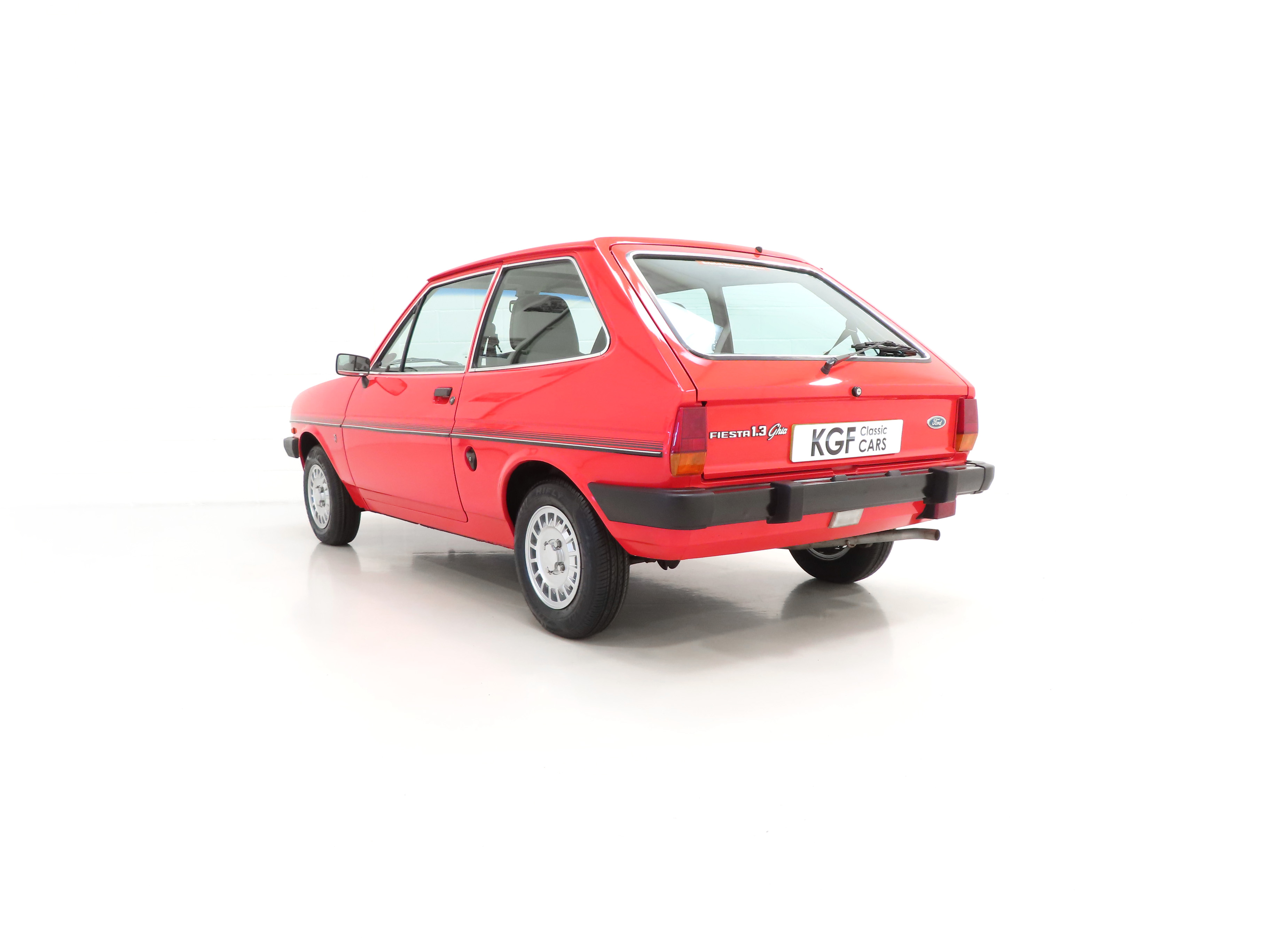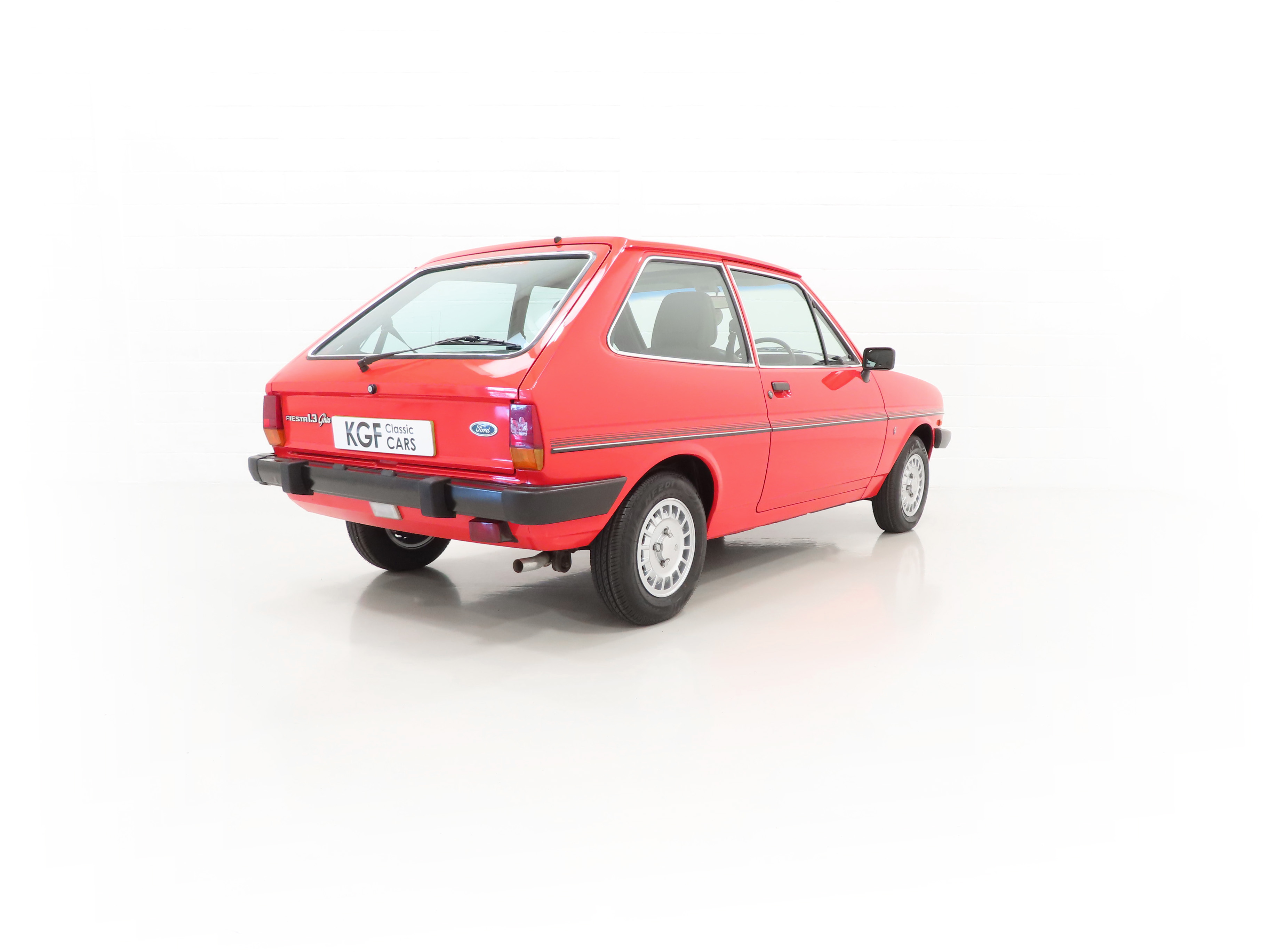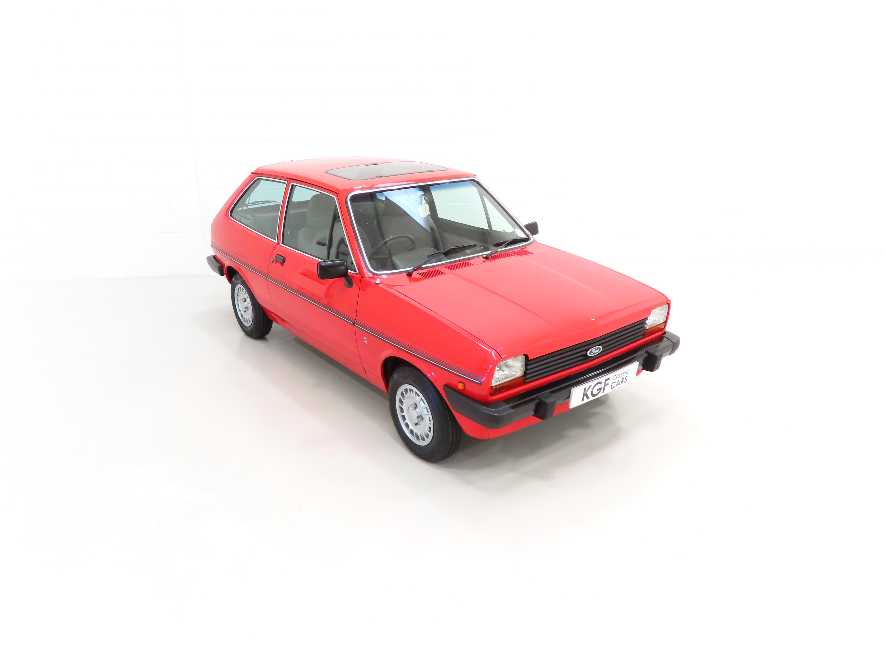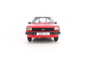 This beautiful and rare surviving luxury flagship Fiesta is finished in gleaming Ford Sunburst Red, (Code P 1), and showcases a deep lustrous shine throughout. Close scrutiny will reveal nothing other than light aged related markings including some imperfections to the rear bumper, but overall the very bright appearance should please the blue oval enthusiast. All factory fit panels are straight and front wings have the date stamp and oval Ford emblem stamp clearly visible. The unmolested appeal of this special vehicle is accentuated by standard trim sections and Ghia specific badges and decals all present, correct and in remarkable order. Dealer logo number plates and rear screen sticker remain fitted. A true testament to Ford’s beloved first generation Fiesta, wonderfully preserved for our enjoyment and ultra-rare in luxury Ghia form!