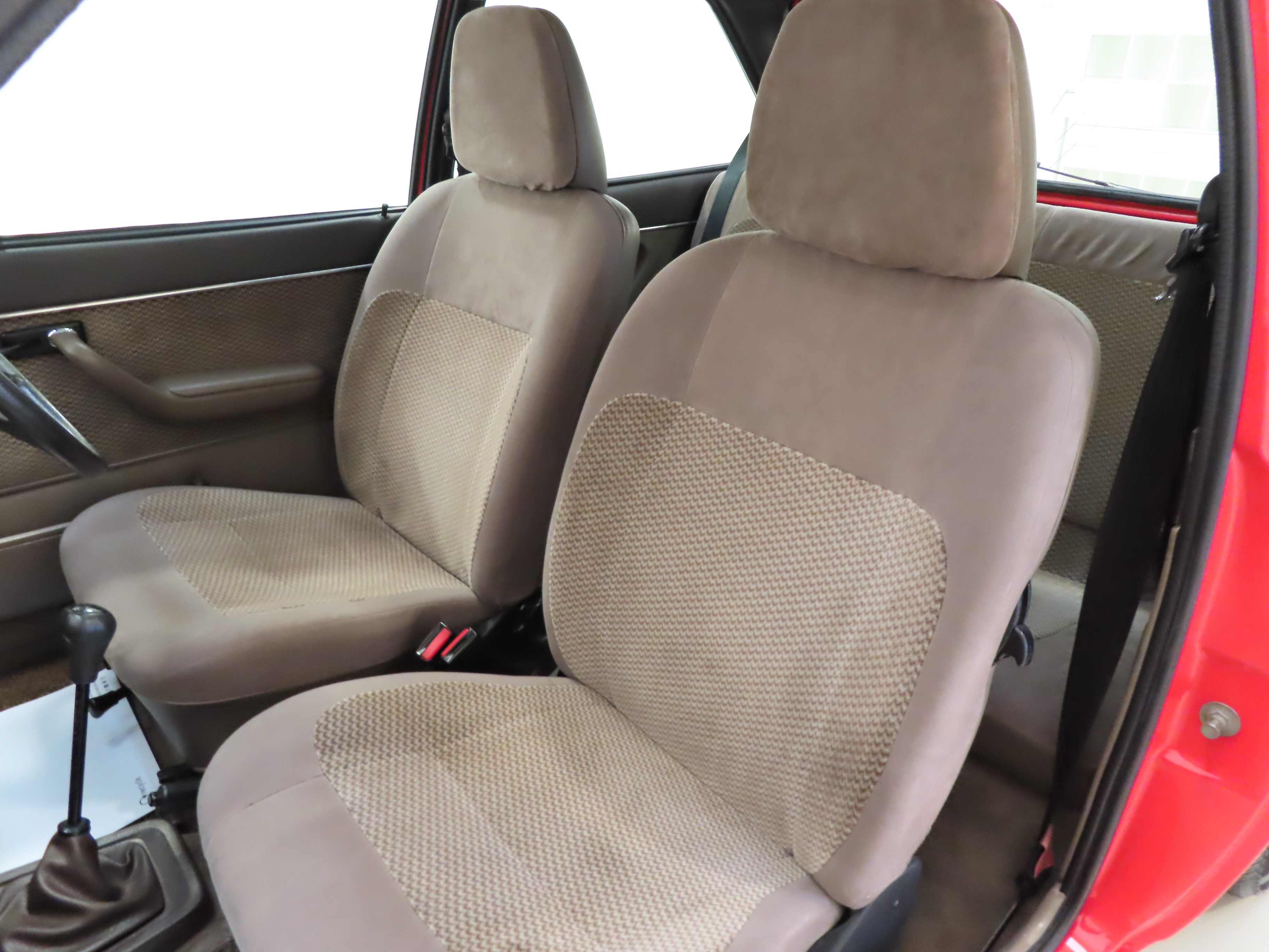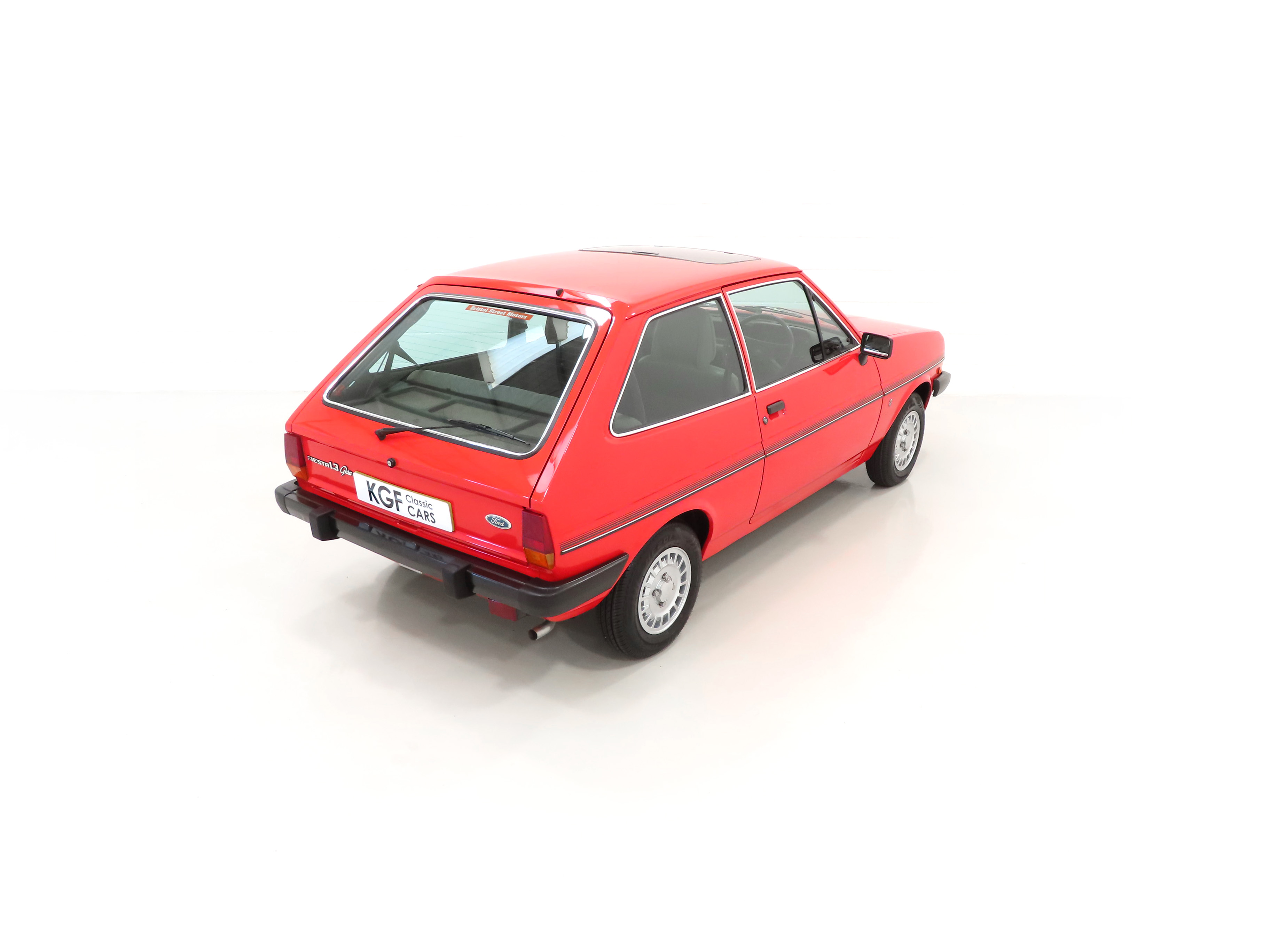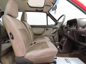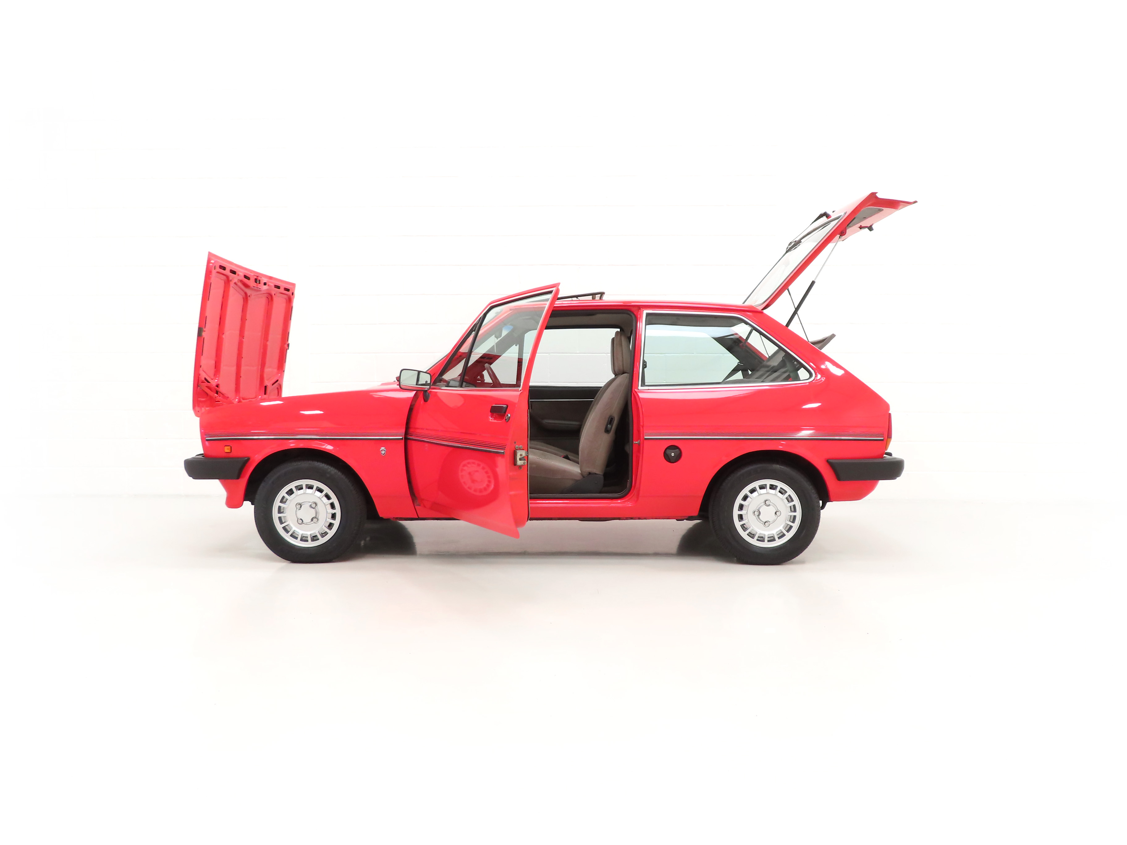This beautiful and rare surviving luxury flagship Fiesta is finished in gleaming Ford Sunburst Red, (Code P 1), and showcases a deep lustrous shine throughout. Close scrutiny will reveal nothing other than light aged related markings including some imperfections to the rear bumper, but overall the very bright appearance should please the blue oval enthusiast. All factory fit panels are straight and front wings have the date stamp and oval Ford emblem stamp clearly visible. The unmolested appeal of this special vehicle is accentuated by standard trim sections and Ghia specific badges and decals all present, correct and in remarkable order. Dealer logo number plates and rear screen sticker remain fitted. A true testament to Ford’s beloved first generation Fiesta, wonderfully preserved for our enjoyment and ultra-rare in luxury Ghia form!