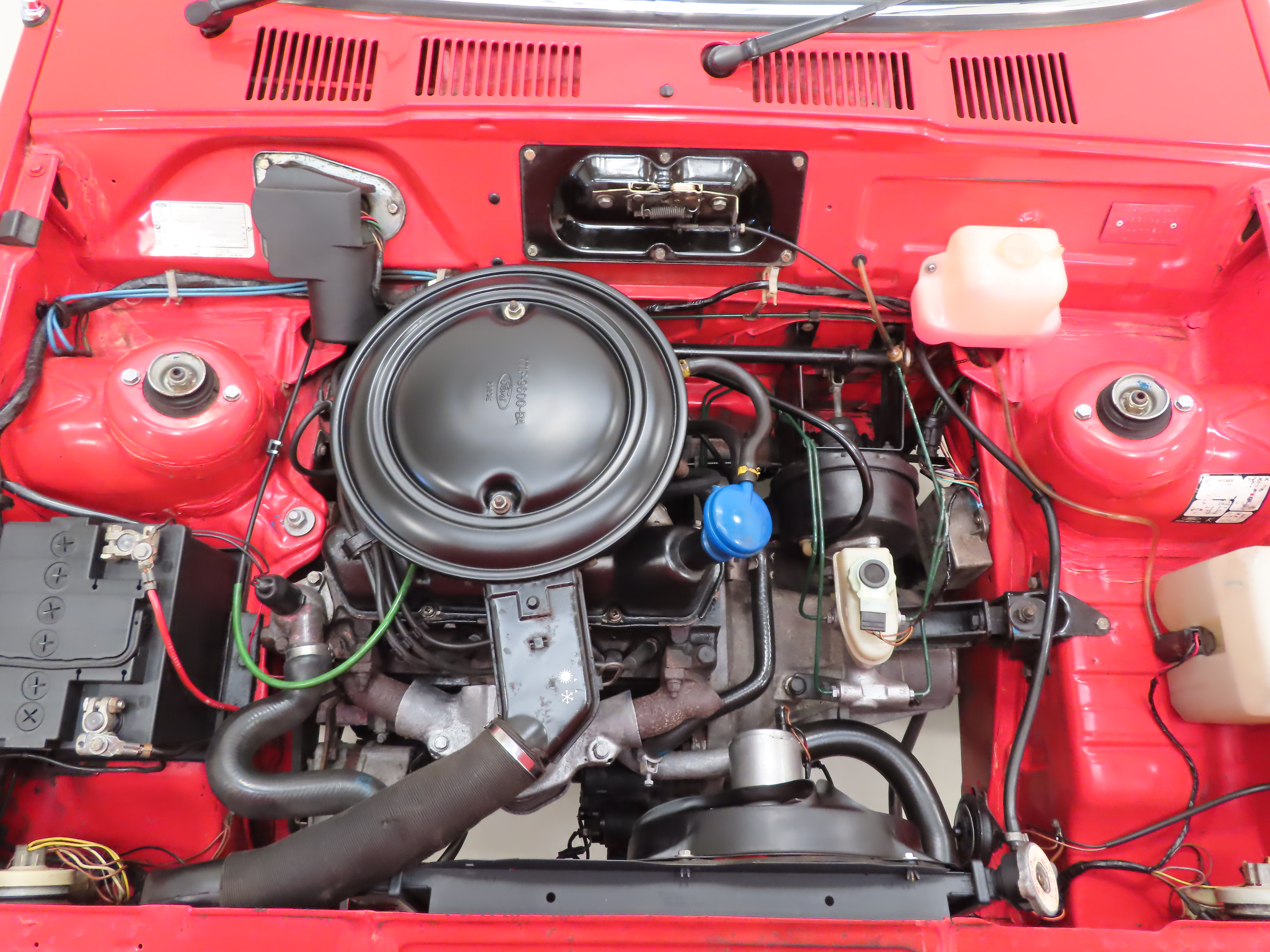 The time proven transverse mounted 1300 OHV engine produces a spritely 66BHP which in such a lightweight and nimble car offers lively performance whilst returning a frugal 44.1MPG. The engine is wonderfully quiet and smooth, the completely standard engine bay is very clean with factory plates and Motorcraft hoses, clips and service items intact. The standard specification automatic choke is present and correct and operates perfectly. The four-speed synchromesh gearbox with remote shift and self-adjusting clutch is light and exact. A real joy to use.