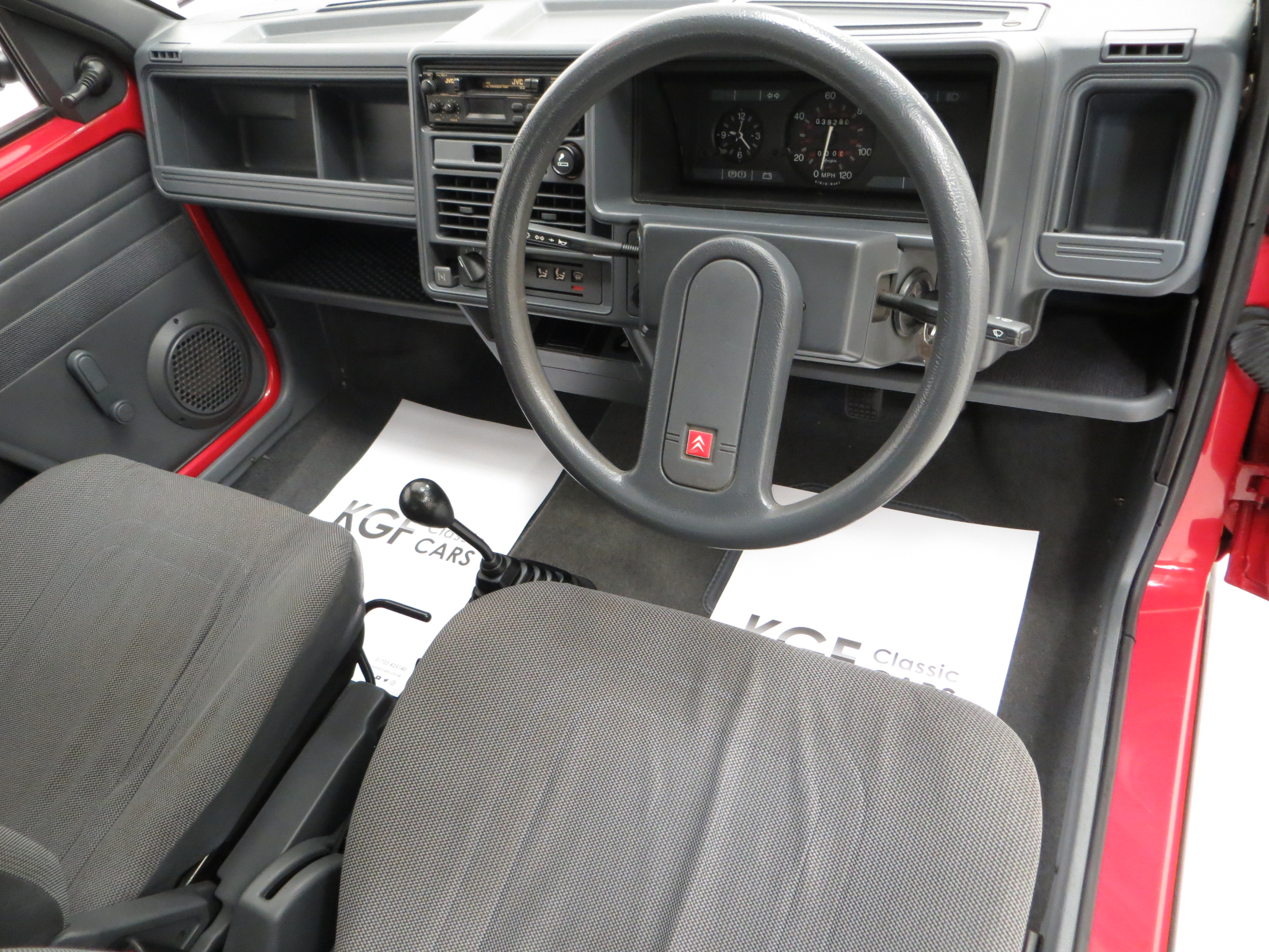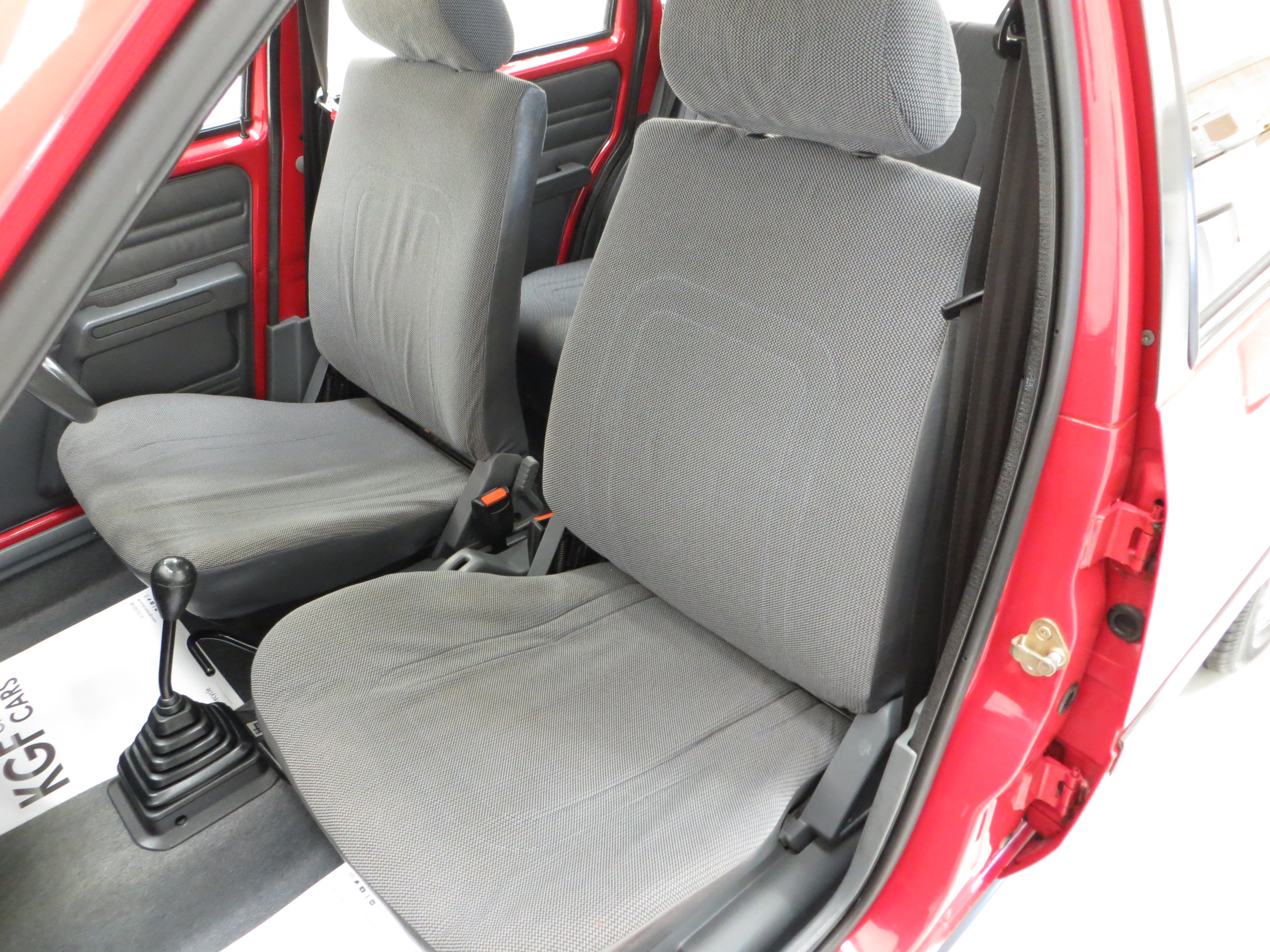 A true delight of 1980’s nostalgia! The delightfully boxy fascia with and sparse equipment levels are exactly what this modest supermini is about, simple economical motoring. The very clean grey fabric upholstery is in superb order with no rips or tears and the typically French seats are surprisingly comfortable with only slight loosening of the lightweight material on the driver’s seat. All trim sections, door cards and fascia are immaculate and all functions and controls operate as they should. The headlining is fully intact with some very light marks. Low mileage credentials are displayed in the quirky one spoke steering wheel showing prominent veins and no wear, as does the gear knob. Tyre pressure stickers remain affixed inside the spotless driver’s door aperture. The immaculate boot area contains the ultra-rare and usually misplaced sunroof bag as well as factory stickers and the original jack and brace. A delightfully unspoilt interior.