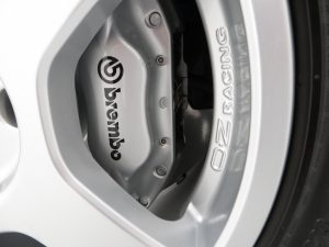 The robust, lightweight and imposing 8 x 18in O.Z. racing rims are pristine and have never been refurbished. The bespoke and unobtainable factory supplied Michelin Pilot Sport 225/40 ZR18 tyres that were developed specifically for the Focus RS are still fitted with no cracking or uneven wear. Peer through the large openings between the spokes and massive spotless Brembo 4-pot calipers and 324mm ventilated discs will be seen. These can stop the car from 100 mph in 4.1 seconds and generate braking forces exceeding 1.0 g.
