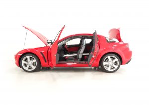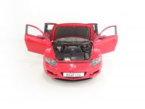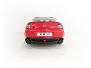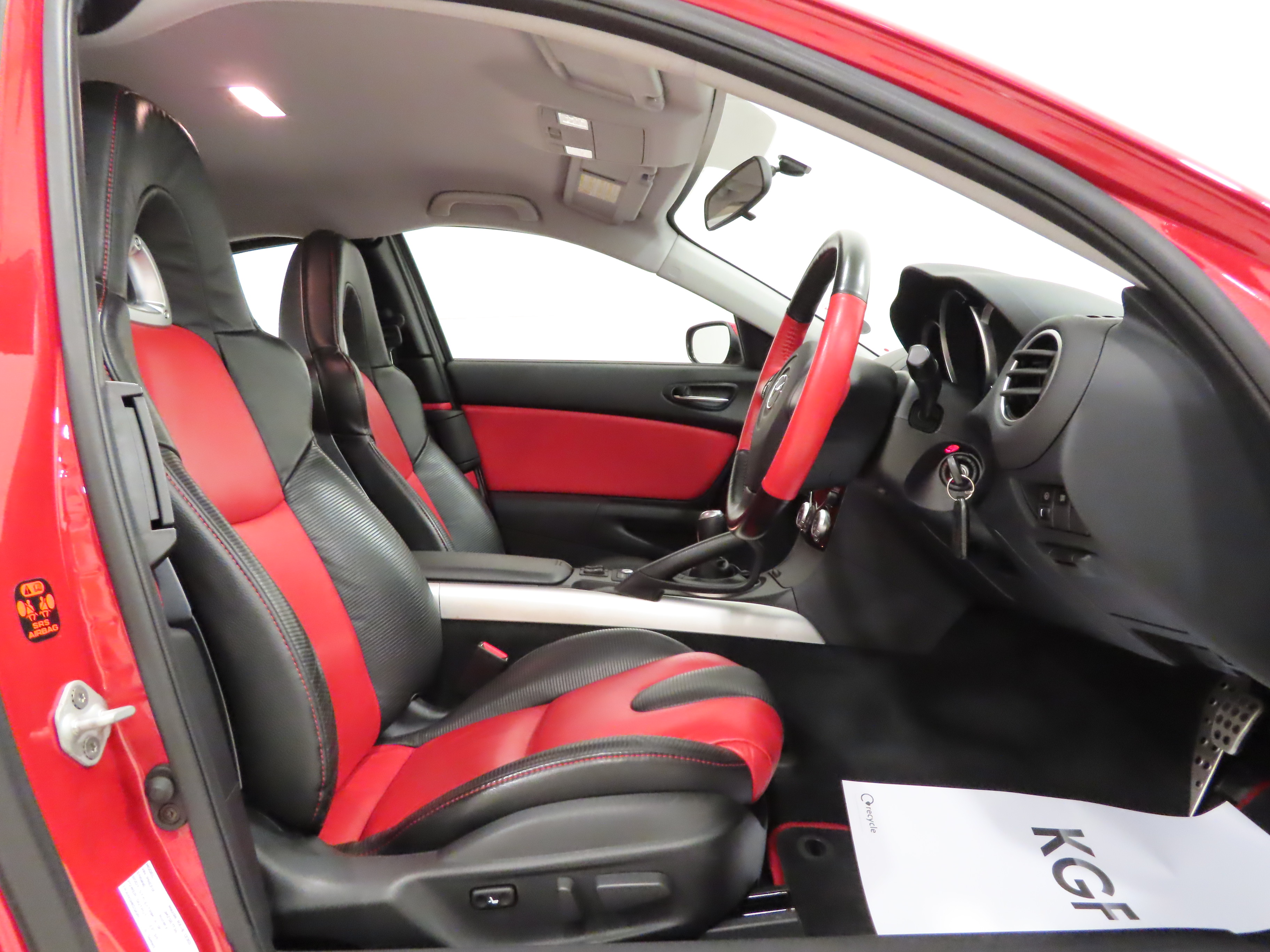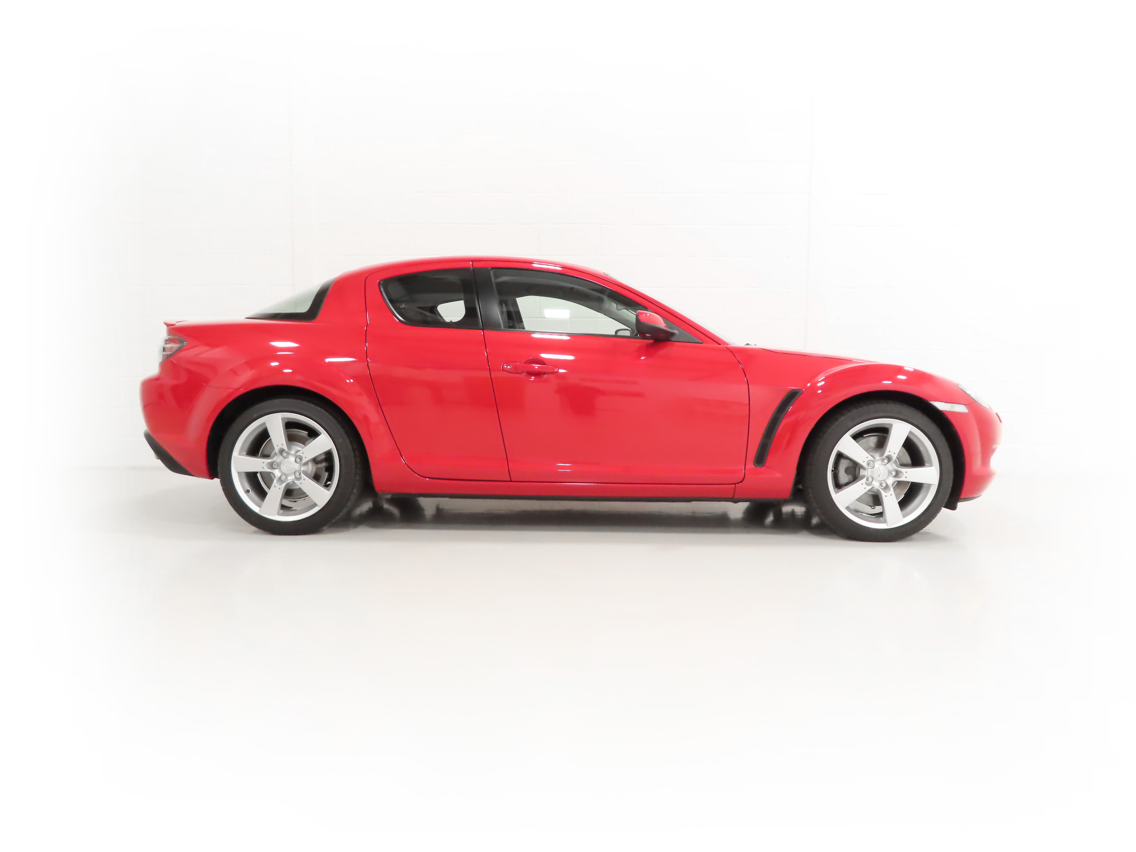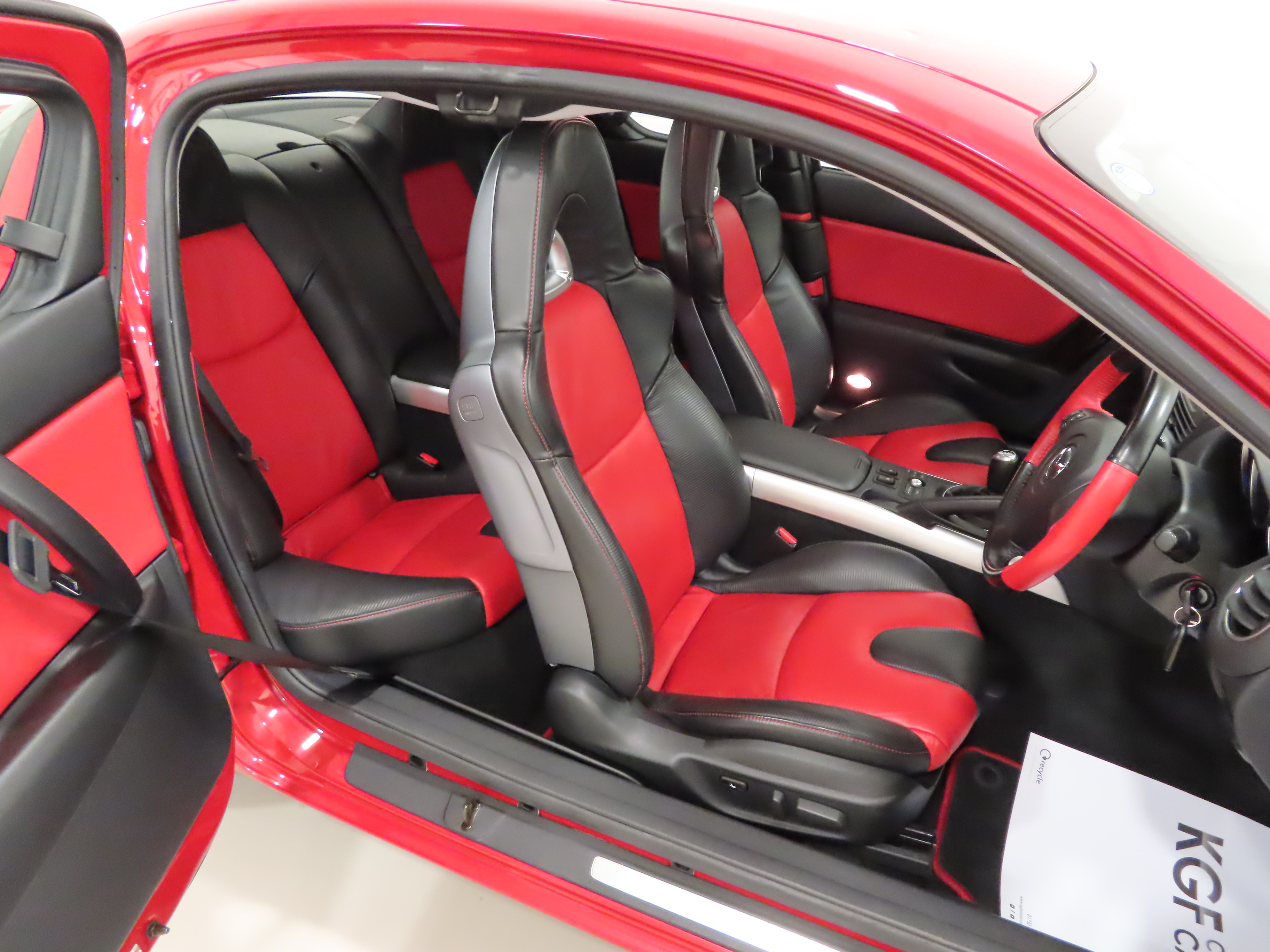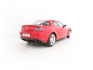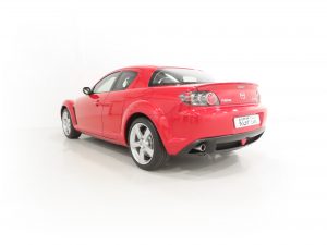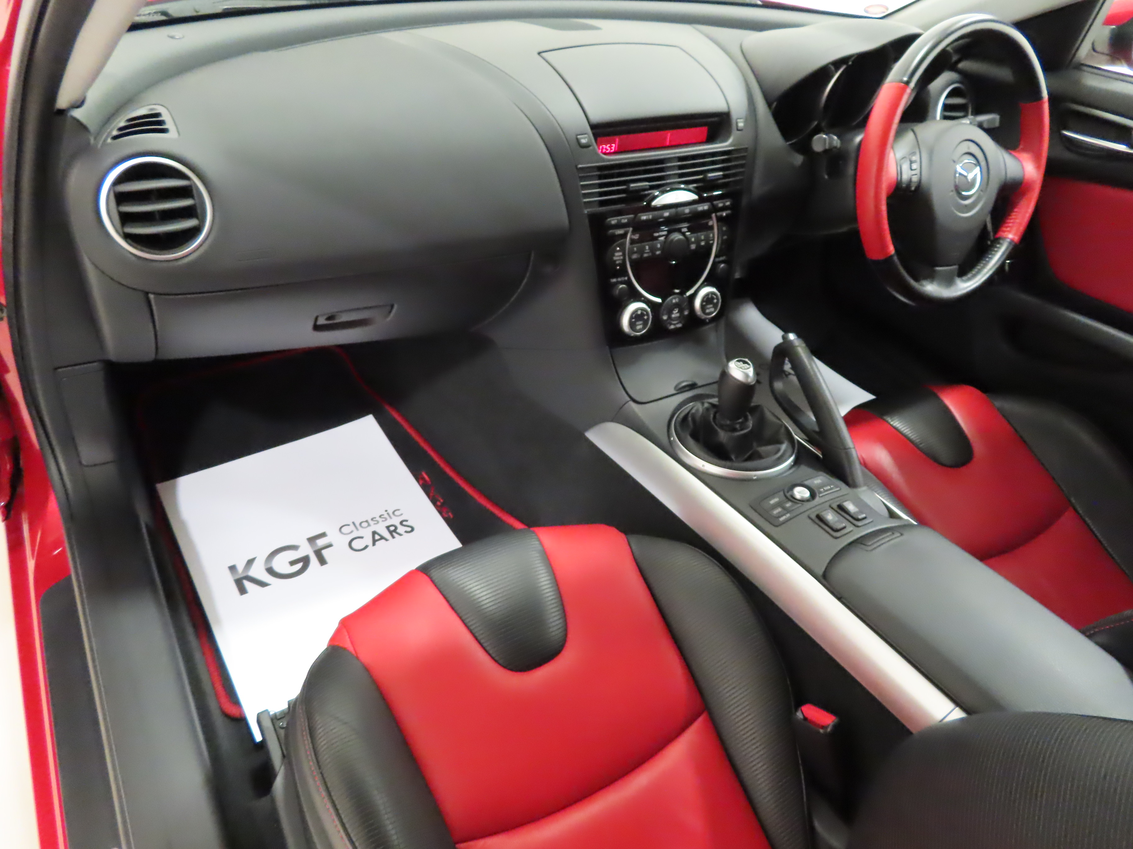 Aluminium construction body, Freestyle door system, rear lip spoiler, flip-open rear quarter windows, Dynamic Stability Control, Super LSD (limited slip differential), front and side airbags, curtain airbags, ISOFIX child seat system to rear seats, Thatcham Cat 1 alarm and immobiliser, air conditioning with climate control, premium BOSE 9 speaker audio with 6-CD autochanger, rear seat ‘boot through’ box in centre. RX-8 (230) features; 6-speed manual transmission, Xenon headlamps, automatic headlamp levelling, headlamp washer jets, aluminium pedal set, aluminium driver’s footrest. Factory options; Velocity Red Mica paintwork, leather upholstery pack with driver’s power seat and heated front seats, DVD satellite navigation. Dealer options; Front and rear tailored carpet mats, Supaguard Protection.