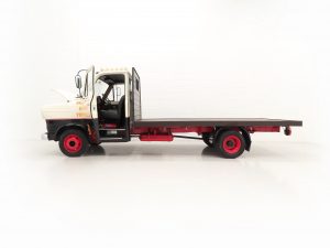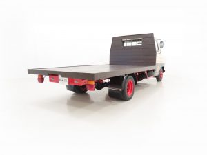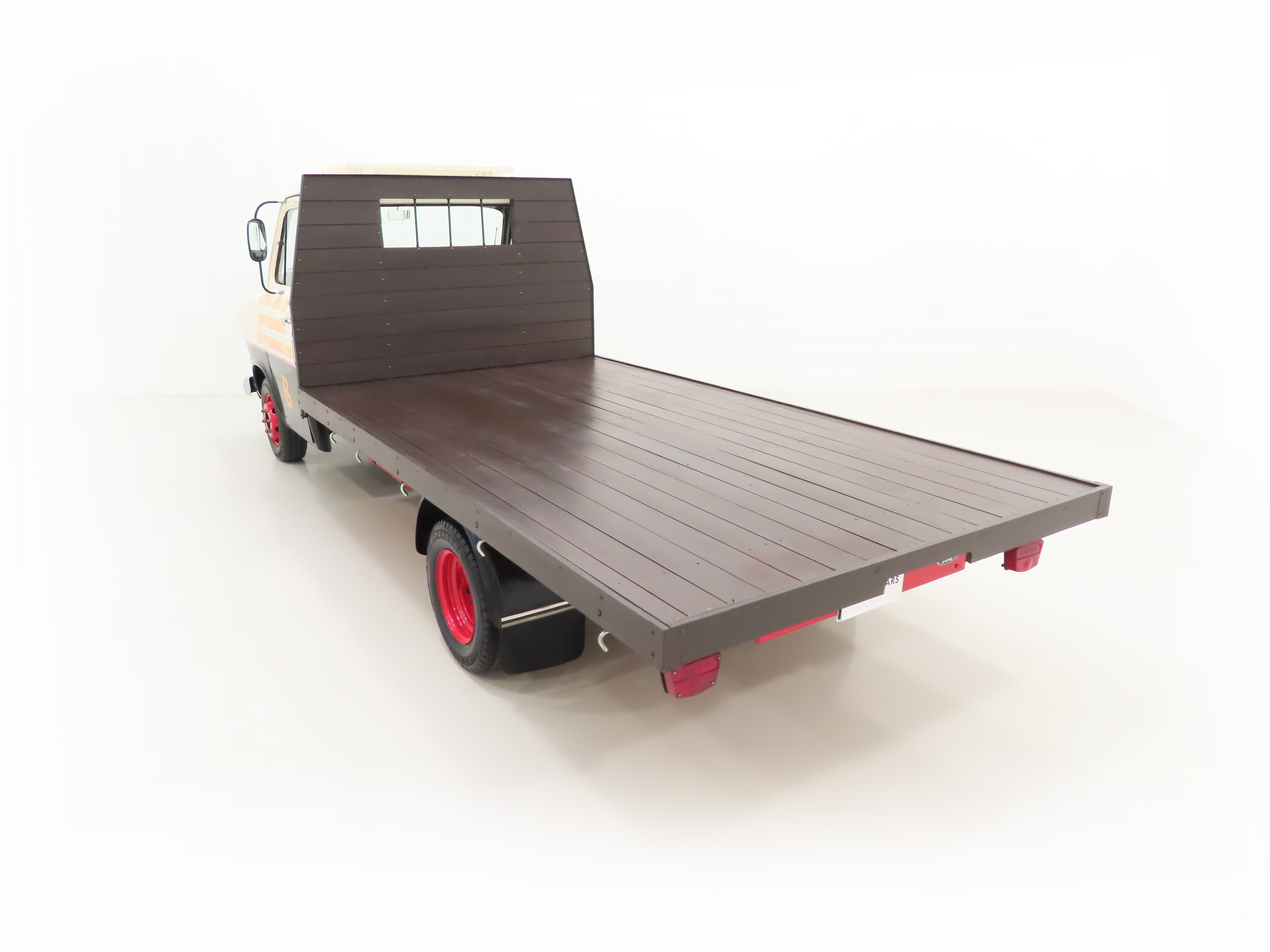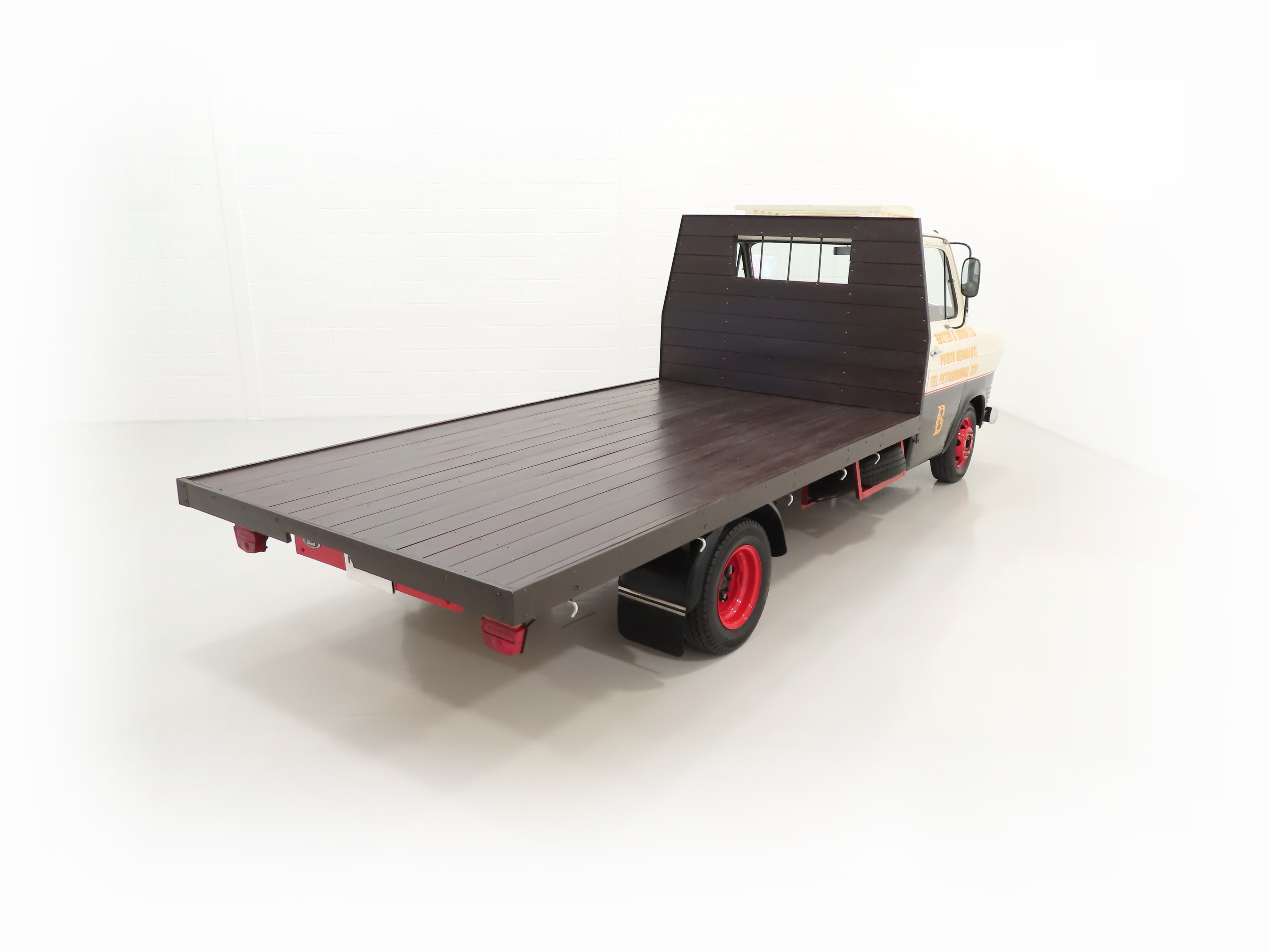 Chassis cab body with 2-door cab, flat bed with rear bulkhead, twin-wheel rear axle, load tie hooks, side door window down windows plus opening quarter lights, built in cab steps, three seats, carpeted cab floor, twin sun visors, can heater/ventilator, fuel gauge, engine temperature gauge, speedometer, odometer, foot operated windscreen washers, ashtray. Custom features; Bespoke built Keruing timber load bed and bulkhead, cab roof rack, large door mirrors, Baxter & Guion Ltd colour scheme paintwork, Baxter & Guion Ltd vinyl livery, side mounted spare wheel carrier, LED roof and side lights, inertia reel seat belts to outer seats, electric fuel pump prime button, tool box.