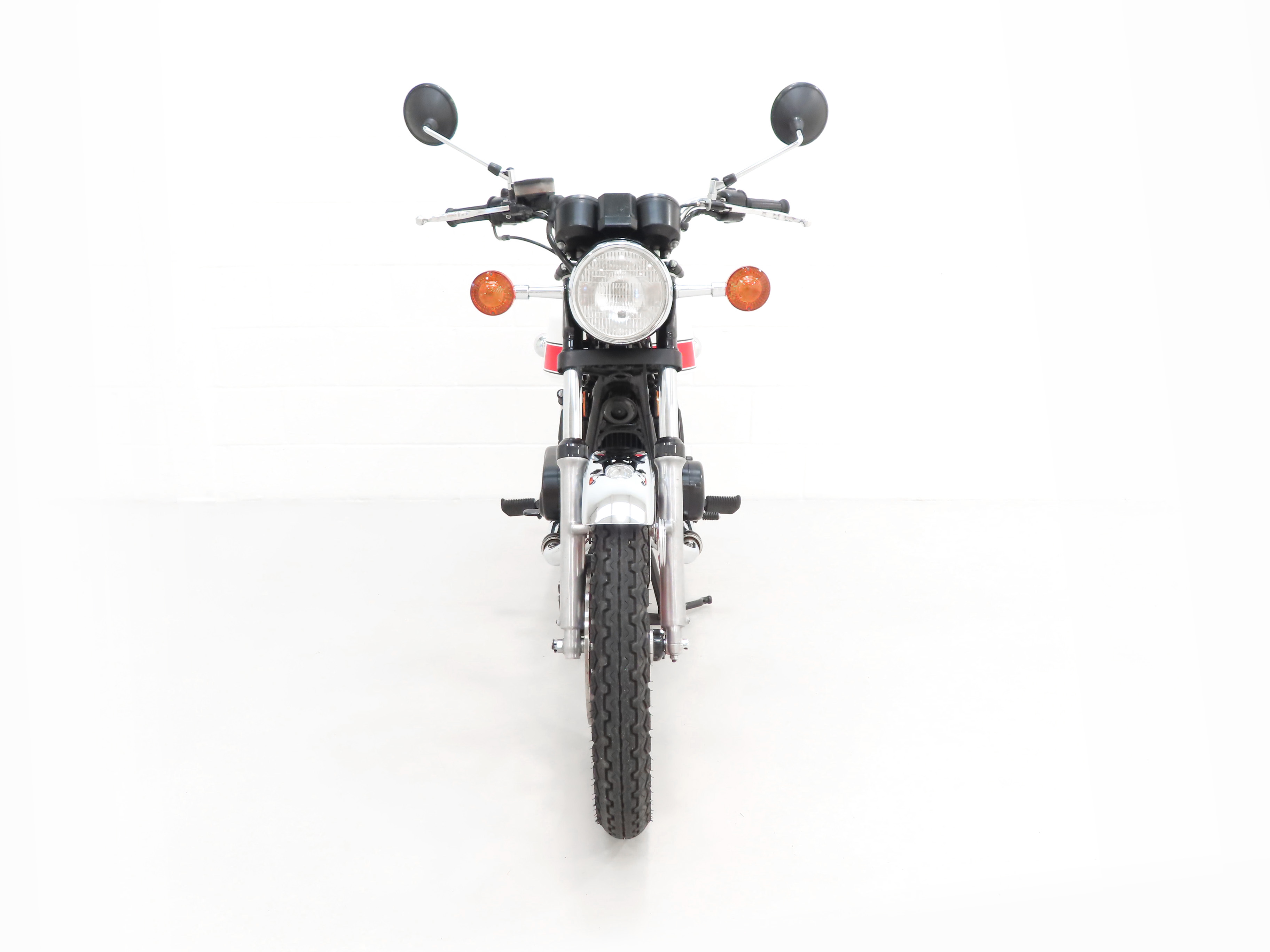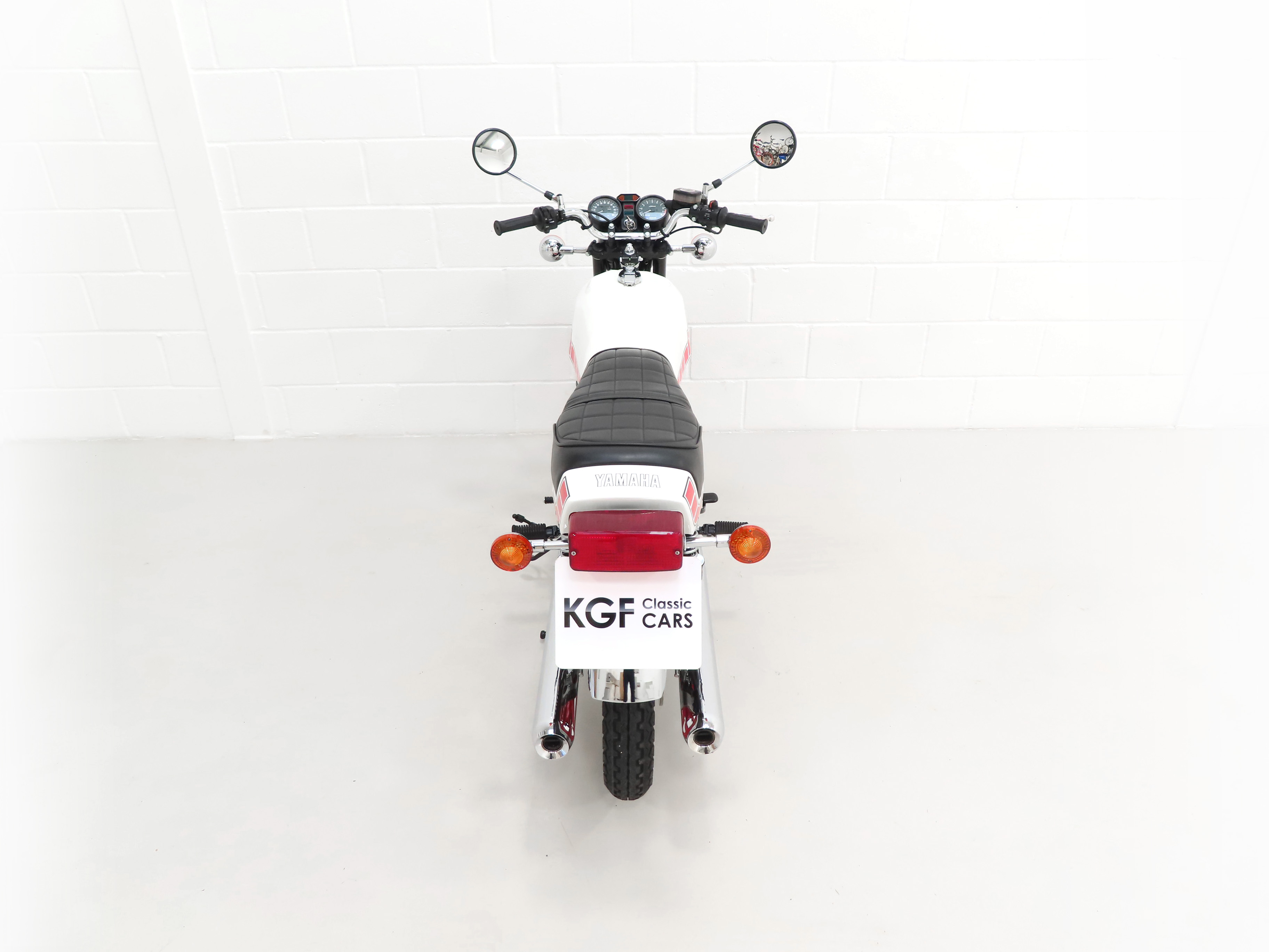 Finished in Clean White with the famous red Yamaha speed block motif, the appearance of this thoroughbred can only be described as stunning. The attention to detail is outstanding, with the tank and decals factory correct such as the back ground behind the four hundred zero’s are hollow (not filled in black like earlier models). The high-tensile steel tubular double-cradle frame is immaculate painted in gloss black with the important UK frame number 1A3-331…. clearly visible. The chrome has a mirror finish and the seat base remains the original steel item containing a full Yamaha tool kit. Amazingly the original and desirable chrome exhaust system remains fitted with part numbers clearly visible with a few minor marks and small dings. All instrumentation is factory fitment and in excellent condition. A street machine without equal.
