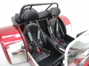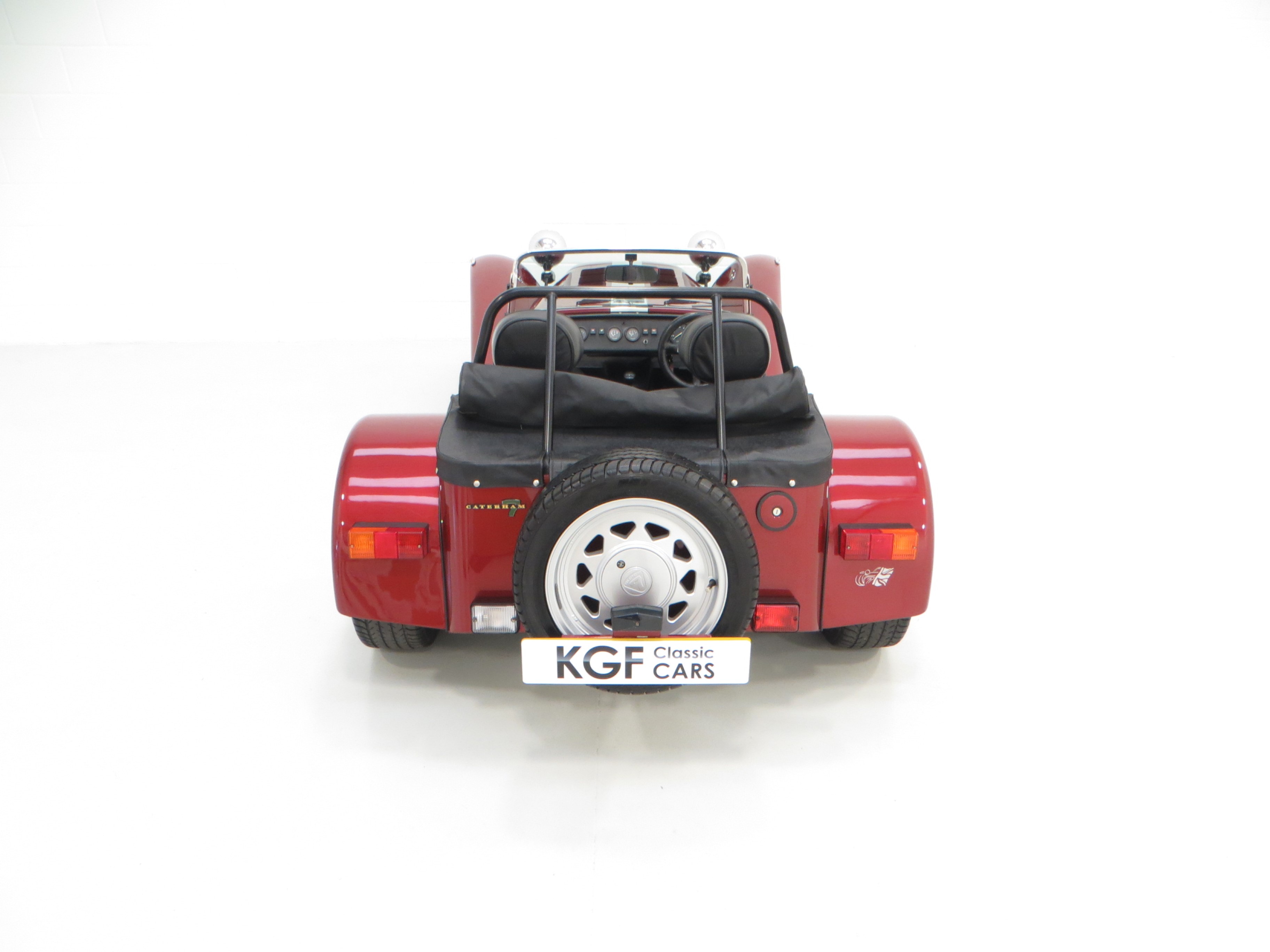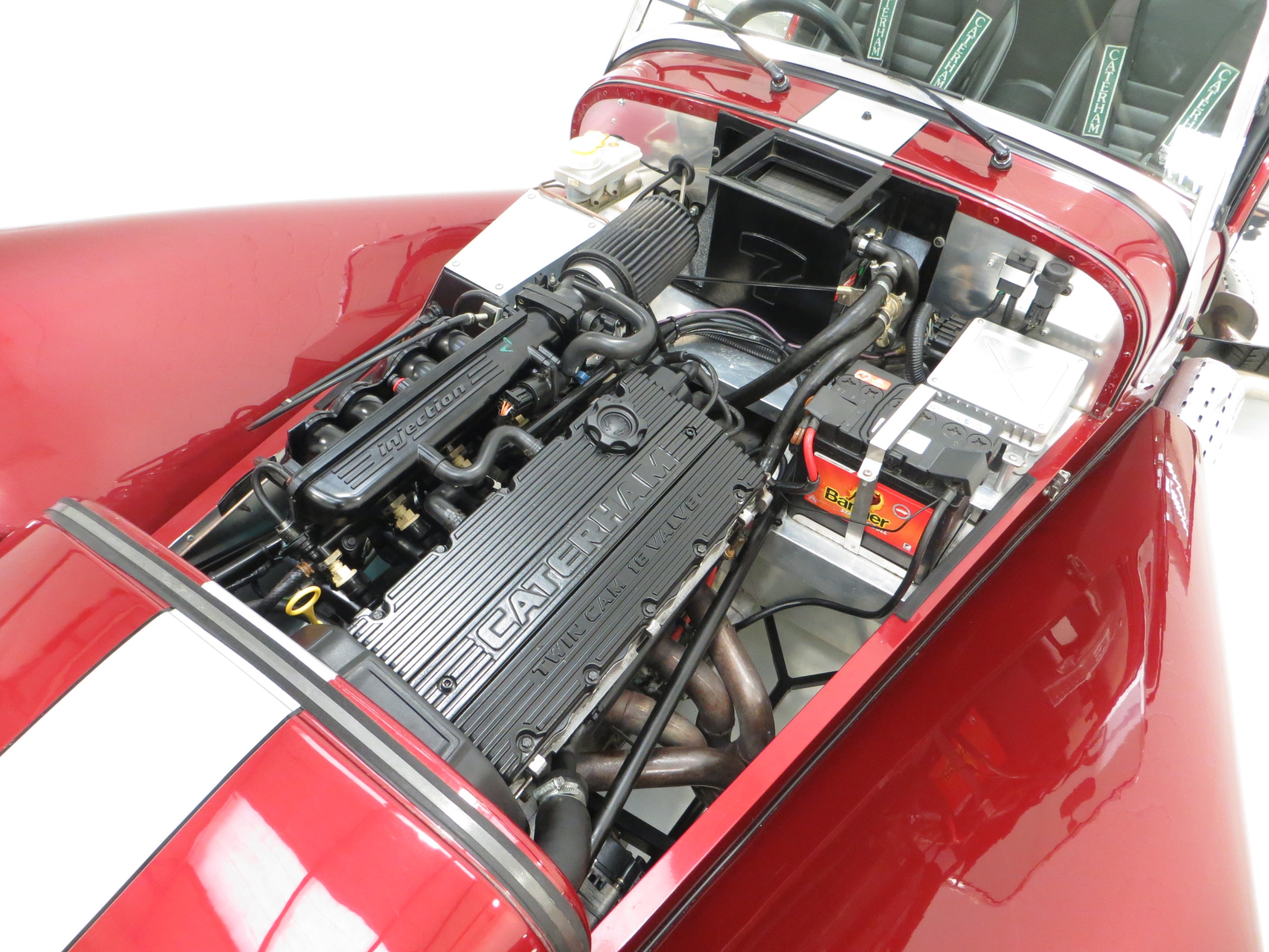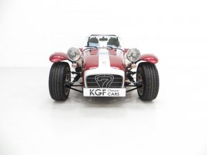 Truly spectacular finished in unique and sparkling Ruby pearlescent paint. The distinct Silver bonnet stripe extends to envelope the maw of the nose cone which incorporates the Seven logo, a cost option on lesser models. Full weather equipment remains in perfect condition as does the optional tonneau cover and handbag. All exposed suspension components are in excellent condition and even the blue Bilstein stickers are vibrant helping to prove fair weather use only. The chrome rear wing protectors are bright and have slight gravel rash and some minor stone chips are barely visible. The incredibly light aluminium bonnet is unmarked and proudly displays the 40th Anniversary logo to each side and optional clear front indicators are fitted. A very special Caterham.