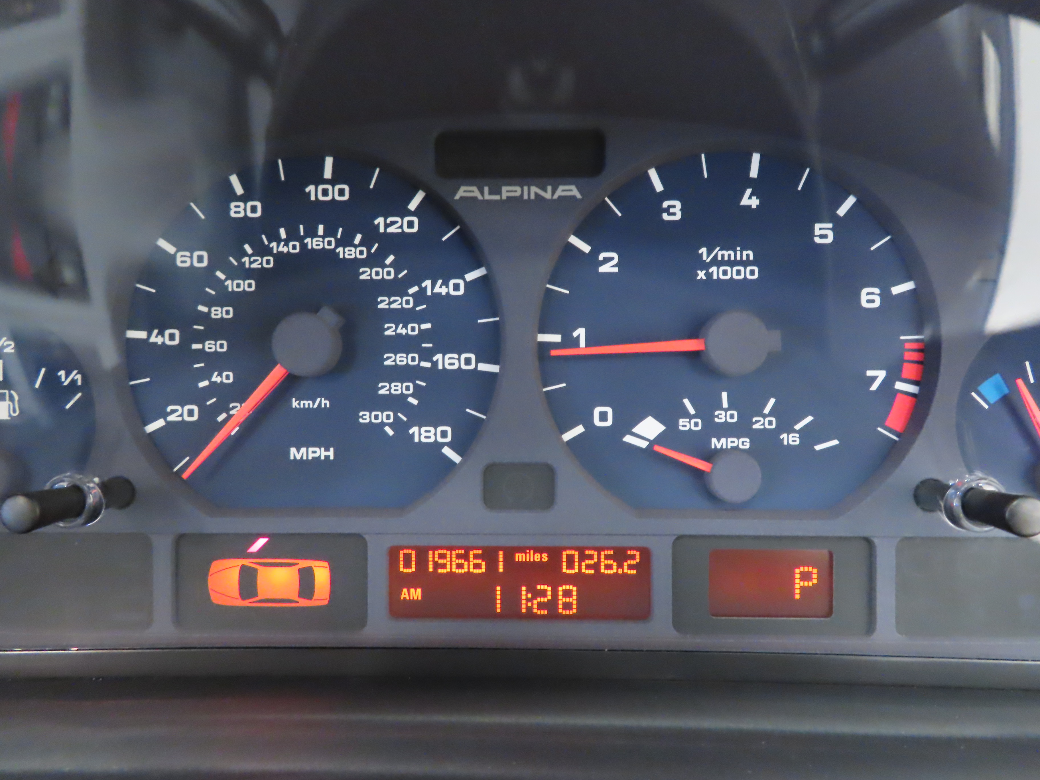 Finished in Grey Nappa leather, the pristine upholstery is fully commensurate with the low 19,661 miles covered. Vital Alpina features to establish authenticity are present such as the 180mph blue Alpina instrumentation with red needles and the Alpina plaque confirming this is car number 229. The unique Alpina velour floor mats are present and door apertures are spotlessly clean with factory labels intact. The fascia with wood veneer inserts is as new and hosts fully functioning equipment to include heated seats, sat nav and ice-cold climate control. A complete unused toolkit is correctly housed inside the pristine boot area alongside the factory optional 6CD changer.