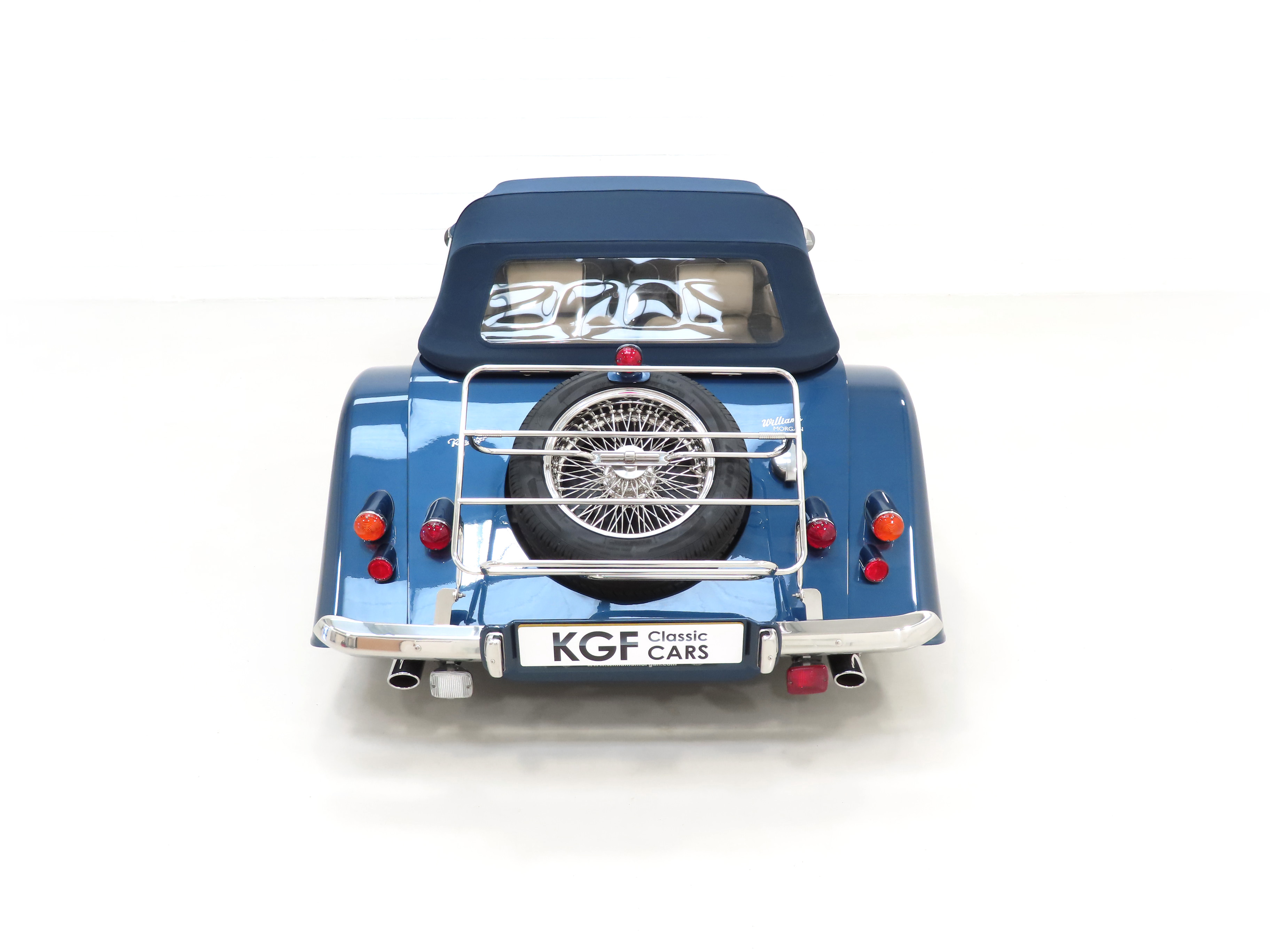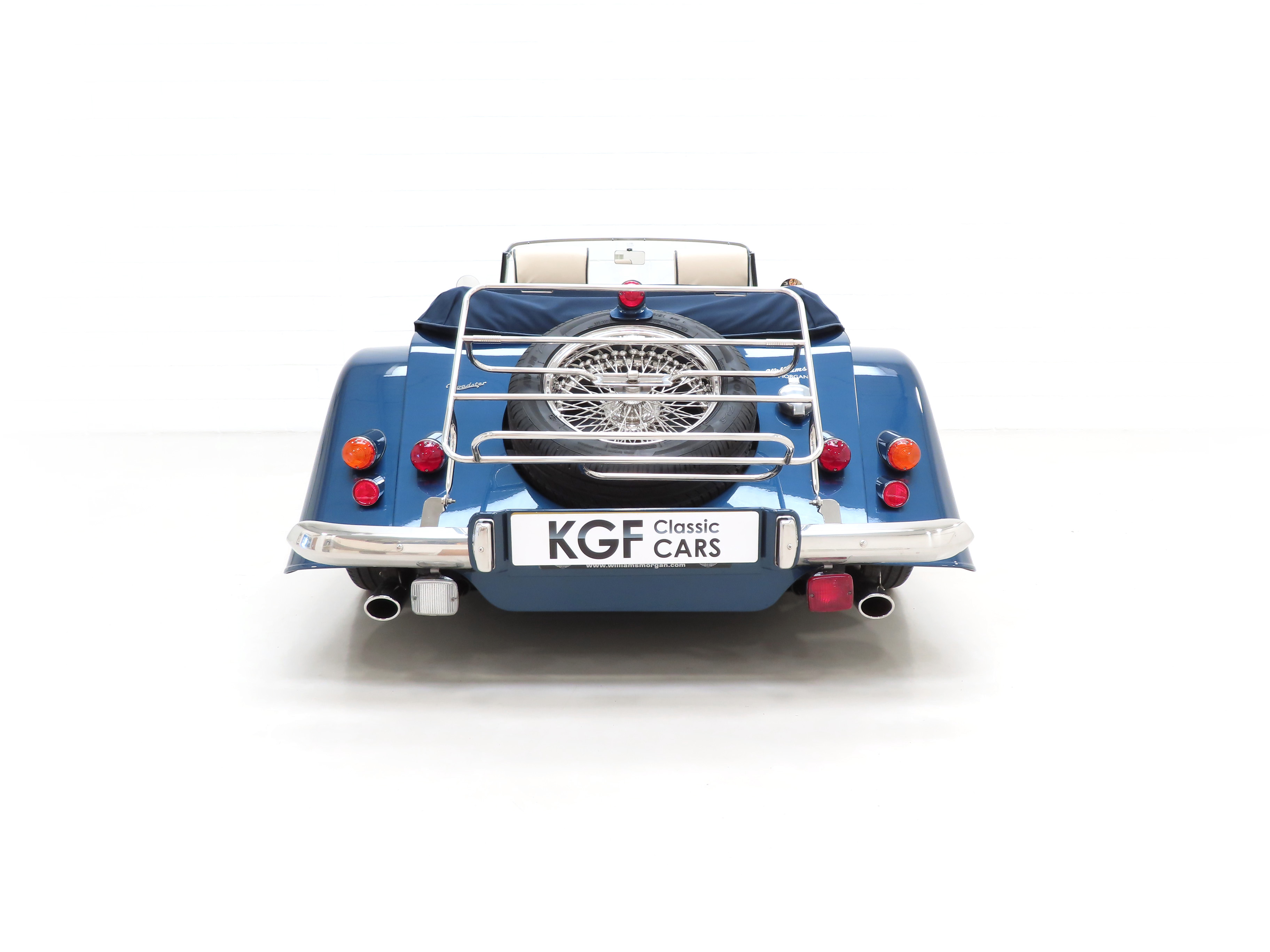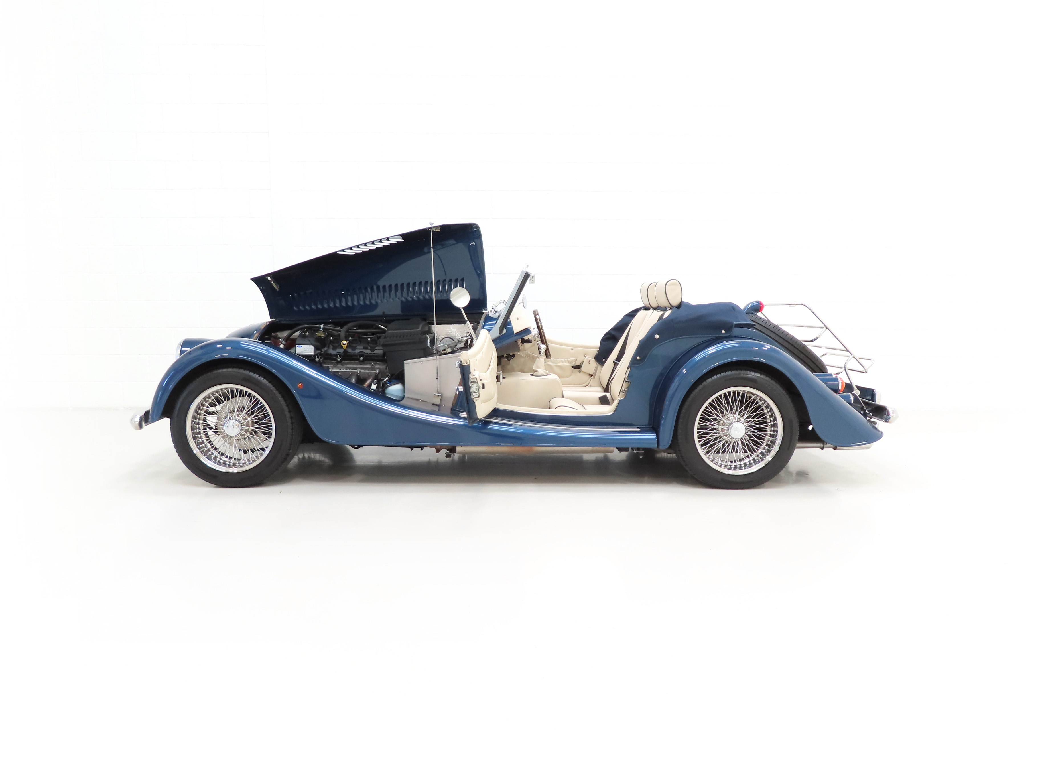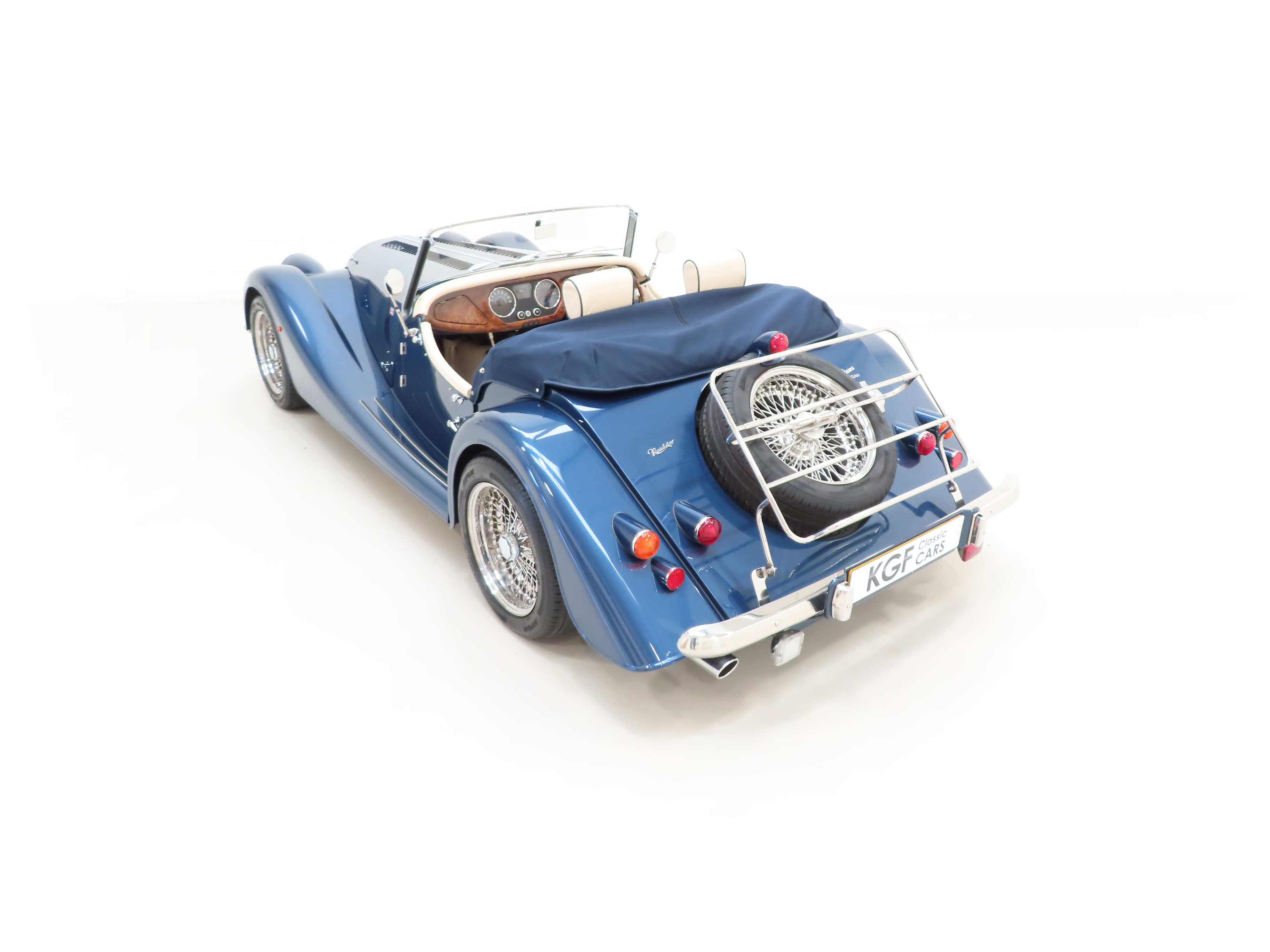 The iconic cut away doors grant access to the gorgeous interior consisting of light cream full leather featuring horizontal pleating and exterior colour scheme piping in blue which extend to the carpets. The cockpit offers the perfect drivers environment while utilising core materials with the leather fascia and lashings of chrome, all of which is in near perfect condition. Modern meets old-style with perfectly functioning electronic warning systems and gauges as well as on-board computer and heated front screen. A digital speed display is also fitted. The wooden toolbox discreetly sited below the carpet behind the seats is complete and still in original packaging including the central spin-off wheel nut tool. This more modern variant of the Morgan product is spacious and comfortable to allow maximum appreciation of the Morgan Motor Company magic.