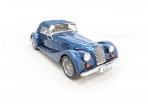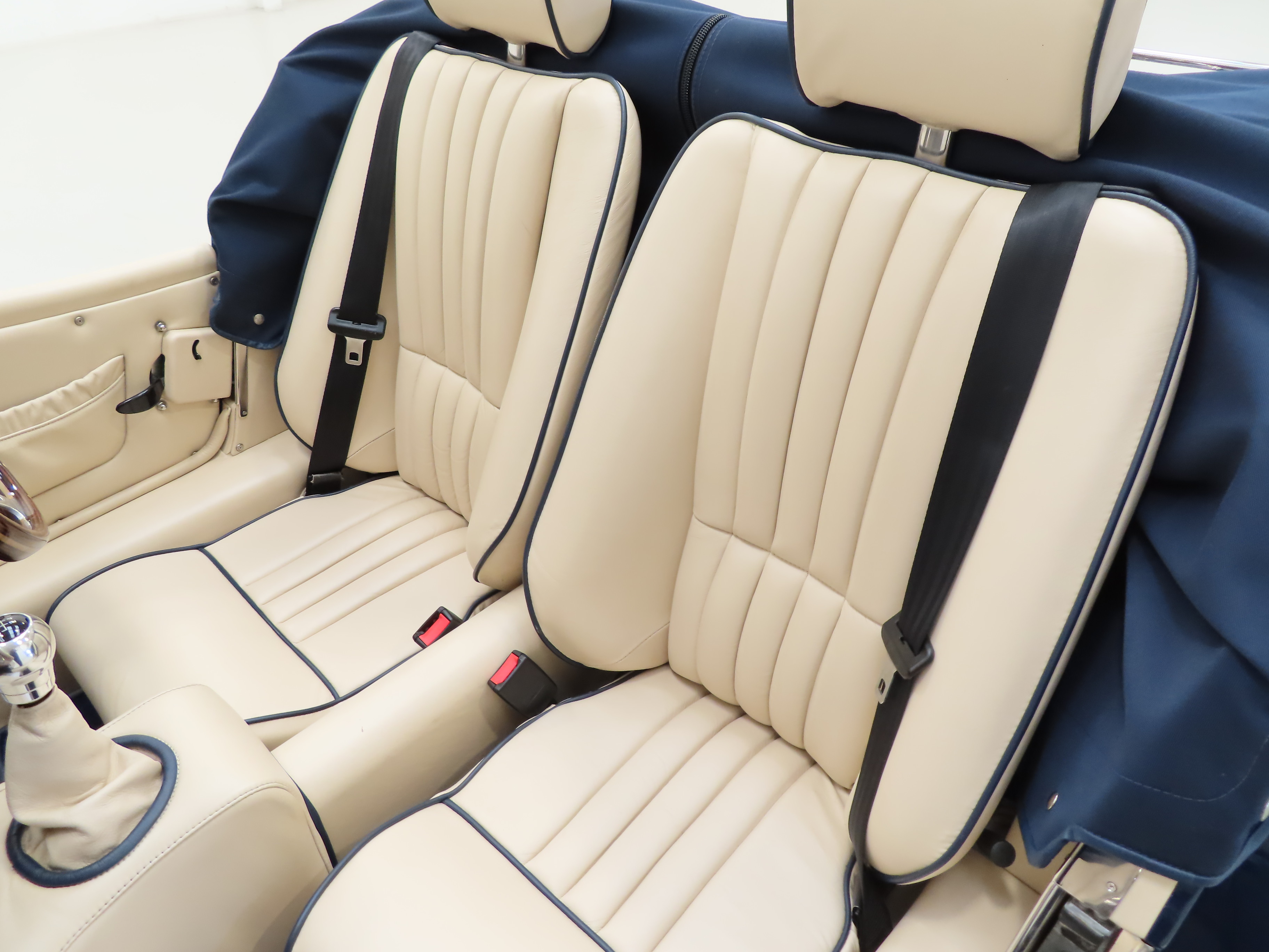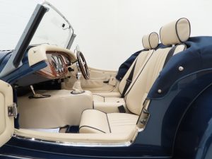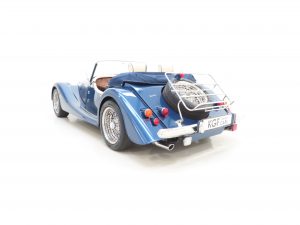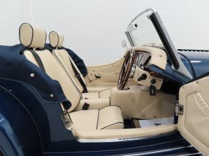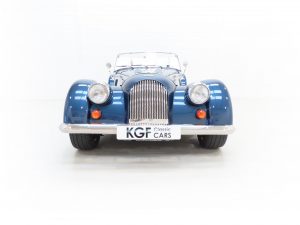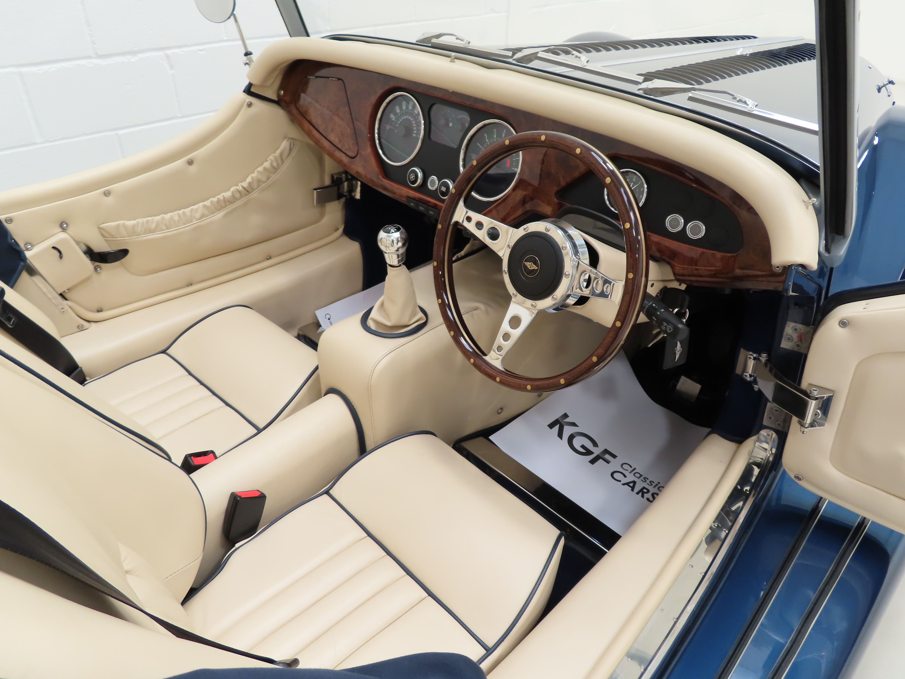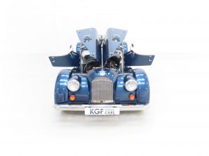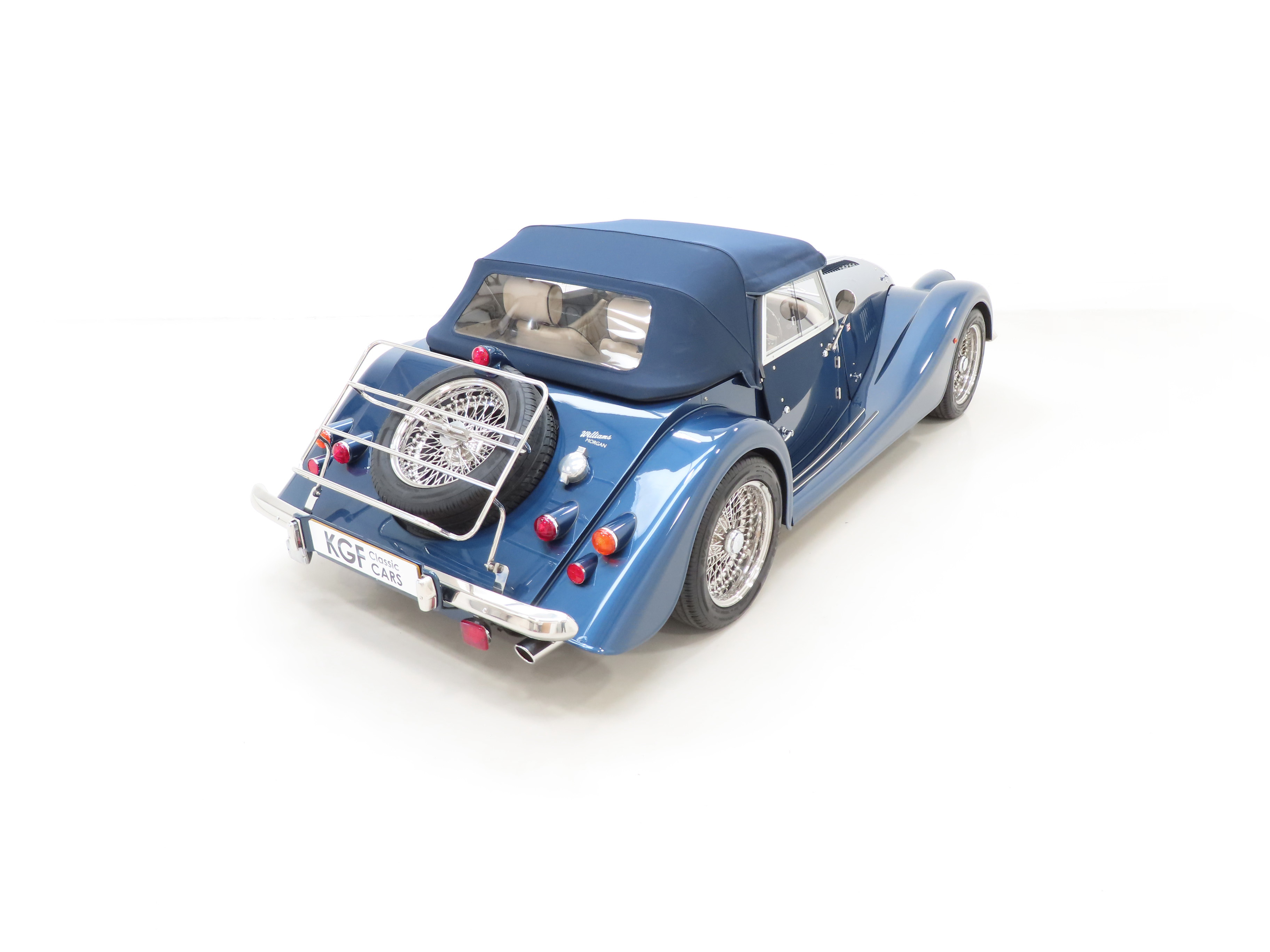 The iconic cut away doors grant access to the gorgeous interior consisting of light cream full leather featuring horizontal pleating and exterior colour scheme piping in blue which extend to the carpets. The cockpit offers the perfect drivers environment while utilising core materials with the leather fascia and lashings of chrome, all of which is in near perfect condition. Modern meets old-style with perfectly functioning electronic warning systems and gauges as well as on-board computer and heated front screen. A digital speed display is also fitted. The wooden toolbox discreetly sited below the carpet behind the seats is complete and still in original packaging including the central spin-off wheel nut tool. This more modern variant of the Morgan product is spacious and comfortable to allow maximum appreciation of the Morgan Motor Company magic.