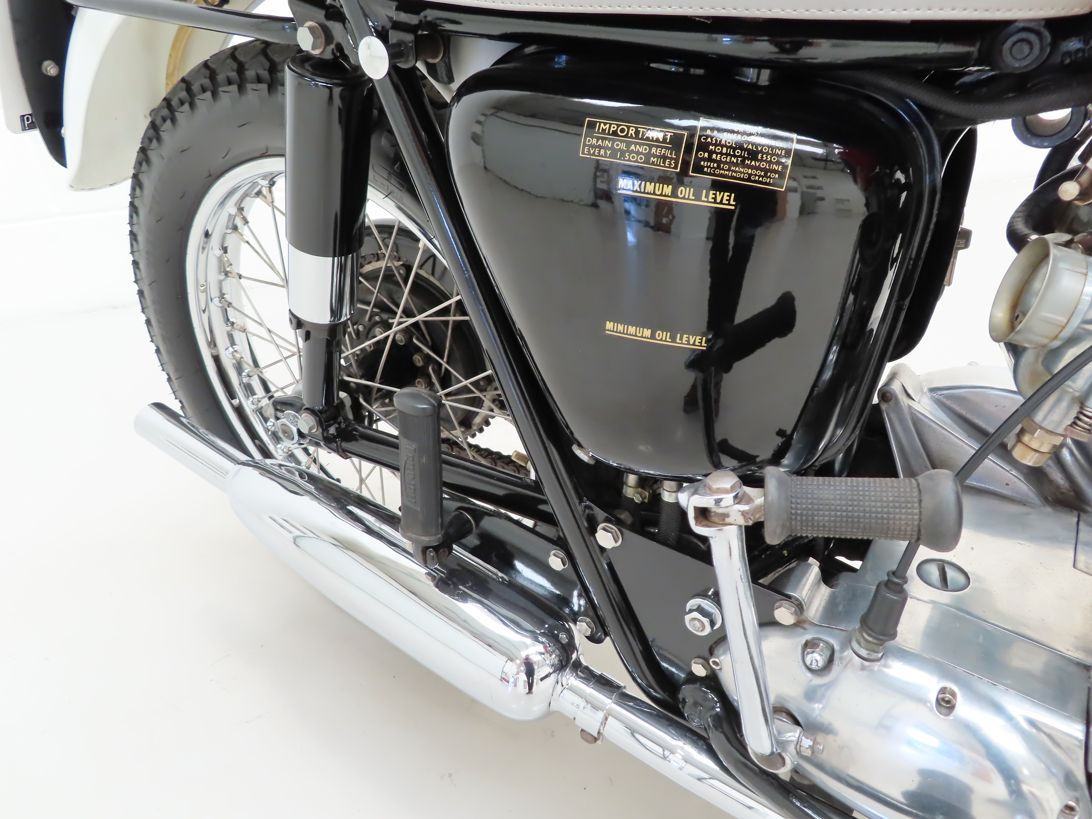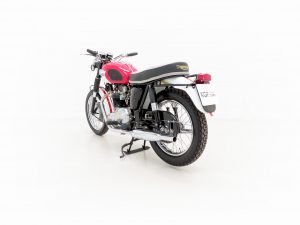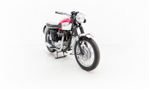 Brazed lug full-cradle single downtube frame, telescopic hydraulic damping front suspension, rear swingarm with two Girling dampers, twin Amal monobloc carburettors, twin roadster low pipes, Lucas headlamp with chromed bowl, 4 gallon fuel tank, tank rack, side tank knee pads, tank badge, twin ‘King and Queen’ seat, rear grab bar, Smiths speedometer and rev counter, ammeter, neutral indicator.