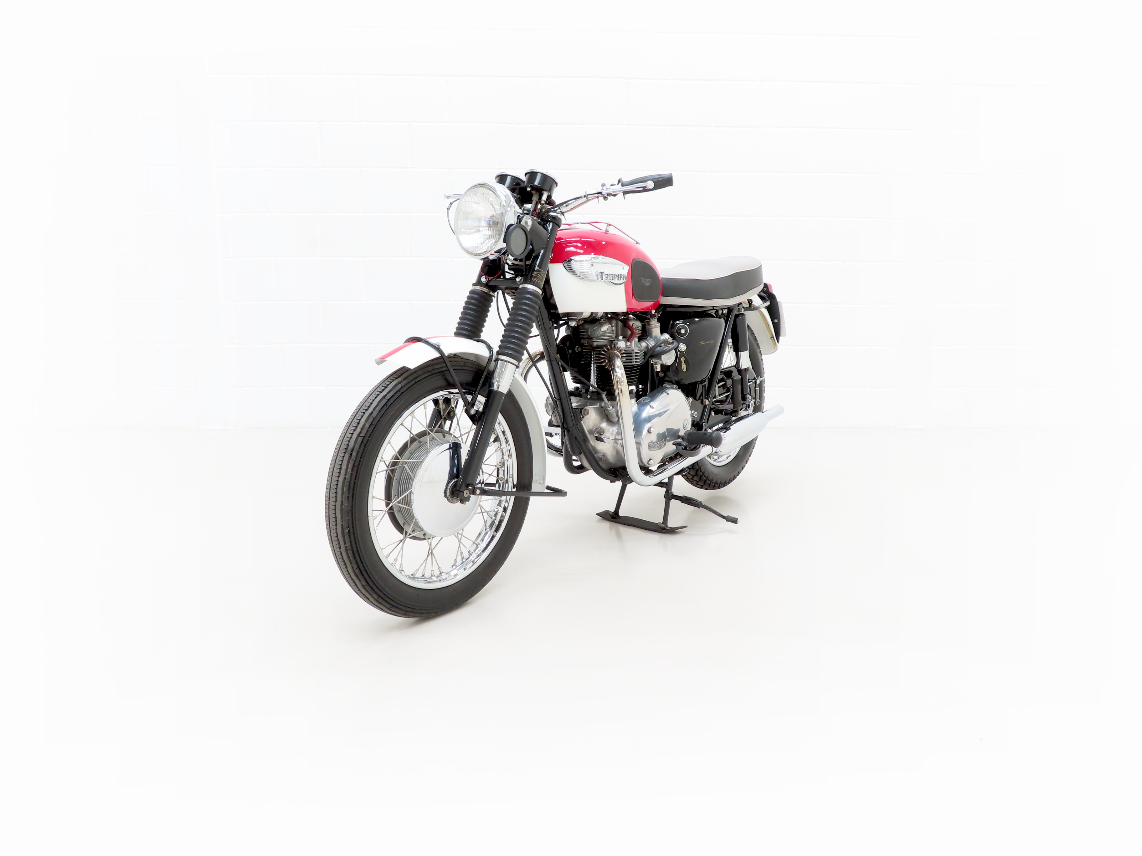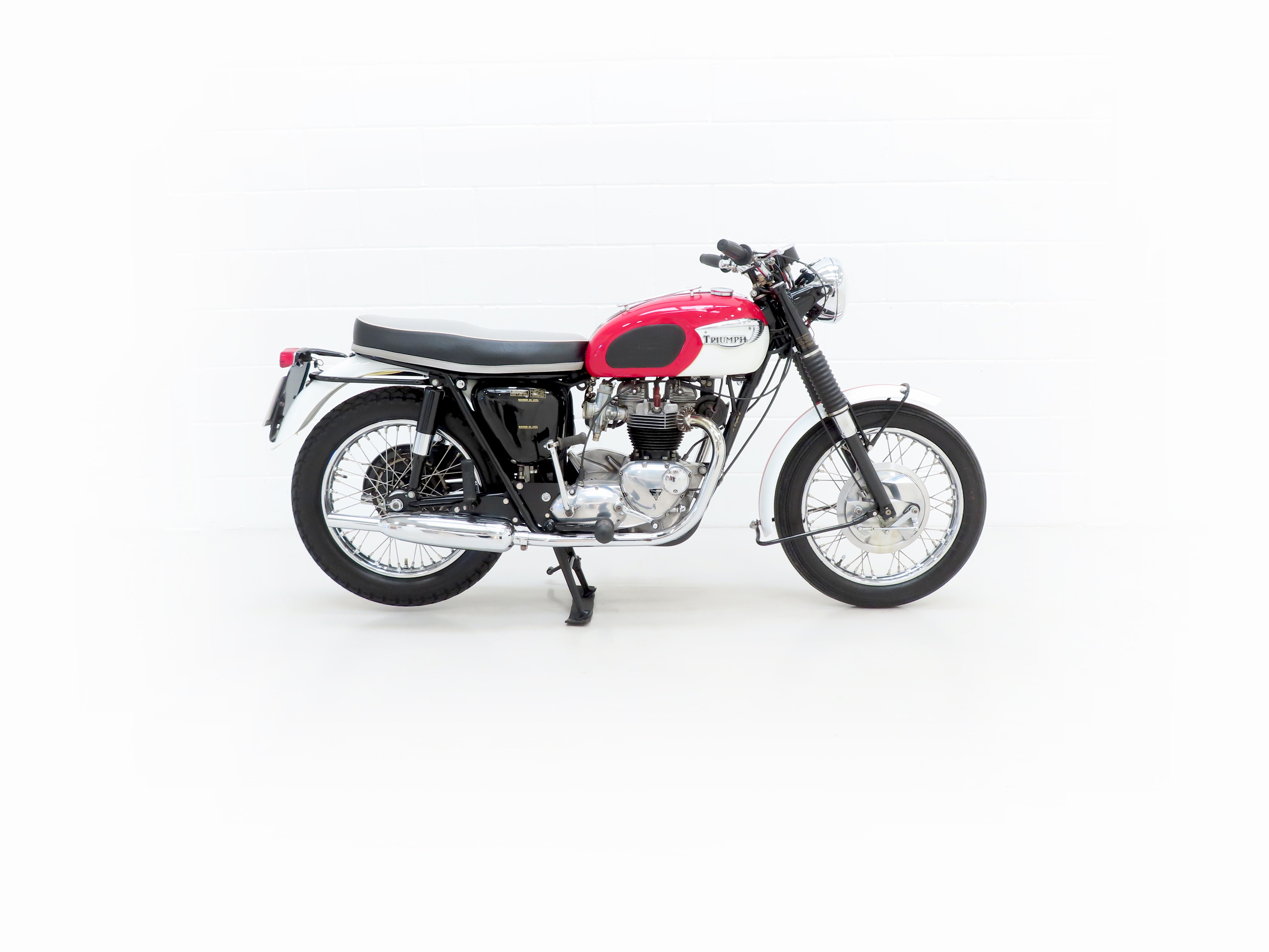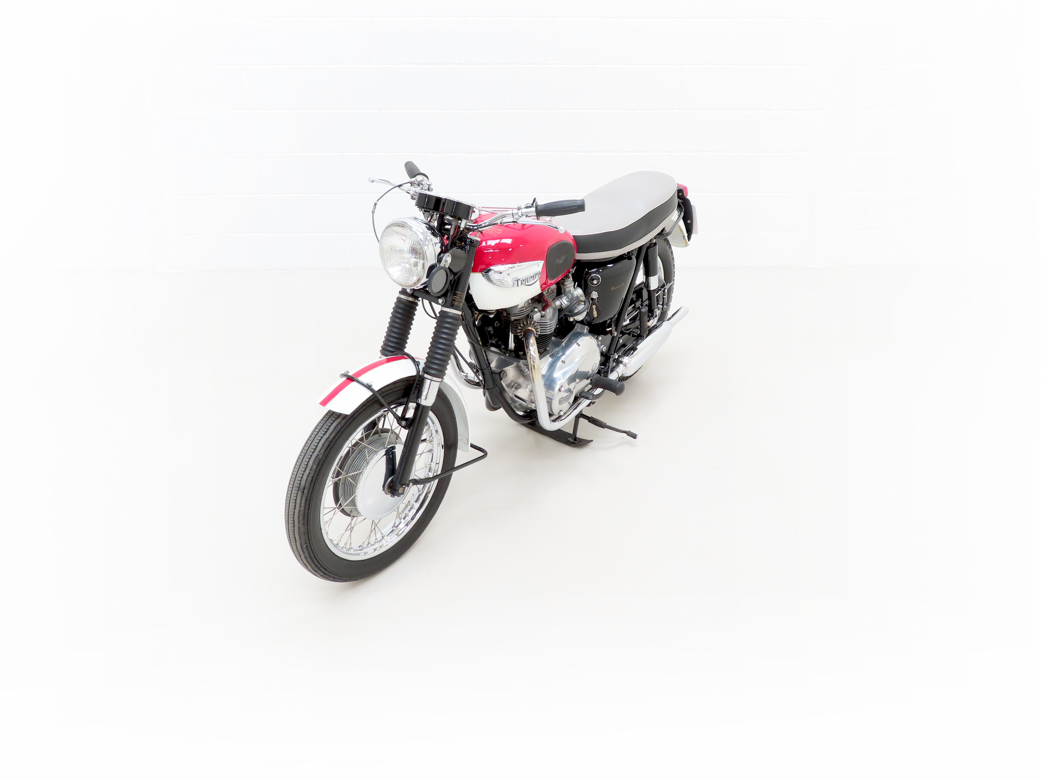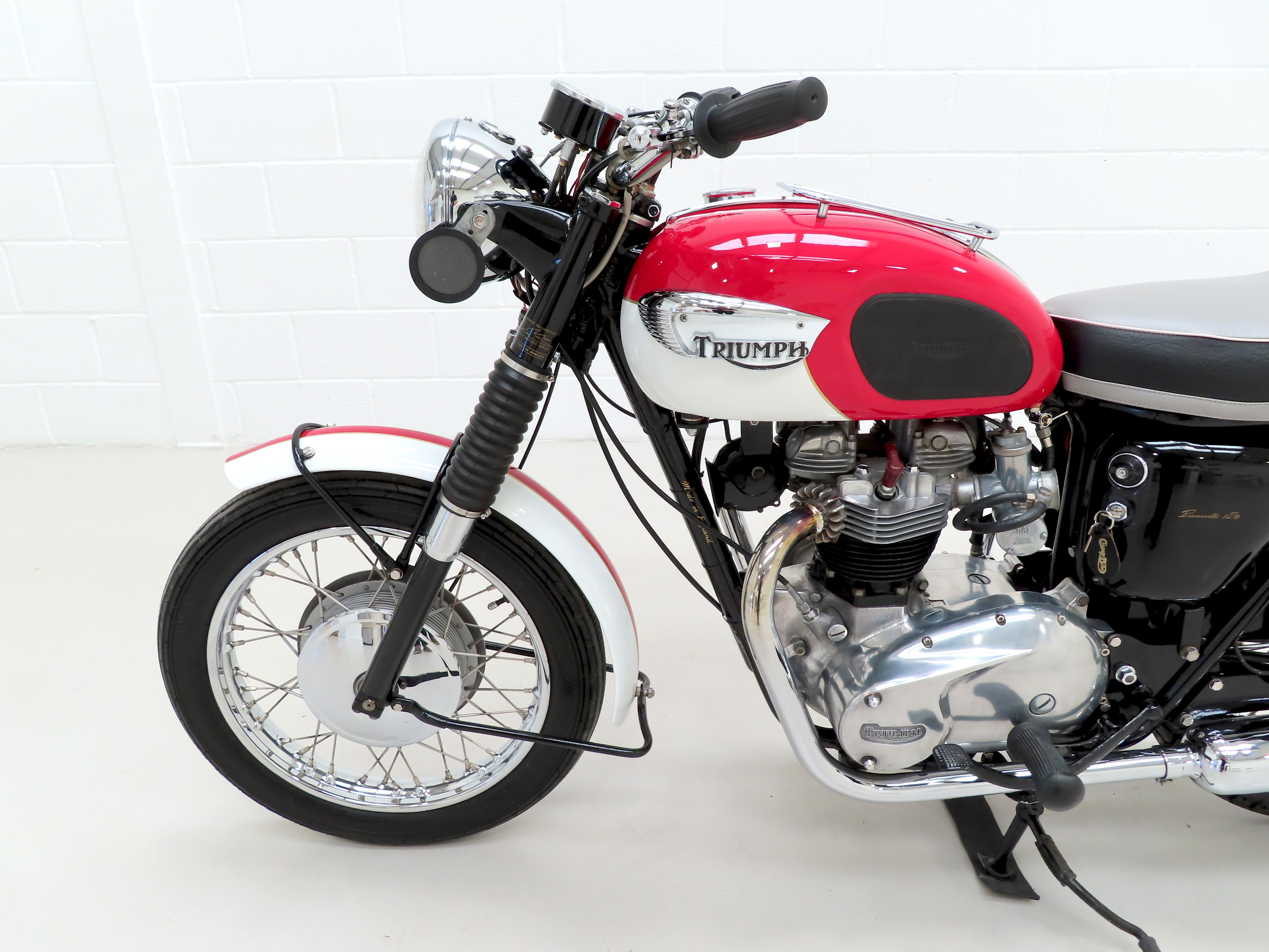 Finished in the original colour scheme of Red and Ivory, this patriotic Triumph Bonneville T120 is a UK example boasting matching number credentials. The Red and Ivory paintwork gleams and the gloss Black side panels have some miniscule dings and beautiful gold lettering. The mudguards, lights, grips and genuine Triumph foot rubbers are in excellent condition as is the seat. The frame is in fine order with no visual evidence of repair work and the original stock frame number stamping is clearly legible which in turn correlates with the engine number. An iconic classic British motorcycle.