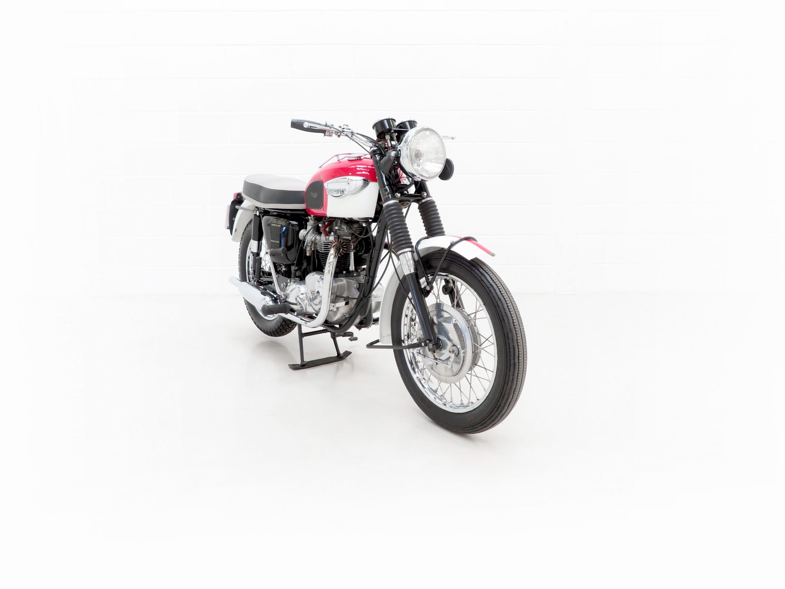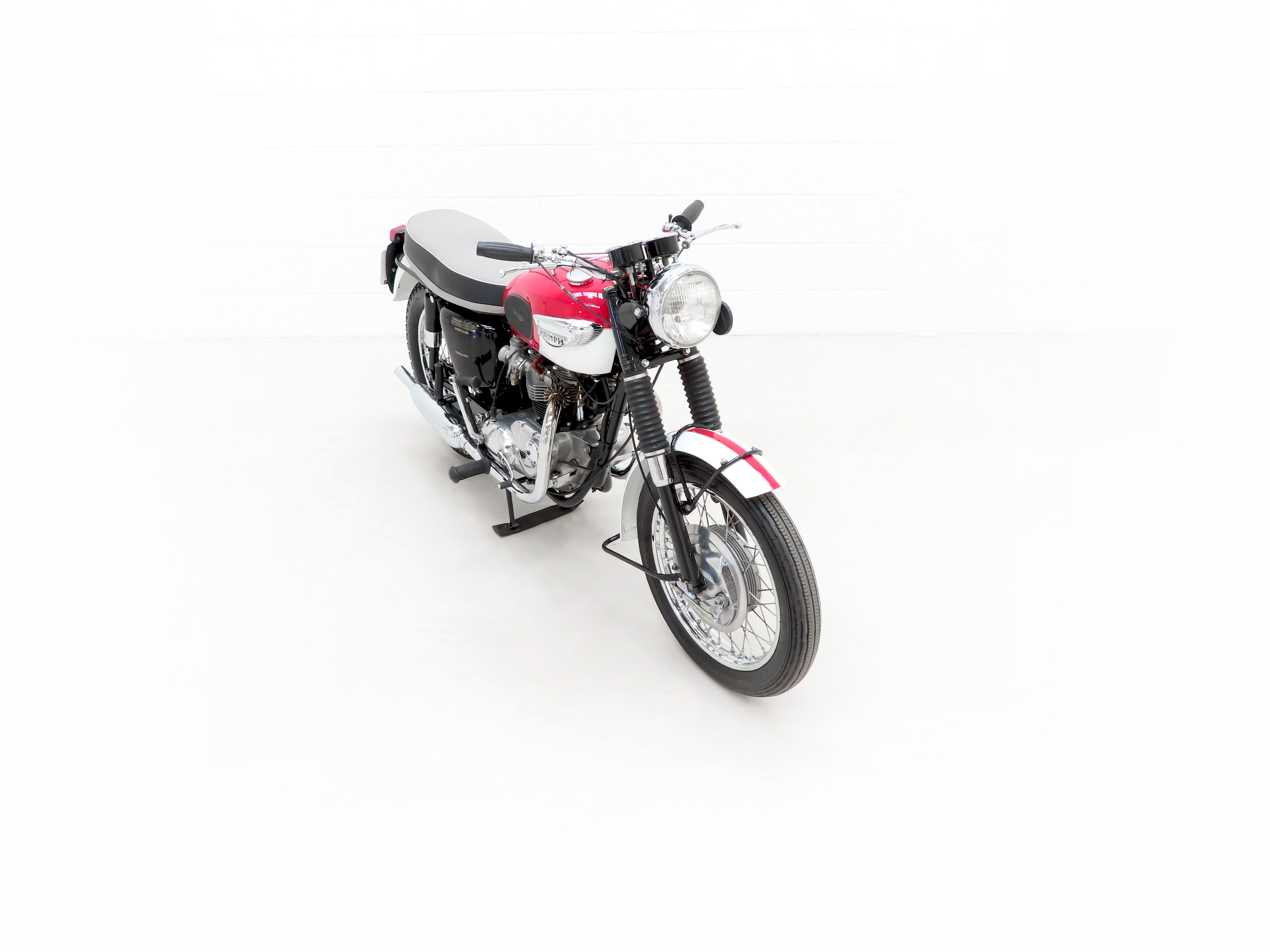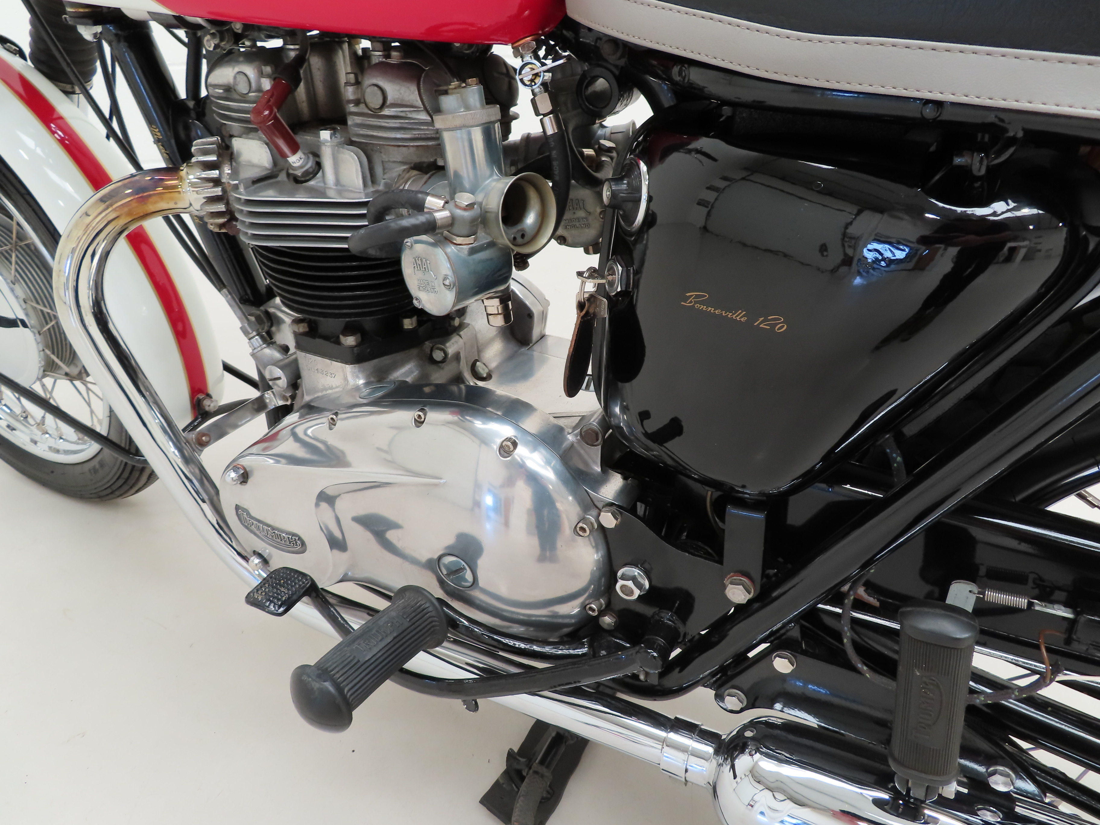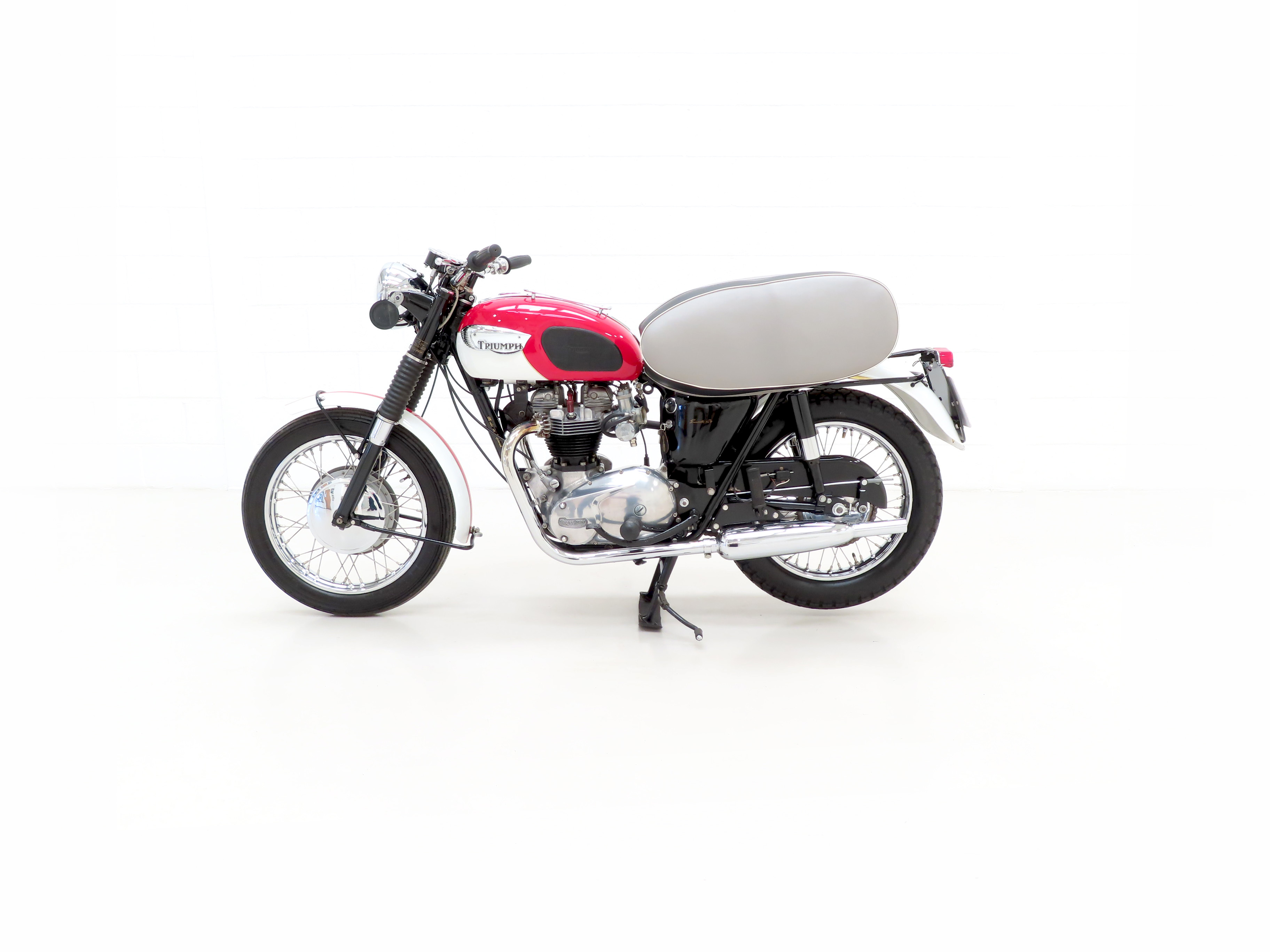Finished in the original colour scheme of Red and Ivory, this patriotic Triumph Bonneville T120 is a UK example boasting matching number credentials. The Red and Ivory paintwork gleams and the gloss Black side panels have some miniscule dings and beautiful gold lettering. The mudguards, lights, grips and genuine Triumph foot rubbers are in excellent condition as is the seat. The frame is in fine order with no visual evidence of repair work and the original stock frame number stamping is clearly legible which in turn correlates with the engine number. An iconic classic British motorcycle.