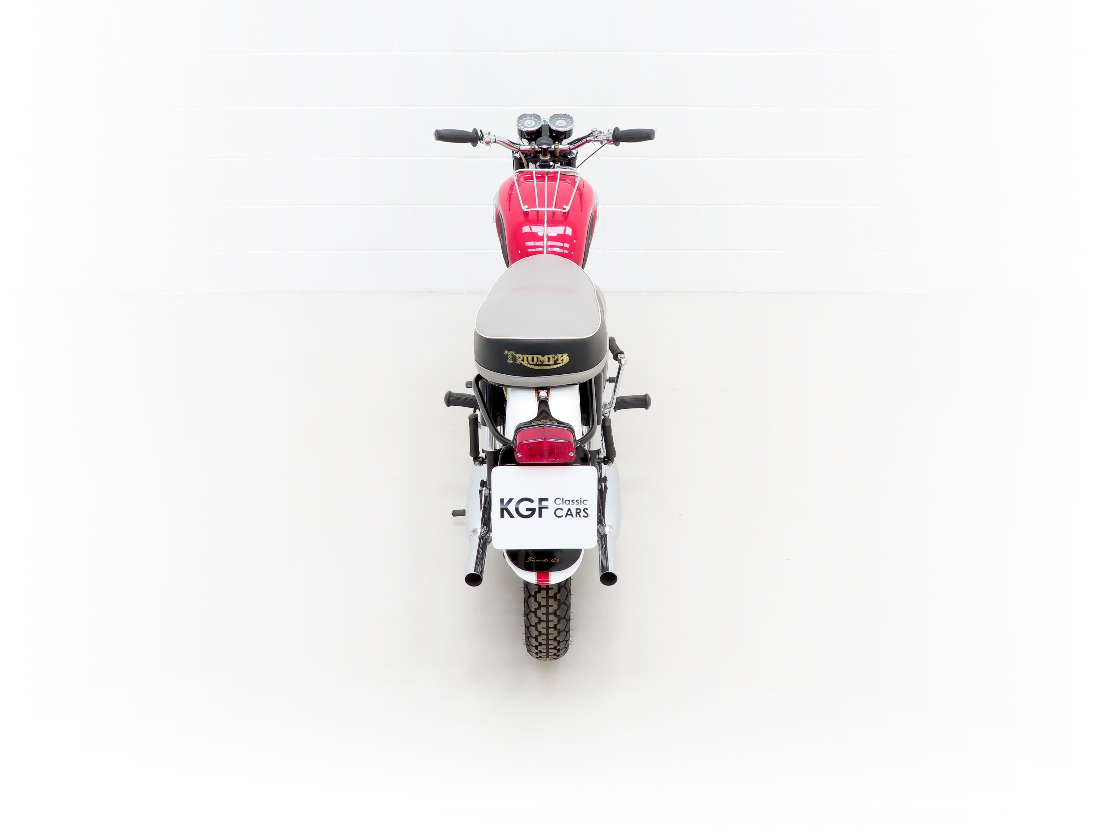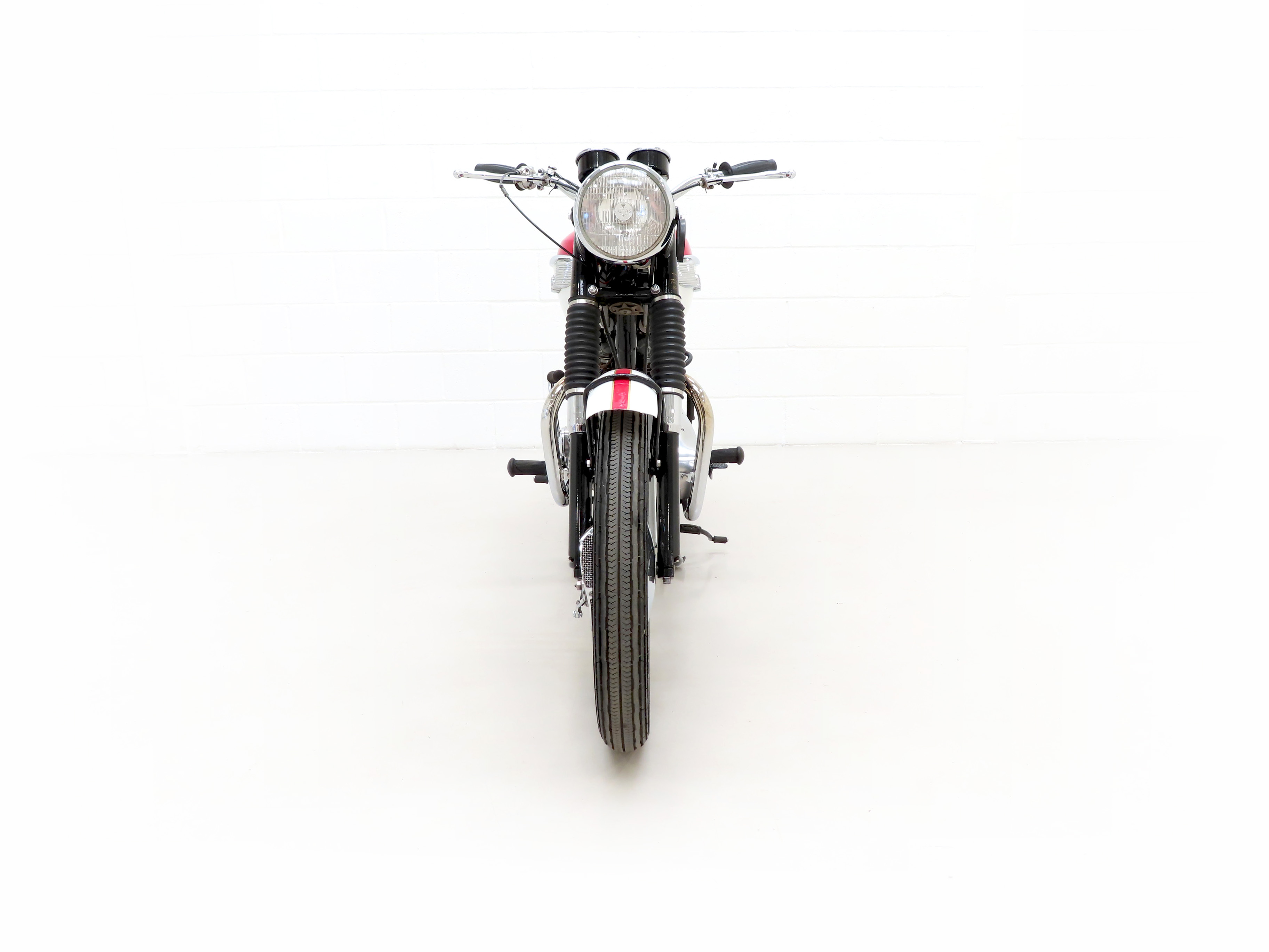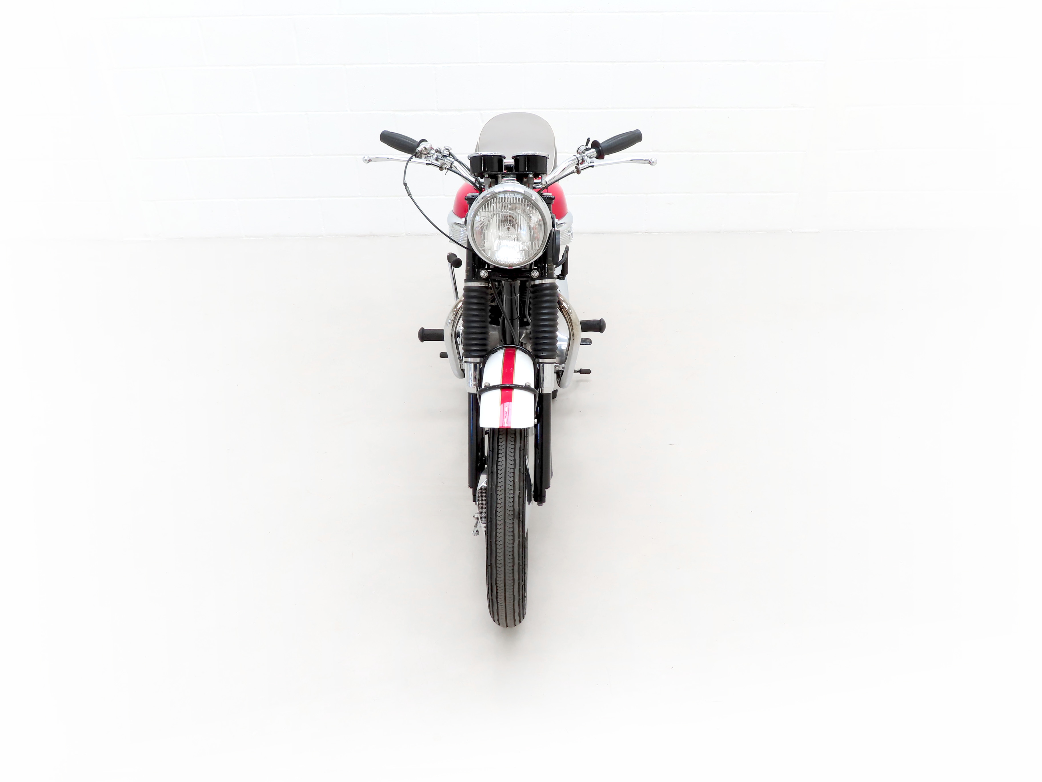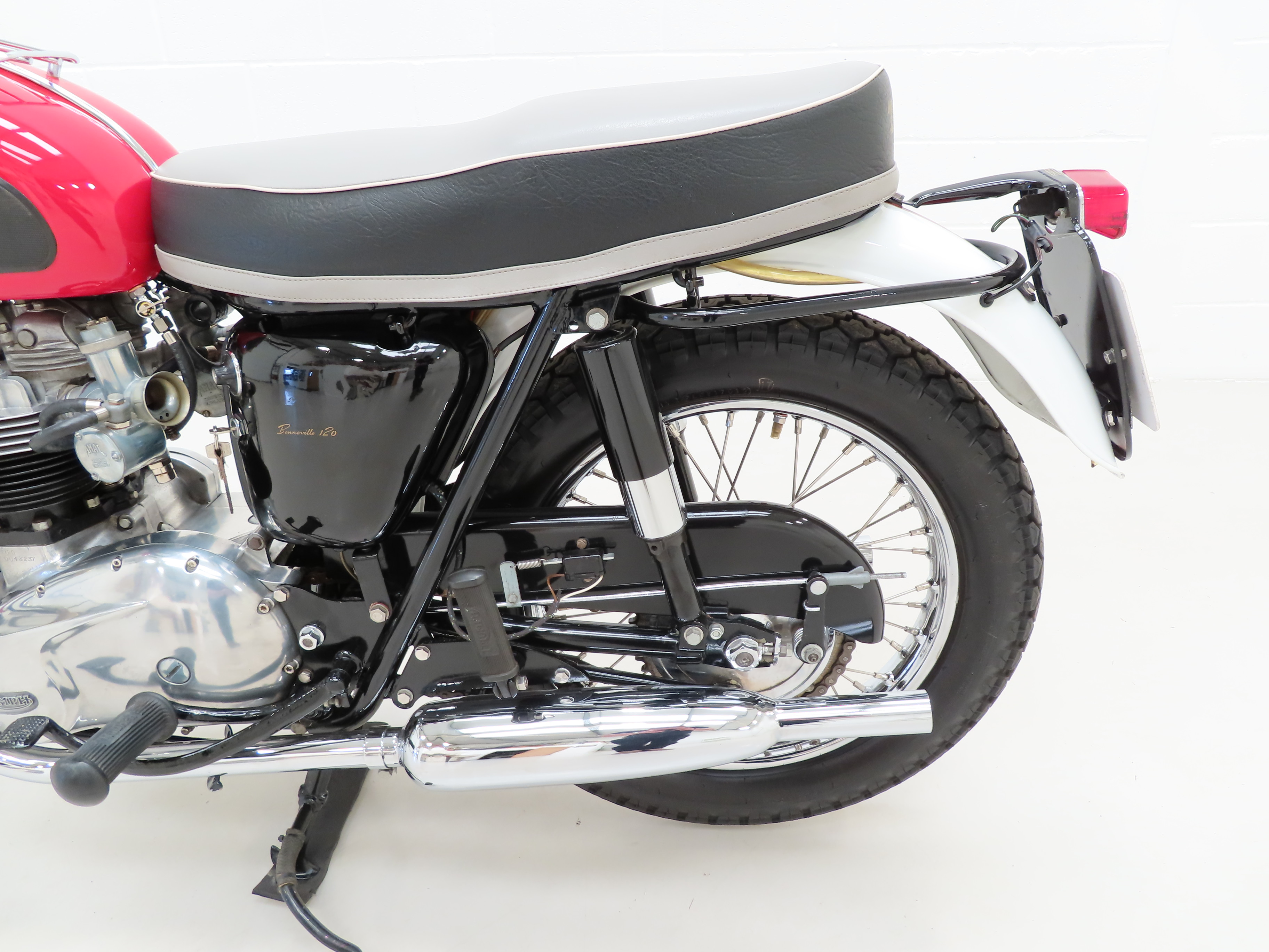 Finished in the original colour scheme of Red and Ivory, this patriotic Triumph Bonneville T120 is a UK example boasting matching number credentials. The Red and Ivory paintwork gleams and the gloss Black side panels have some miniscule dings and beautiful gold lettering. The mudguards, lights, grips and genuine Triumph foot rubbers are in excellent condition as is the seat. The frame is in fine order with no visual evidence of repair work and the original stock frame number stamping is clearly legible which in turn correlates with the engine number. An iconic classic British motorcycle.