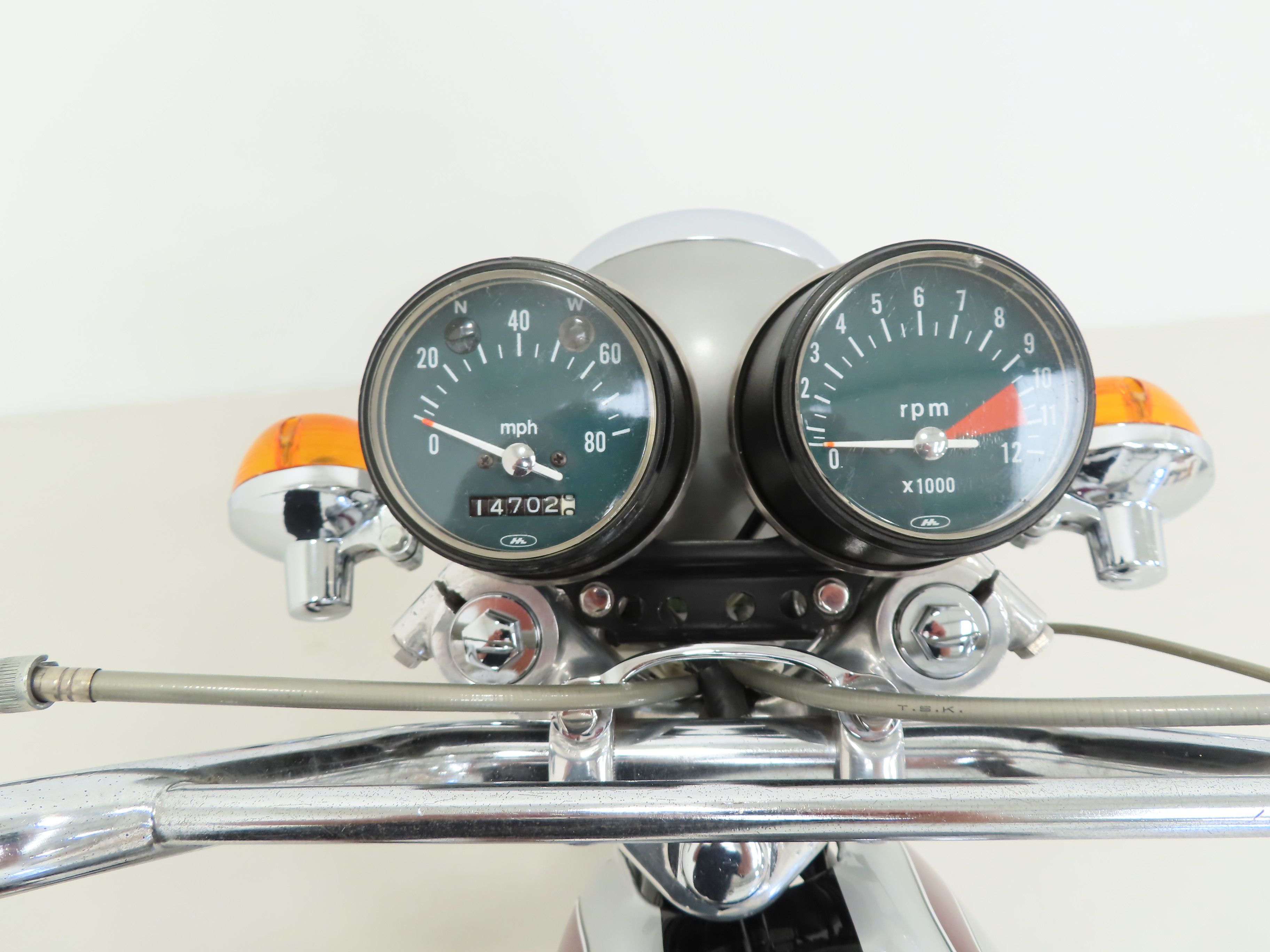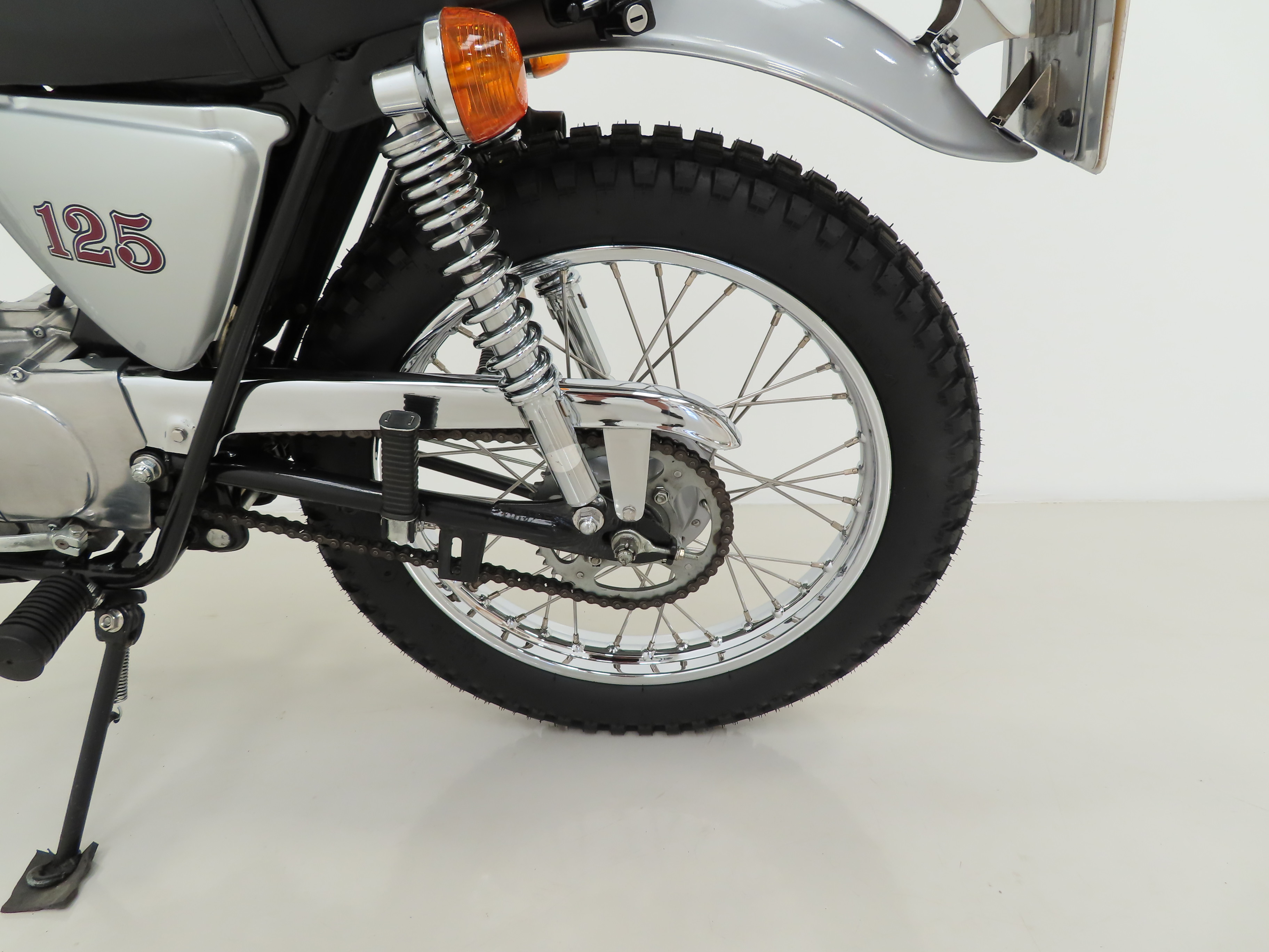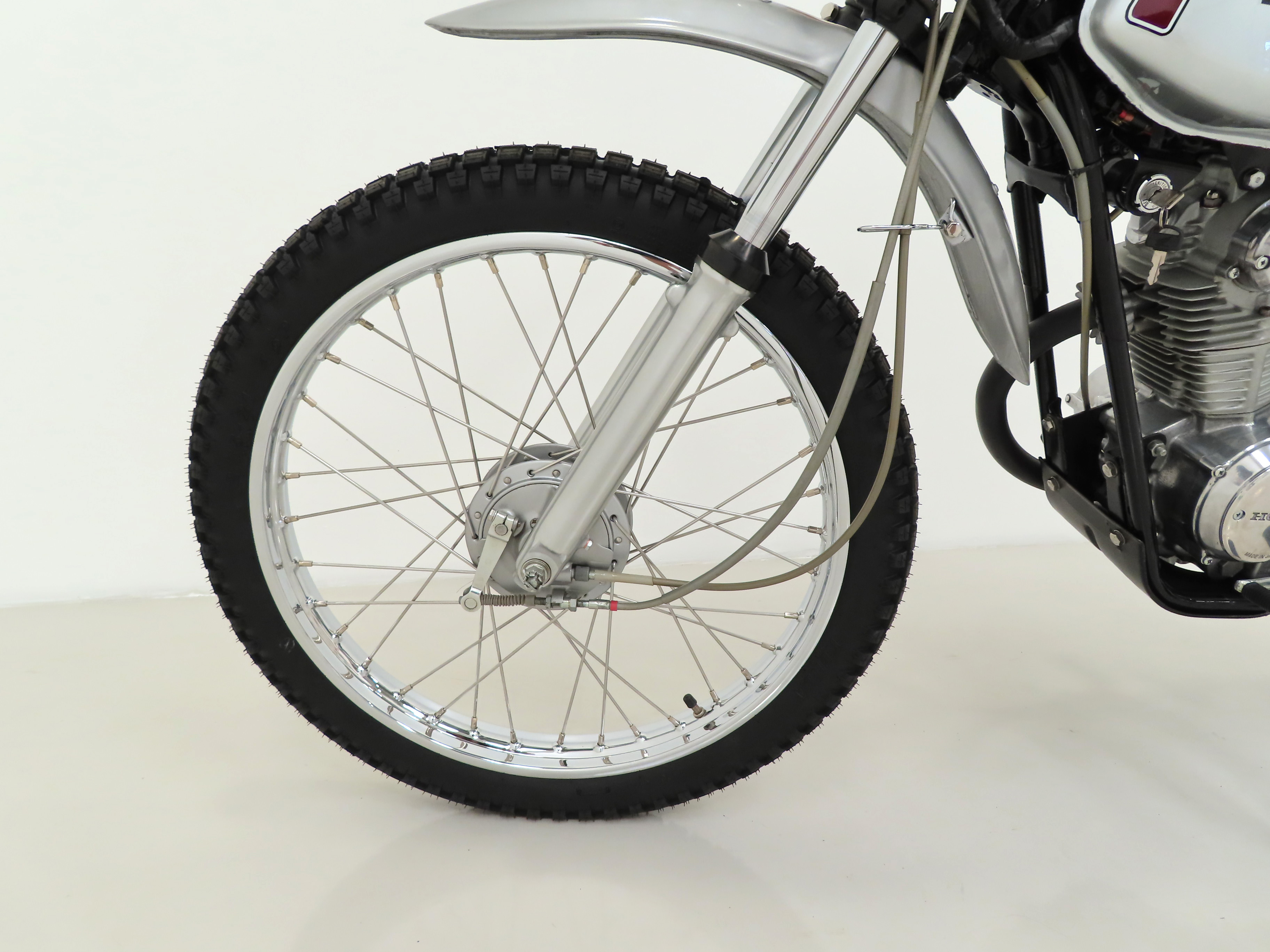 Factory spoked wheels still display an immaculate mirror chrome finish to the rims and spokes as well as pristine wheel hubs and braking components. Correctly sized 2.75-21 front and 3.50-18 rear tyres are brand new fitment in July 2023. Drum brakes front and rear provide adequate braking.