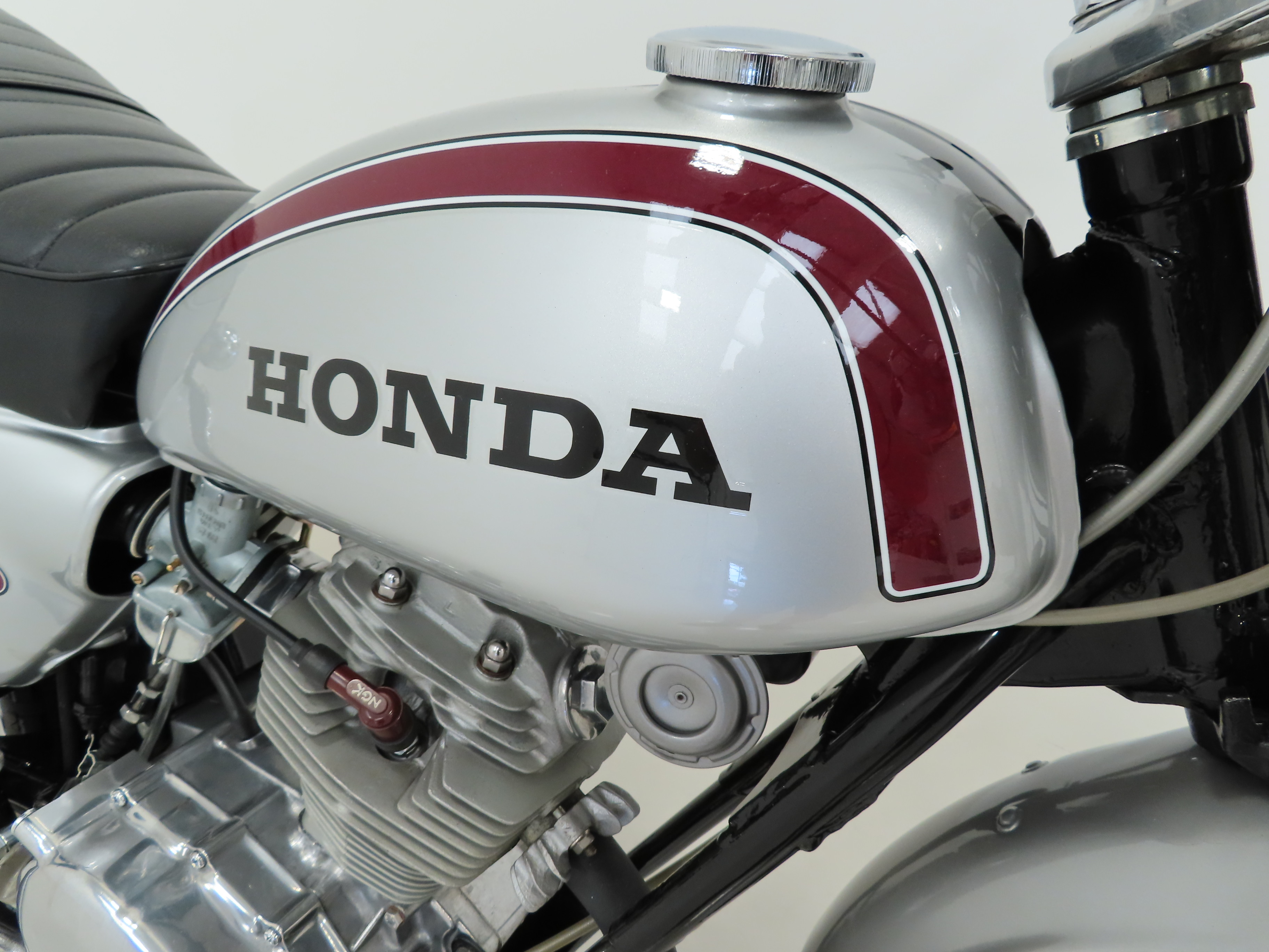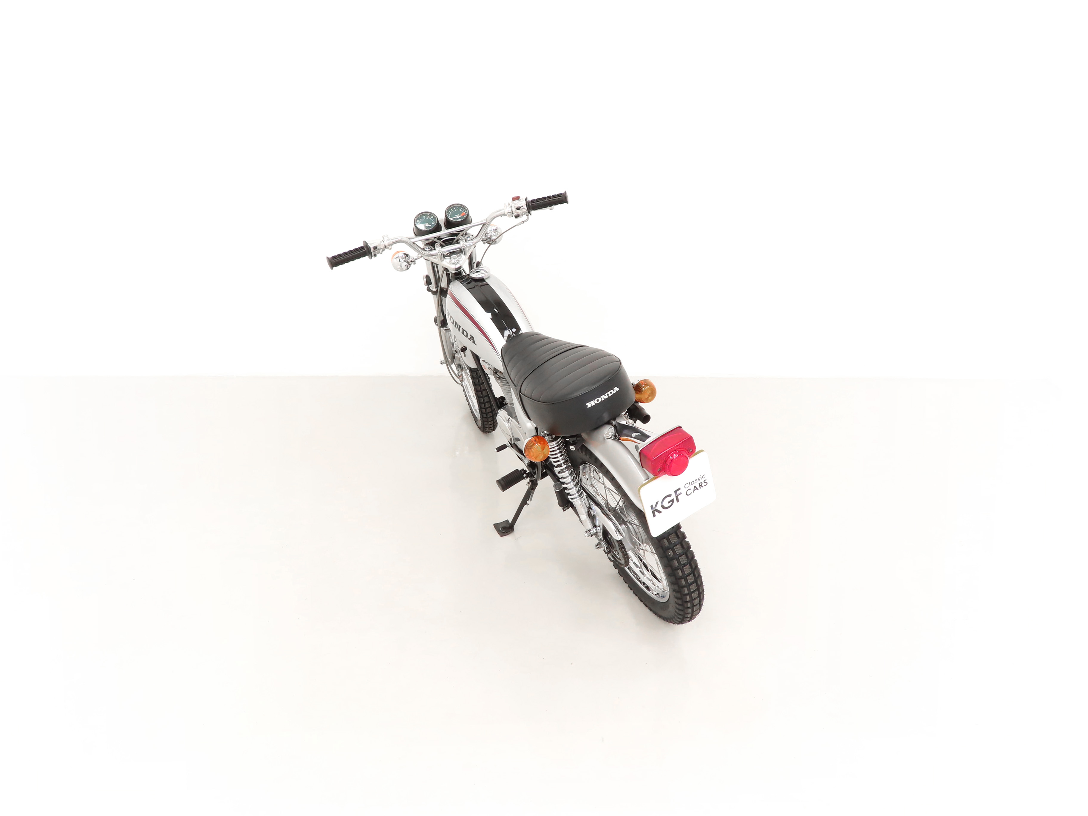 Finished in Special Silver Metallic, this iconic and collectable Street Scrambler looks incredible. The paint work has a gorgeous metallic fleck and extends to the fuel tank, side covers, headlight shell and mudguards. The material to the seat is in remarkable condition with an unbroken pillion strap and the Honda logo in white still vibrant. The double cradle pipe frame has a hardened black gloss finish with no damage and the frame number is visible. The edge tip to the front mudguard has a small mark. The correct Stanley headlamp remains fitted and all lighting and instrumentation is operational with the headlamp bowl still having the part number stamp. Wonderful in every respect.