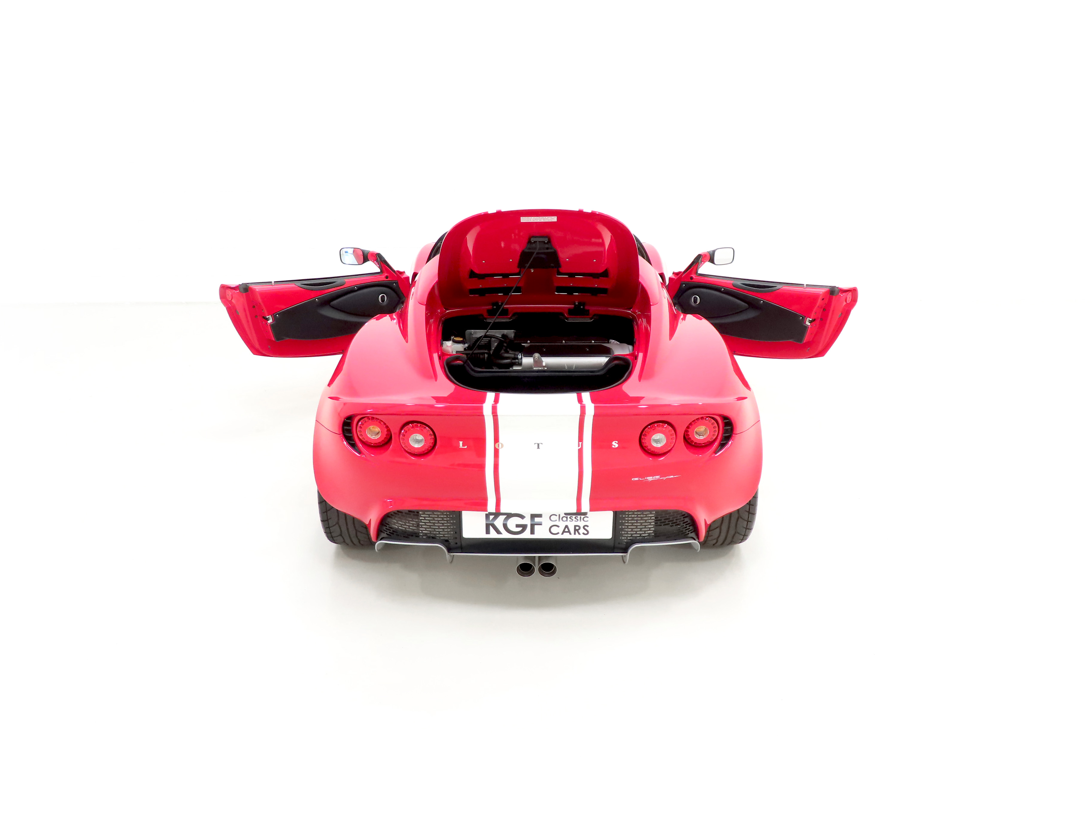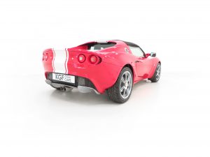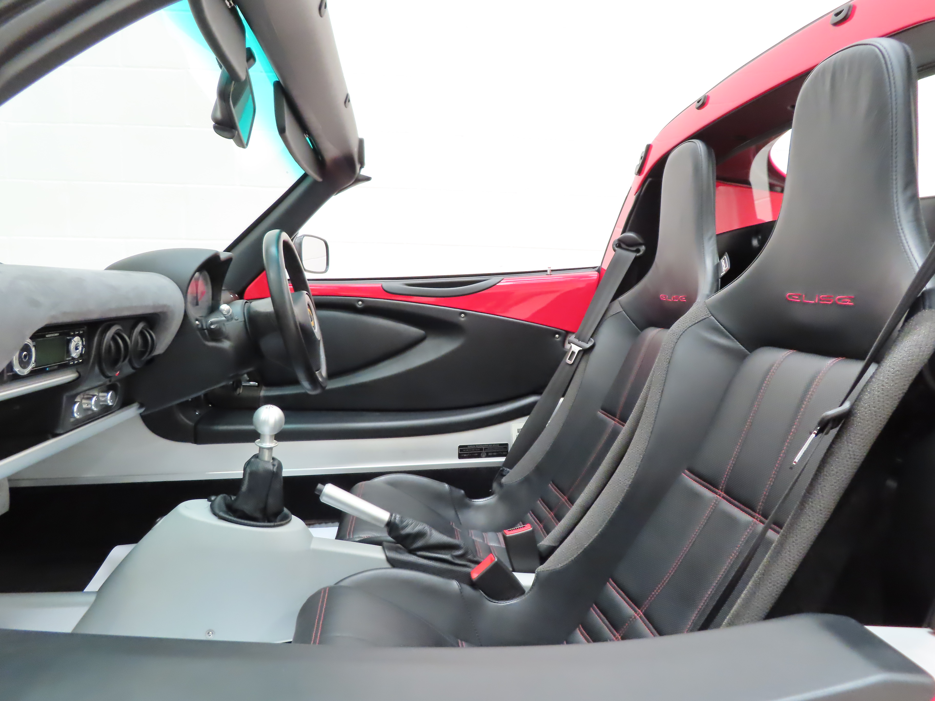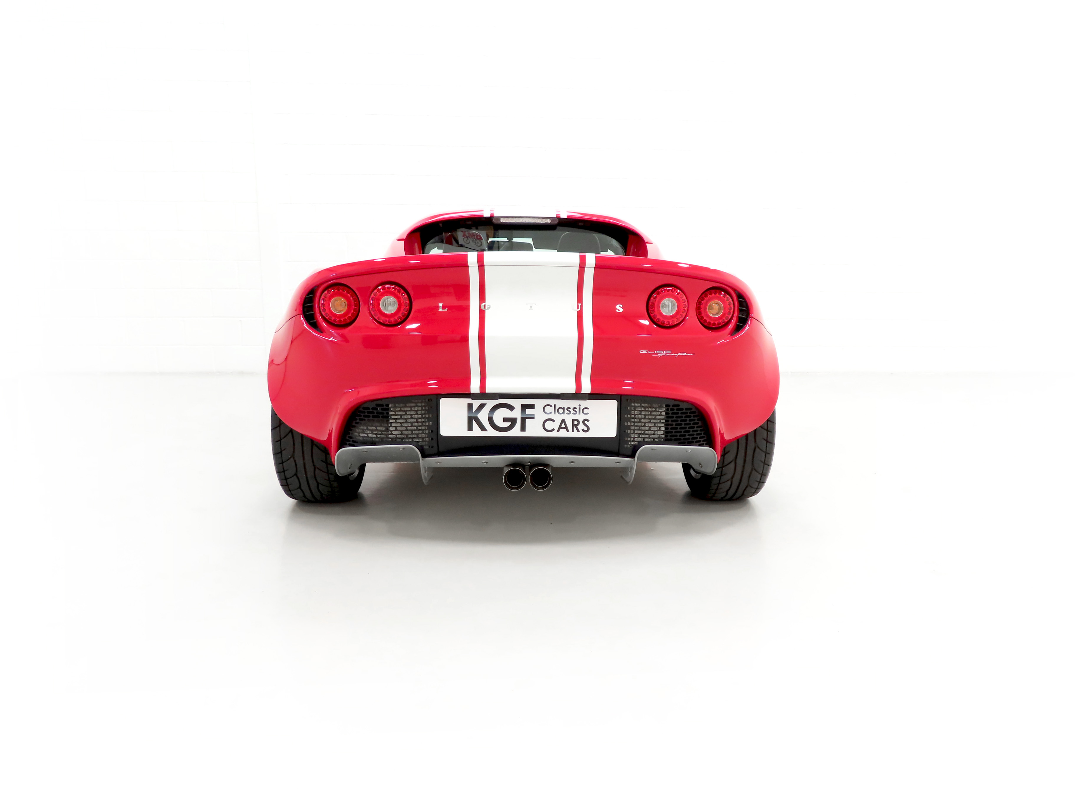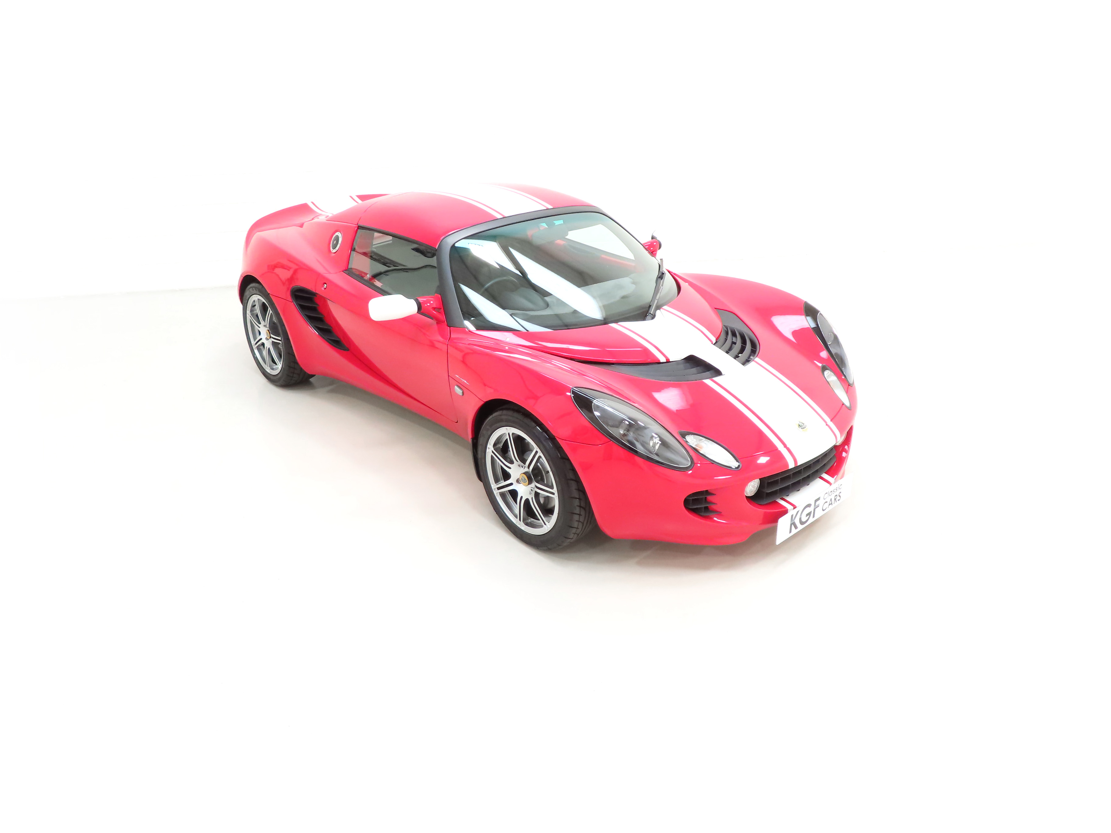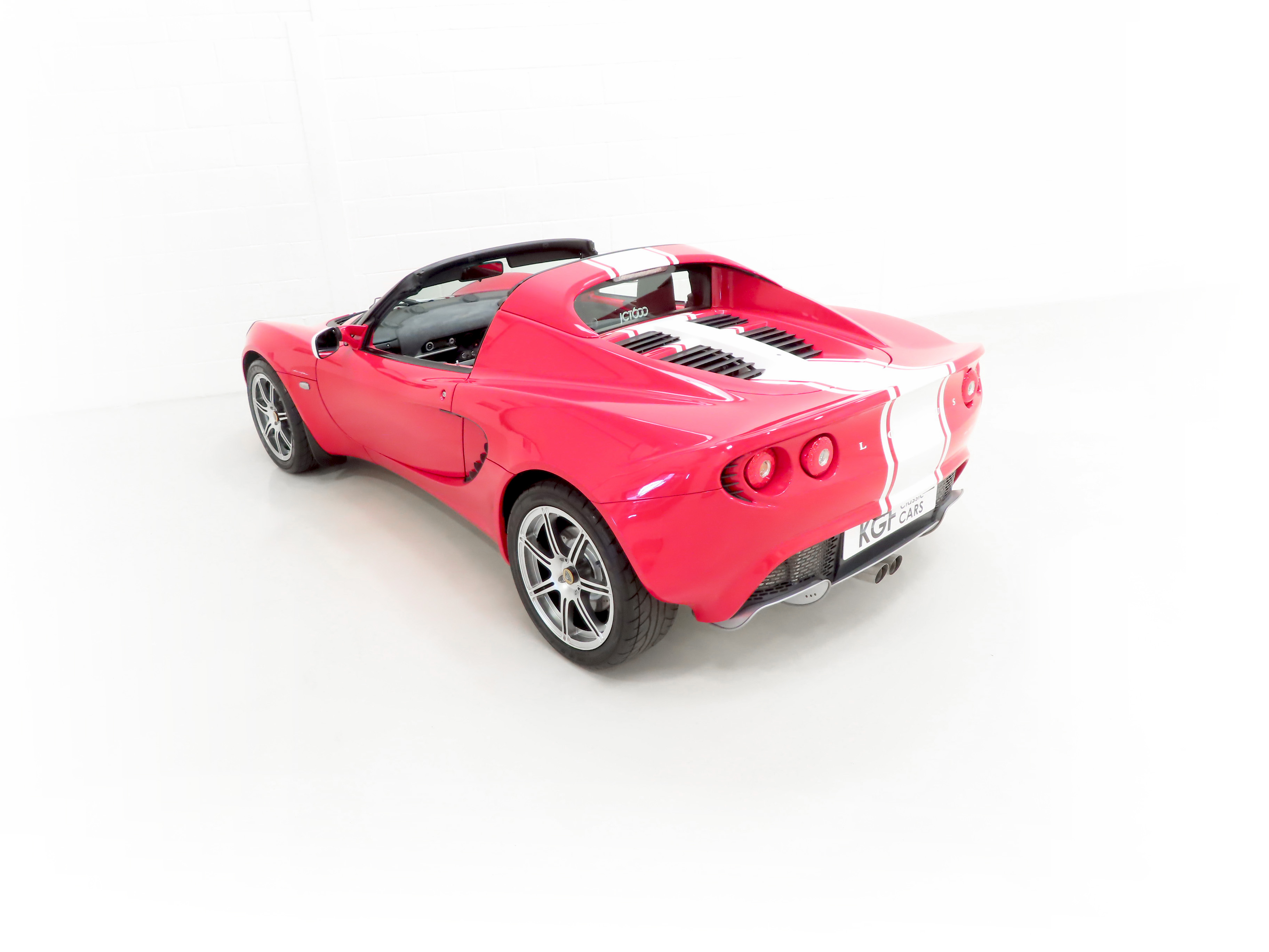 Ultra-light extruded aluminium bonded construction chassis with lightweight steel rear subframe, anodised silver diffuser, detachable clamshells, LED rear lights, auxiliary front driving lamps, integral roll over hoop, passenger footrest, polished aluminium handbrake sleeve, heater knobs and gear-knob, electric windows. Sports Racer Specification; Numbered plaque, Special Ardent Red solid paint with single white painted stripe flanked by two thinner stripes, Sports Racer decals, white wing mirrors, hardtop, black leather with red stitching, Elise logo stitched in headrest, Sport Pack comprising of; Lotus Traction Control (TCS) system, Bilstein sports dampers, twin oil coolers, forged alloy wheels, ProBax sports seats. Touring Pack; Leather door panels, perforated leather door inserts, leather trimmed centre console, handbrake gaiter, black carpet mats, upgraded stereo. Factory Options; Air conditioning. Dealer Accessories; Lotus sports exhaust, hardtop stowage bag, dust car cover, airflow battery conditioner, alloy steering control stalks, Tracker.