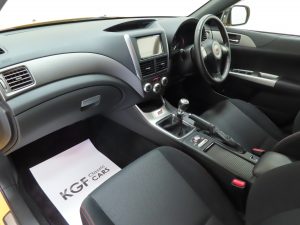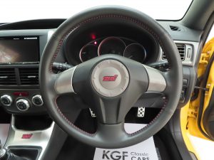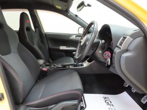 STI branded sports bucket front seats with red stitching are in excellent clean condition with no notable wear. Matching door cards are immaculate as is the black headlining. The dashboard and switchgear are unmolested as is the leather steering wheel with fully intact red stitching. All functions, controls and gauges operate perfectly including the ice-cold air conditioning. Lifting the boot lid reveals an immaculate boot carpet as well as the Subaru tool pouch, tyre change compressor and inter-cooler water spray bottle. UK specification DAB and touch screen navigation has been professionally installed.